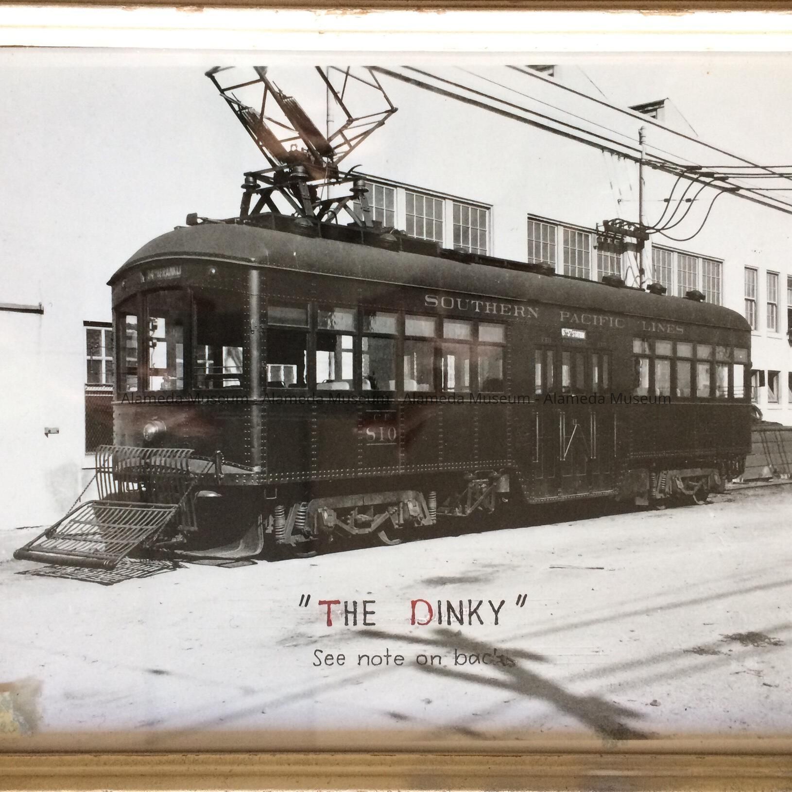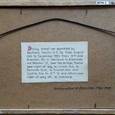 History of Object: Dinky street car operated by Southern Pacific Railroad Company, from August, 1913 to December, 1923, from 14th and Franklin Streets in Oakland to Alameda via Webster Street, over the bridge, thence over the right of way to Lincoln Avenue to Fernside Boulevard to Encinal Avenue and Central Avenue to 8th Street and retum over the right of way, et cetera, to Oakland.