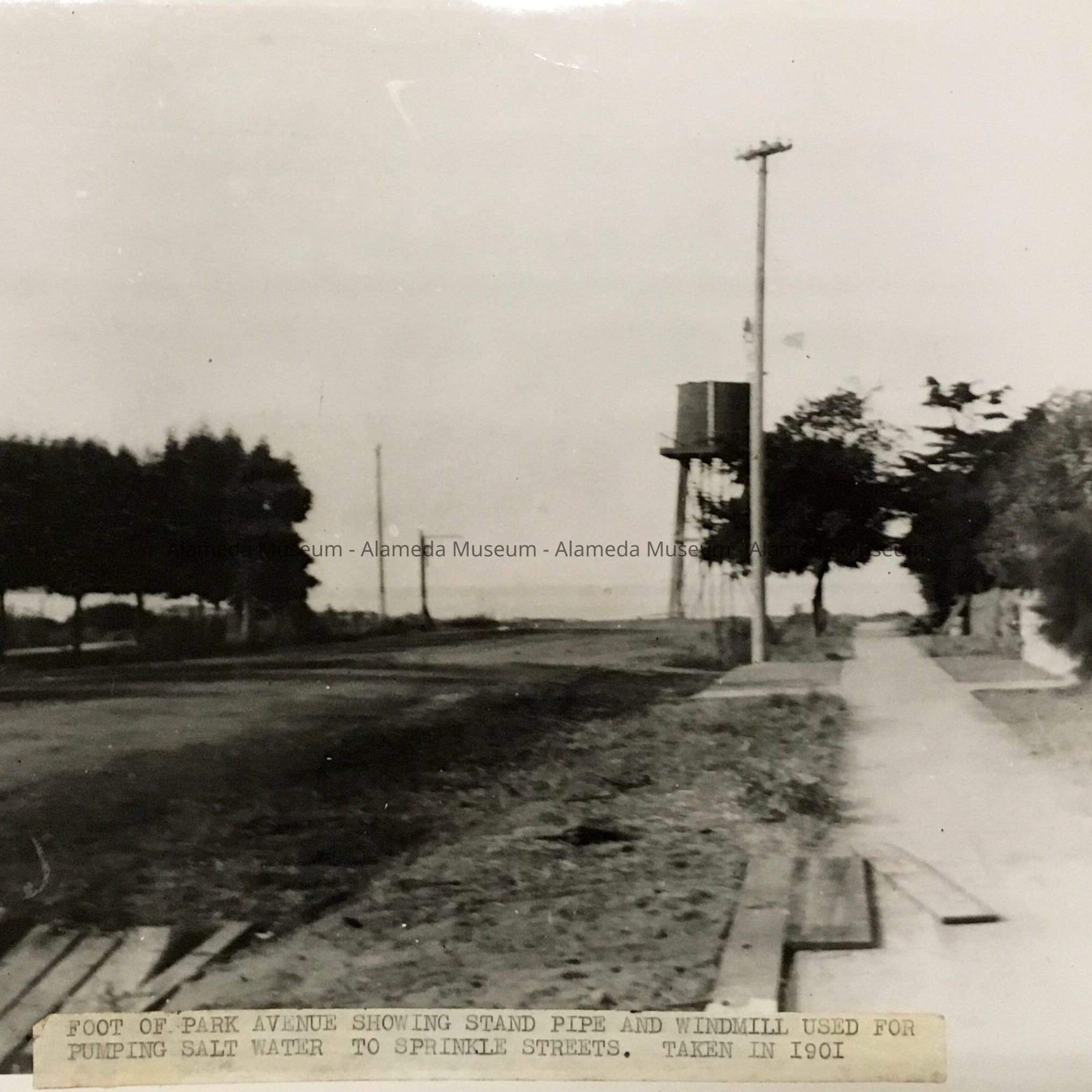 History of Object: The foot of Park Street showing the standpipe and the windmill used for pumping salt water to sprinkle the streets.