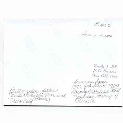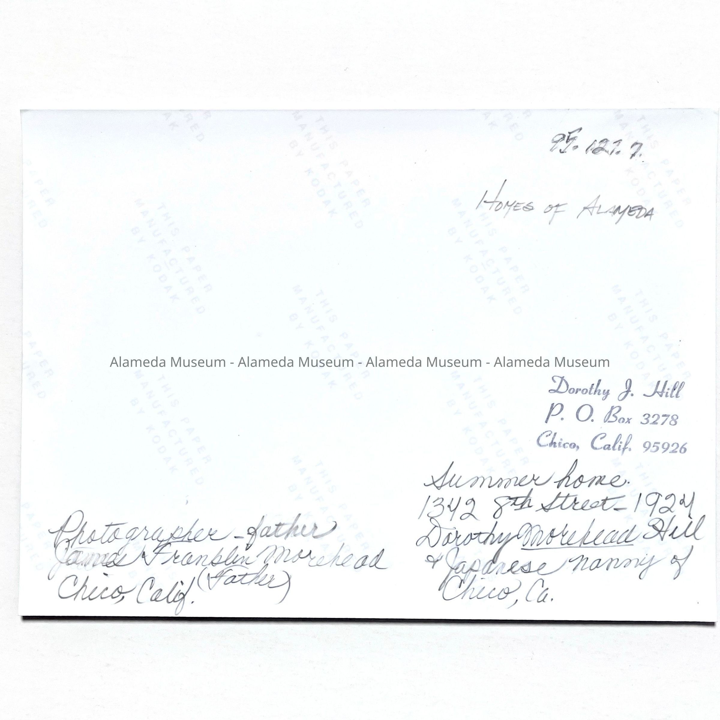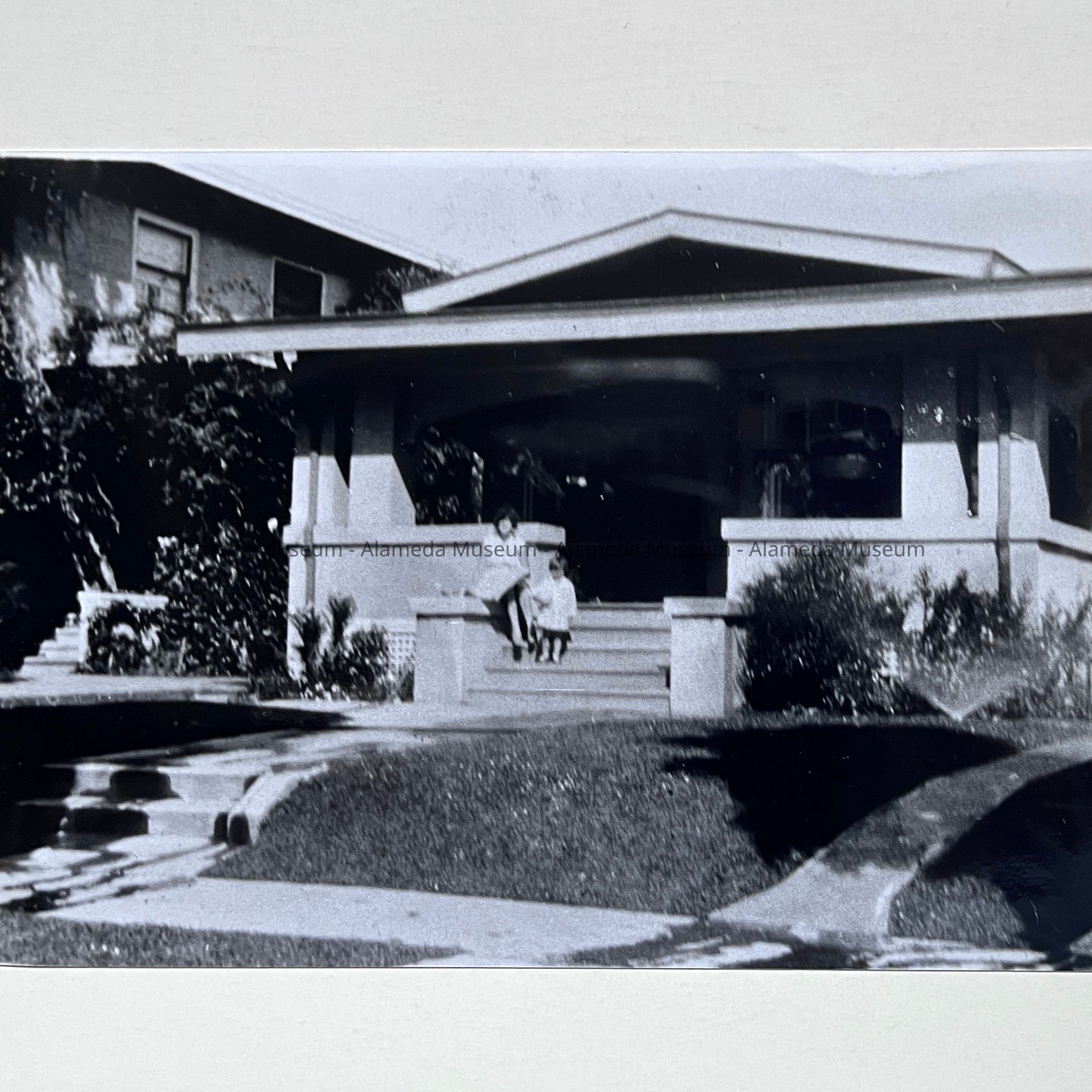 History of Object: Street view of a house at 1342 8th Street, the summer home of the J. F. Morehead family of Chico. The donor (Dorothy Morehead Hill) and her Japanese nanny are posing on the front steps.