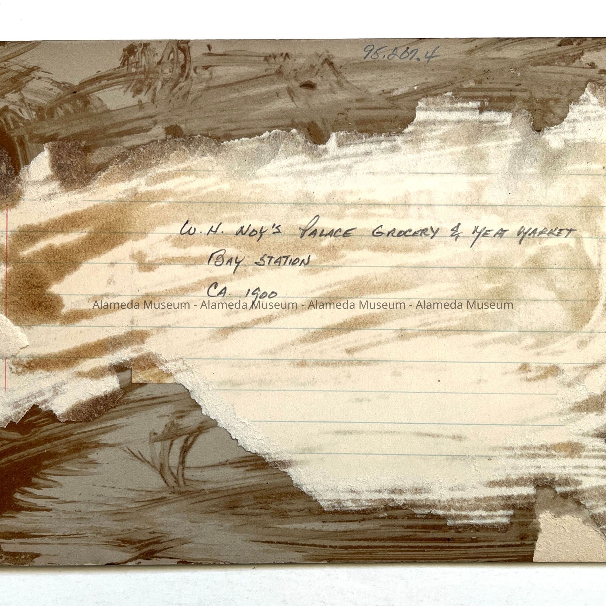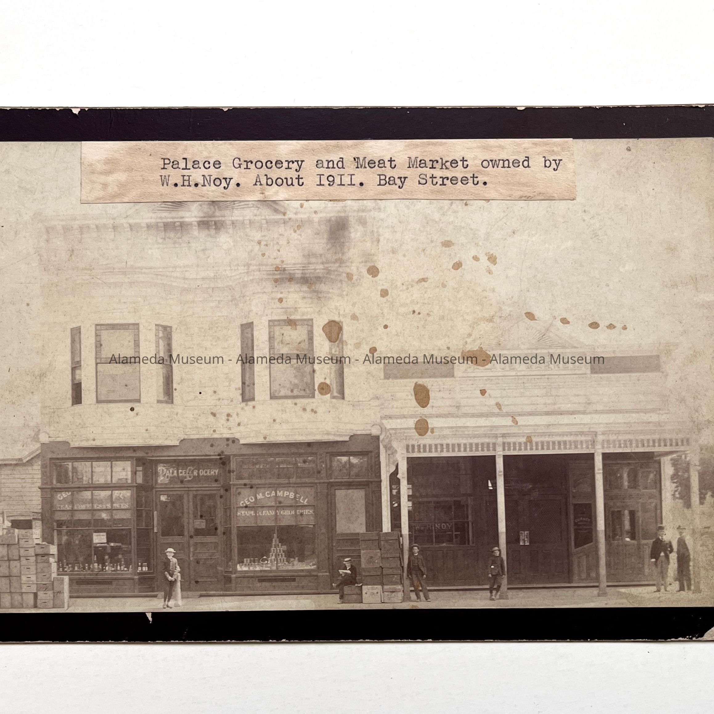 History of Object: Street view of the adjacent grocery store and meat market businesses owned by Mayor W. H. Noy, located in the Bay Station district. Wooden boxes of merchandise are stacked on sidewalk in front of the grocery store.
