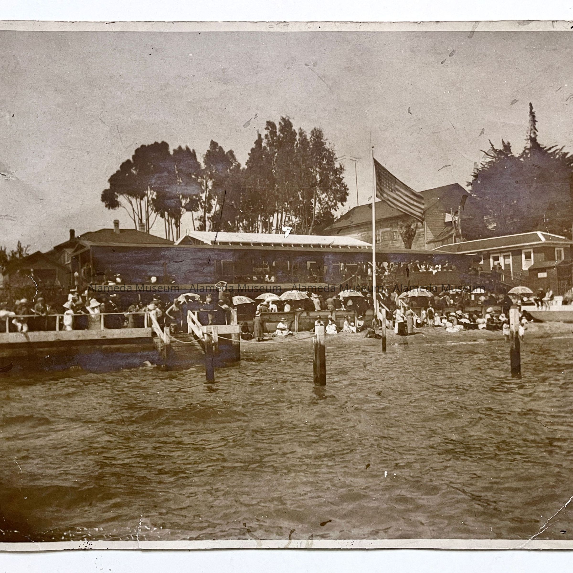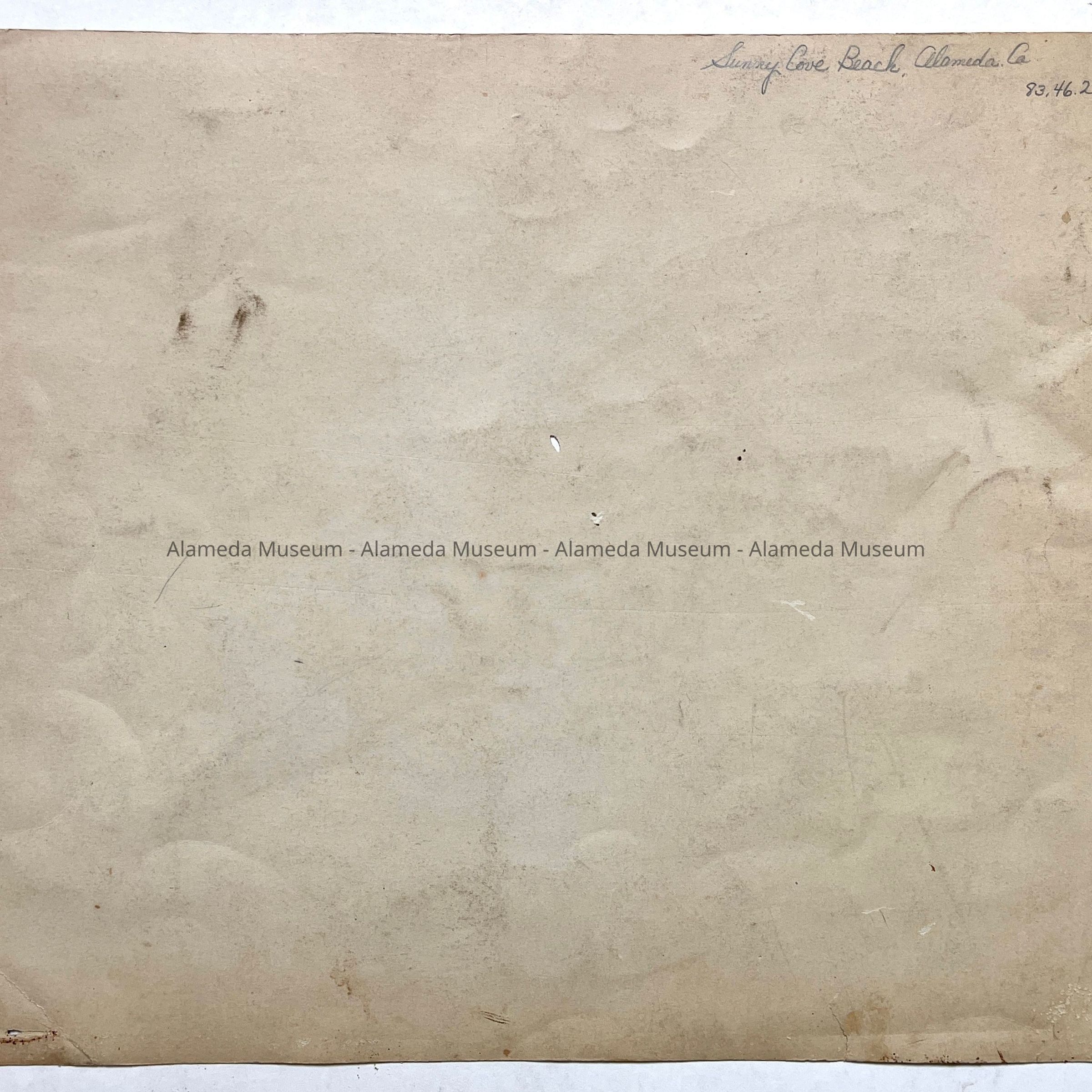 History of Object: Photograph of Sunny Cove Beach (before the swimming pool was constructed in 1917), Alameda, Ca., circa 1915. The beach was founded in Alameda in 1881, by the Dietz sisters, and later run by their nephew, George H. and his wife, Bertha Masters.