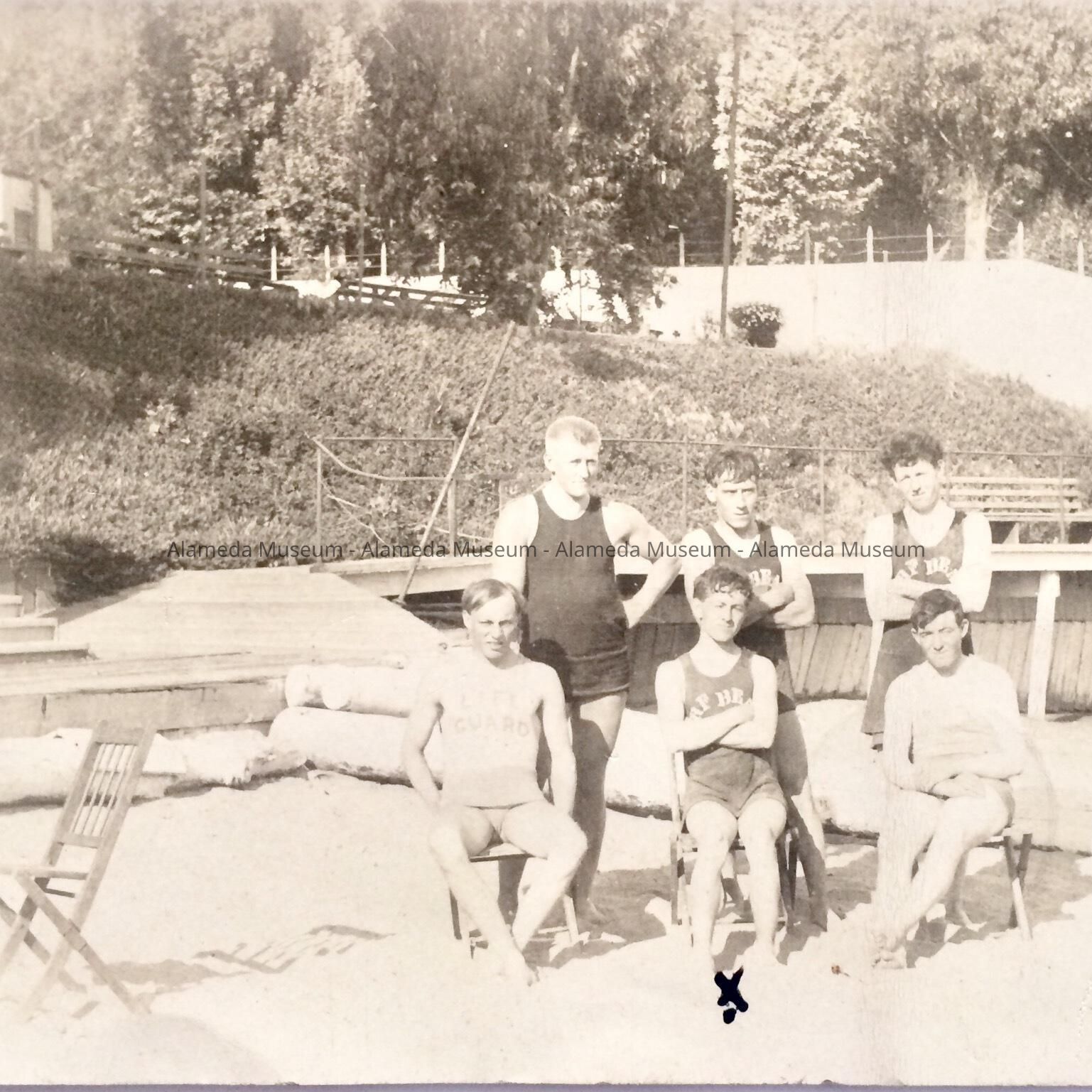 HISTORY OF OBJECT: PHOTOGRAPH TAKEN AT SURF BEACH OF SIX MEN. ONE IDENTIFIED WITH AN X AS CHARLES HUSING (WHOSE FATHER RAN A SHOOTING GALLERY AT SURF BEACH. THEY ARE WEARING SWIMMING SUITS PROVIDED BY THE BEACH, FOR THEY HAVE SURF BEACH WRITTEN ON THE CHEST OF THE BATHING COSTUME.