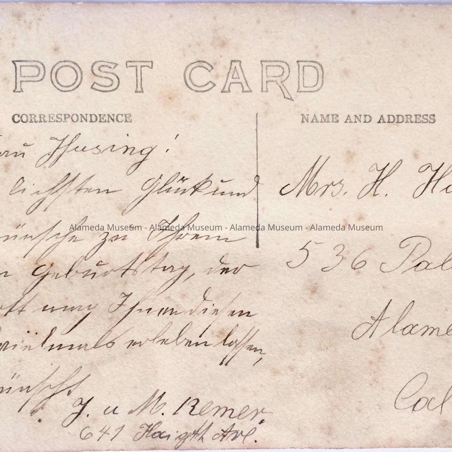 DESCRIPTION: PHOTOGRAPHIC POST CARD, SEPIA. ON THE REVERSE: ADDRESSED TO MRS. H, HUSING, 536 PALACE COURT, ALAMEDA,