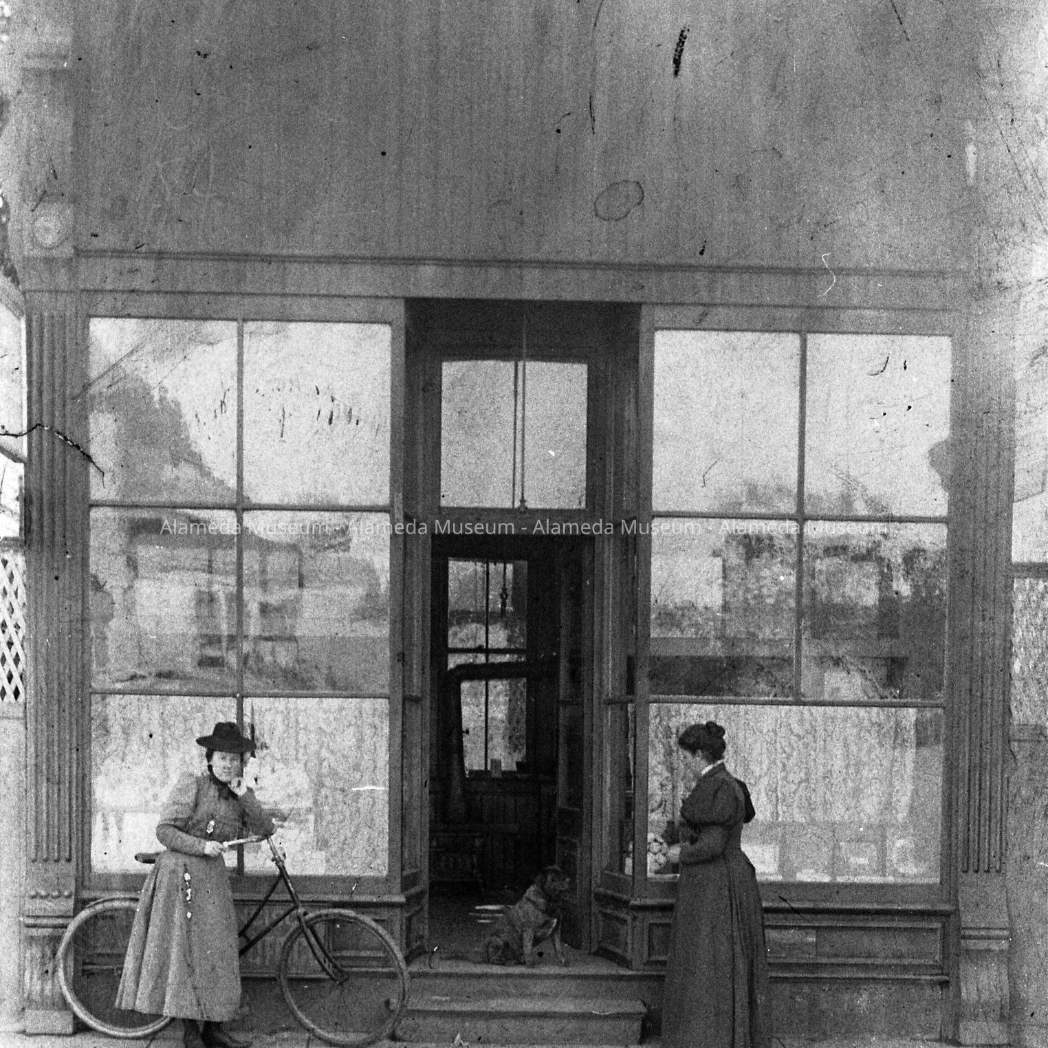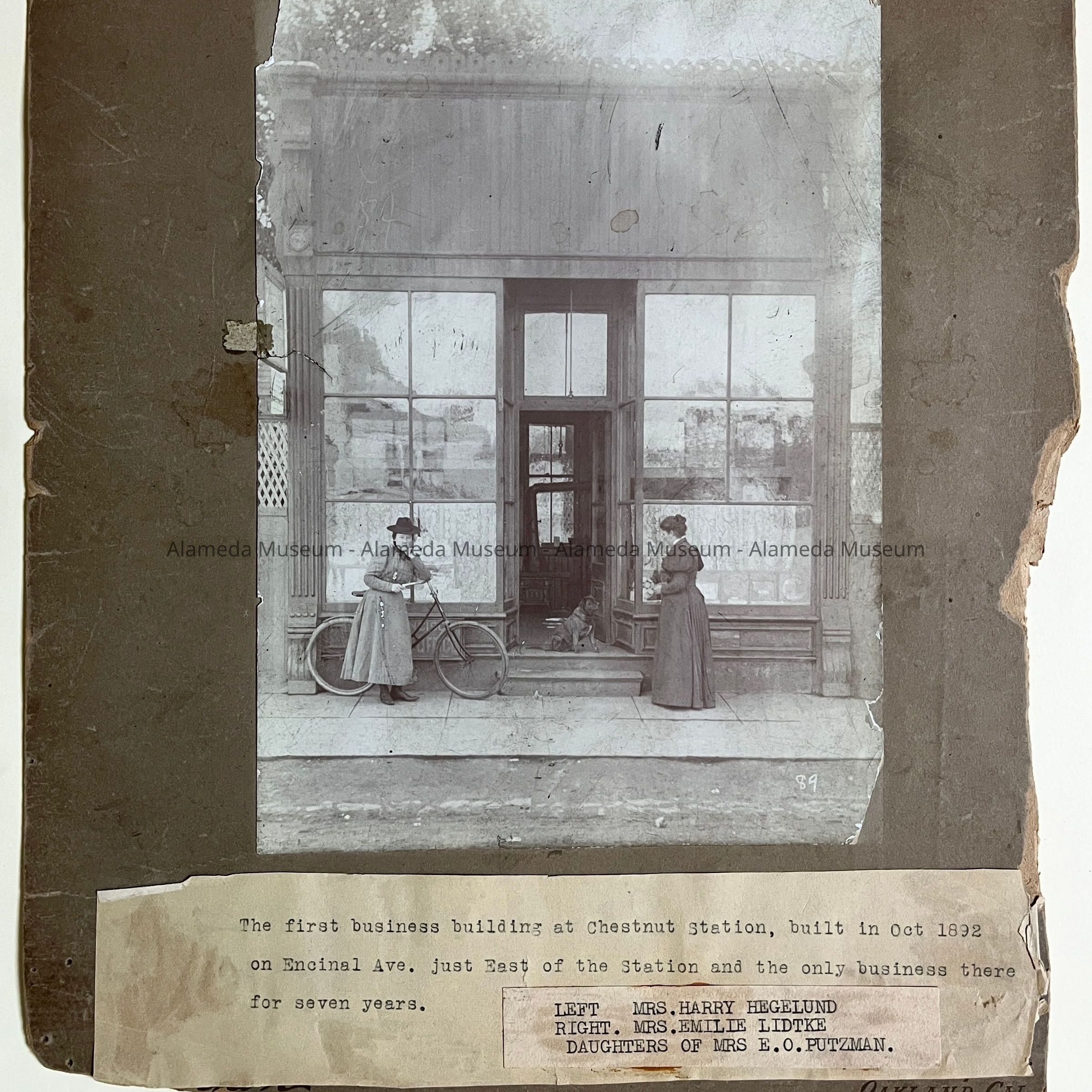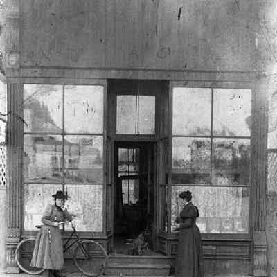 History of Object: View of two women posed at entrance to an unidentifiable business, said to be the first Chestnut Station business, and the sole one for 7 years, starting in 1892. The woman shown at left with bicycle is Mrs. Harry Hegelund; woman at right is Mrs. Emilie Lidtke - both were daughters of Mrs. E. O. Putzman.