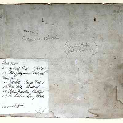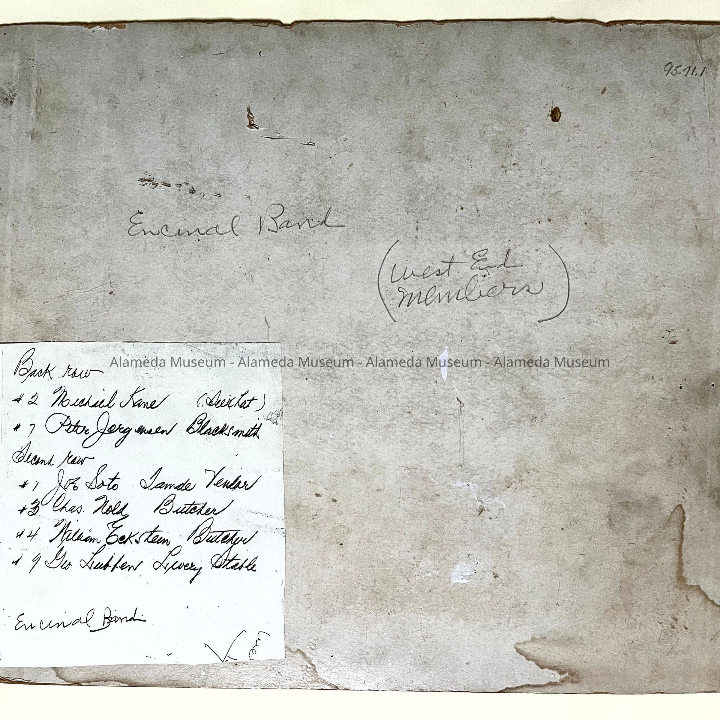 History of Object: Uniformed members of the Encinal Band gathered outdoors in a park. Several band members are identified on a list appended to verso.