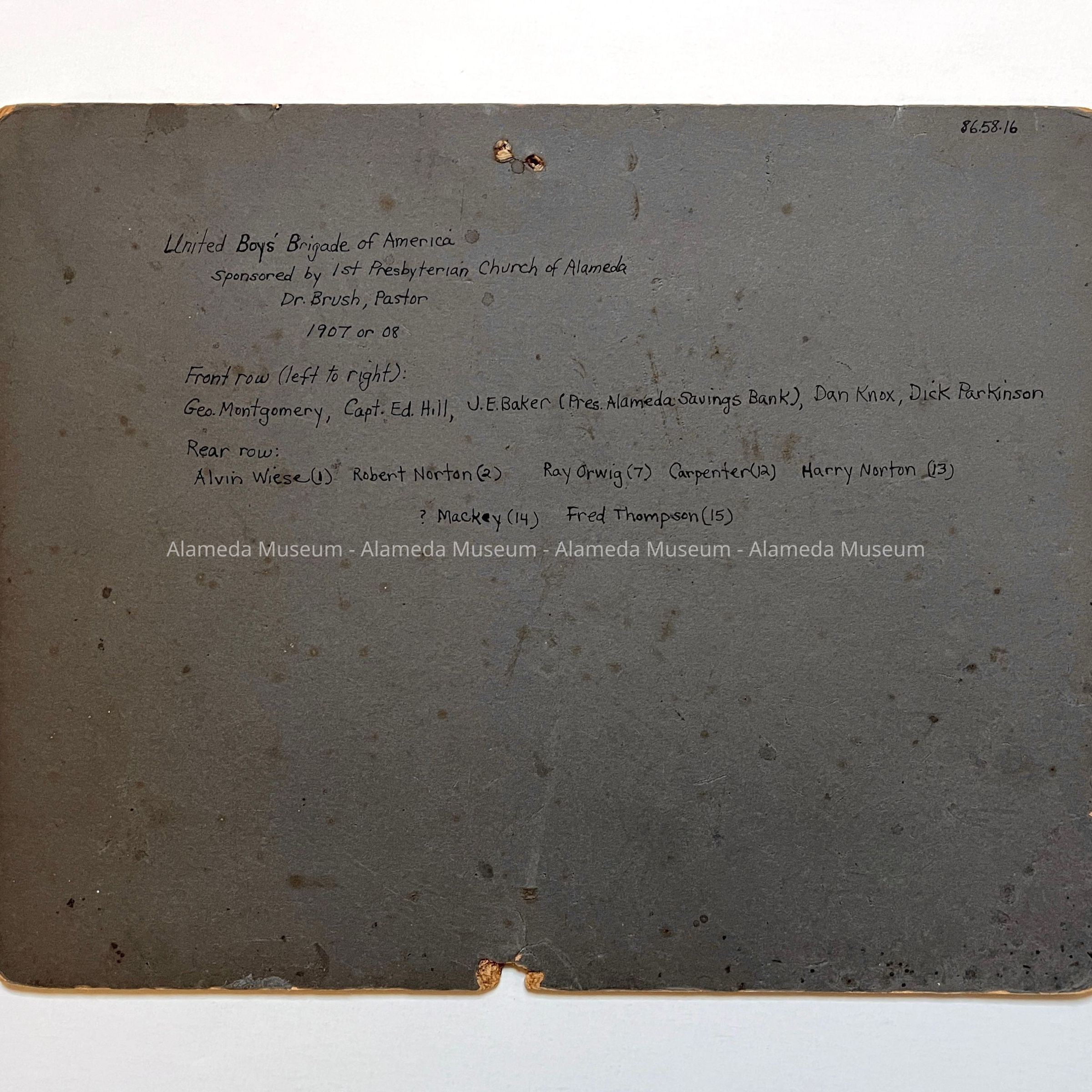 Photo of the United Boys' Brigade of America, sponsored by the 1st Presbyterian Church of Alameda, Dr. Brush, Pastor.