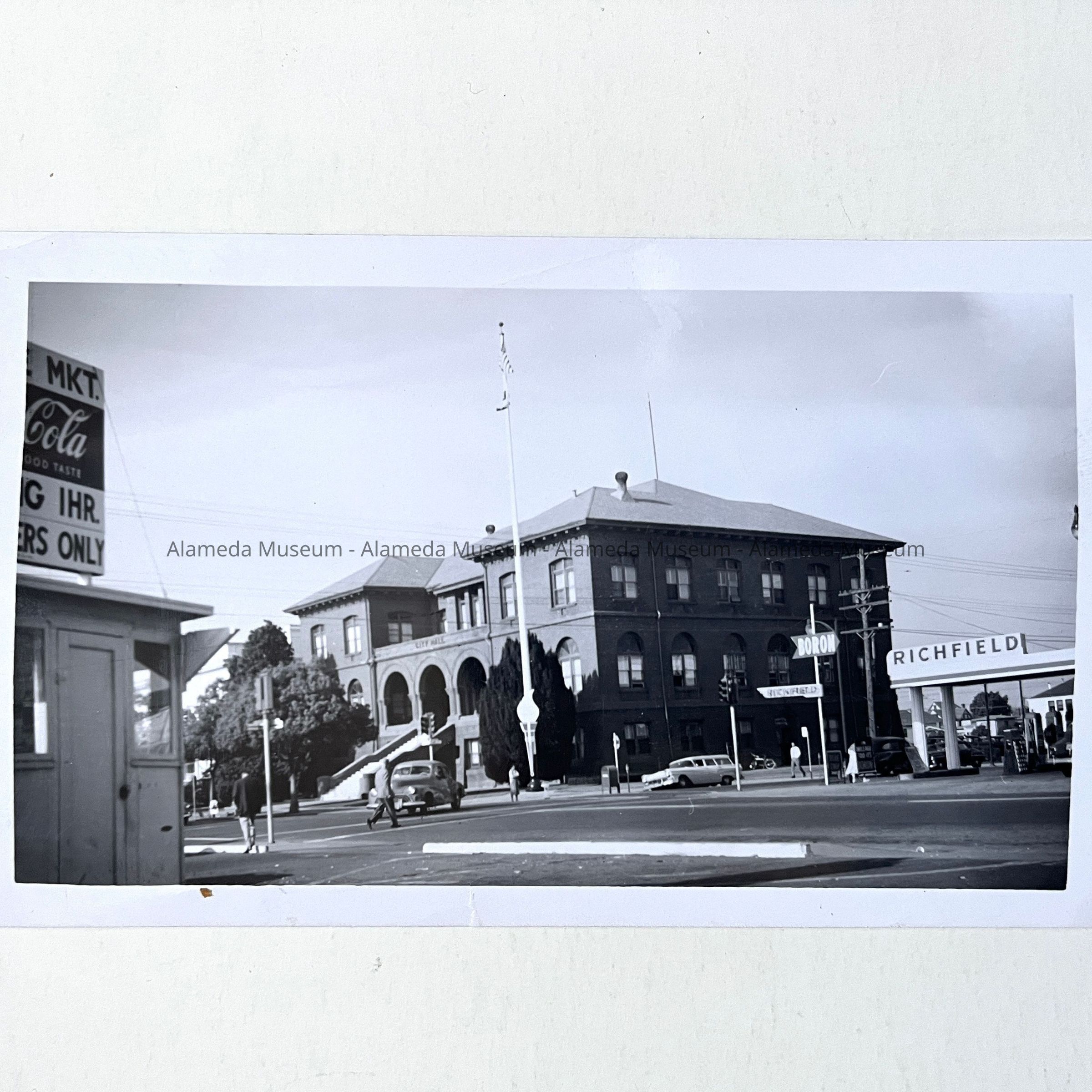 History of Object: View of the City Hall from the parking lot cater-cornered at present day Longs Drug Store. View shows also the Richfield Service Station across Oak Street from the City Hall.