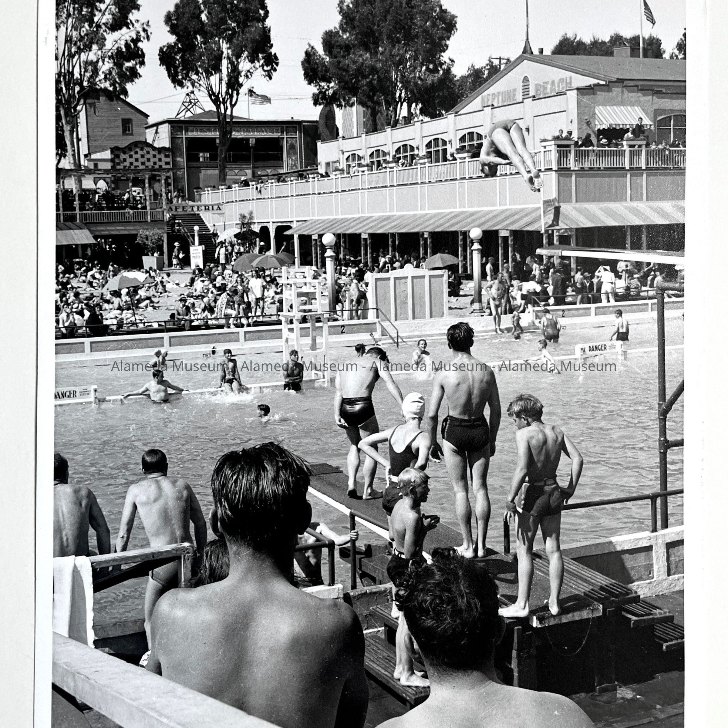 History of Object: View of the large swimming pool showing youths on diving board and a crowd of people across the pool in the background.