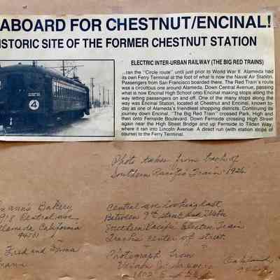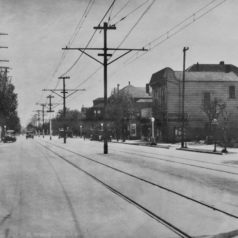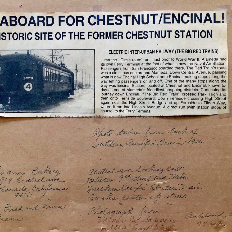 History of Object: Street view of Hofmann's Bakery, 918 Central Ave., Alameda, owners Fred and Irma Hofmann, dated 1926. Photo taken by Vernon Sappers from the back of a Southern Pacific train. The view is looking east between 9th and Weber streets. Note the SP tracks in the center of the street. Hofmann's Bakery is the 2-story building at right. Verso of the photo had a print out includes a clipping or print of a red train and its route.