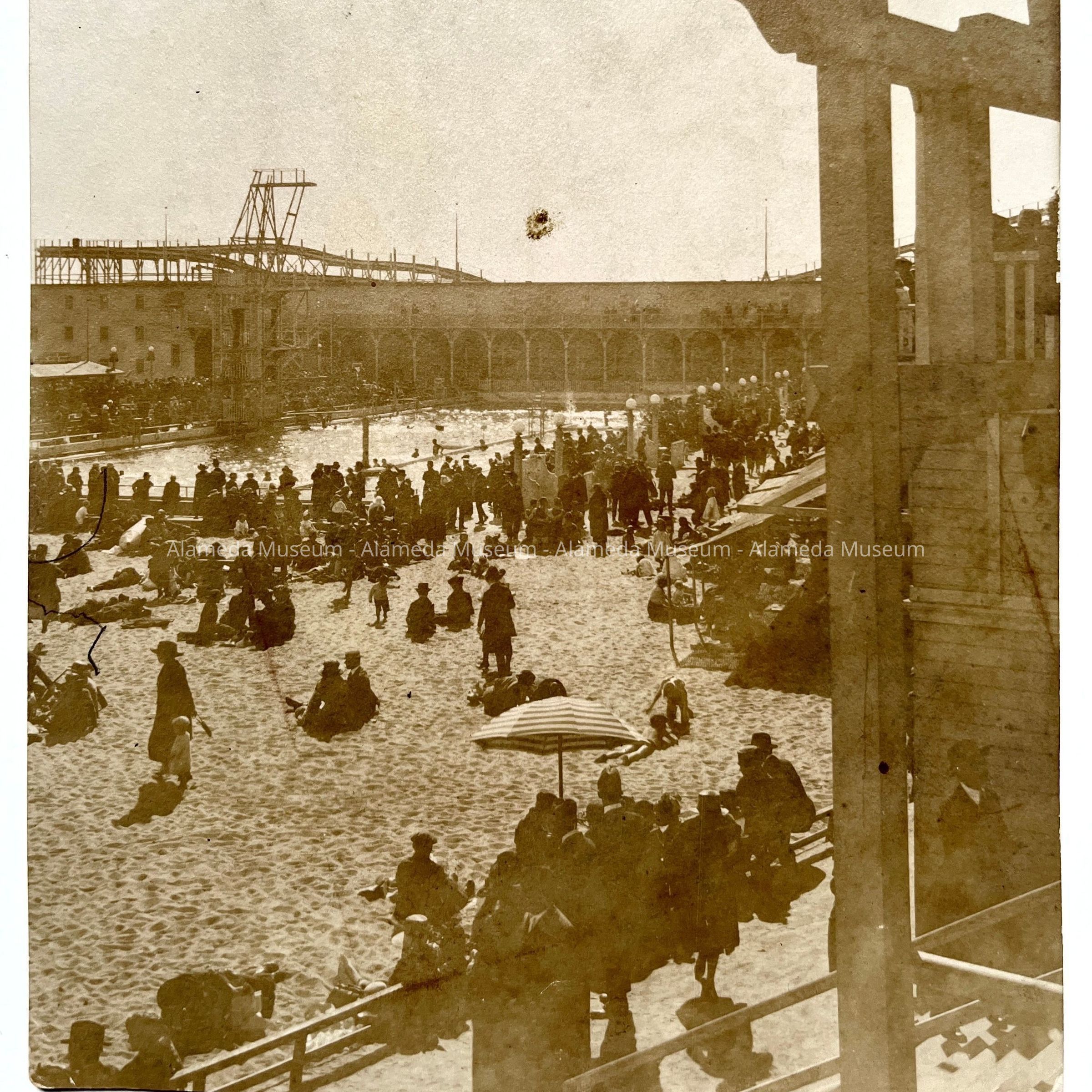 History of Object: View of Neptune Beach showing sandy beach, with the swimming pool in the immediate background and the roller coaster in the far distance.