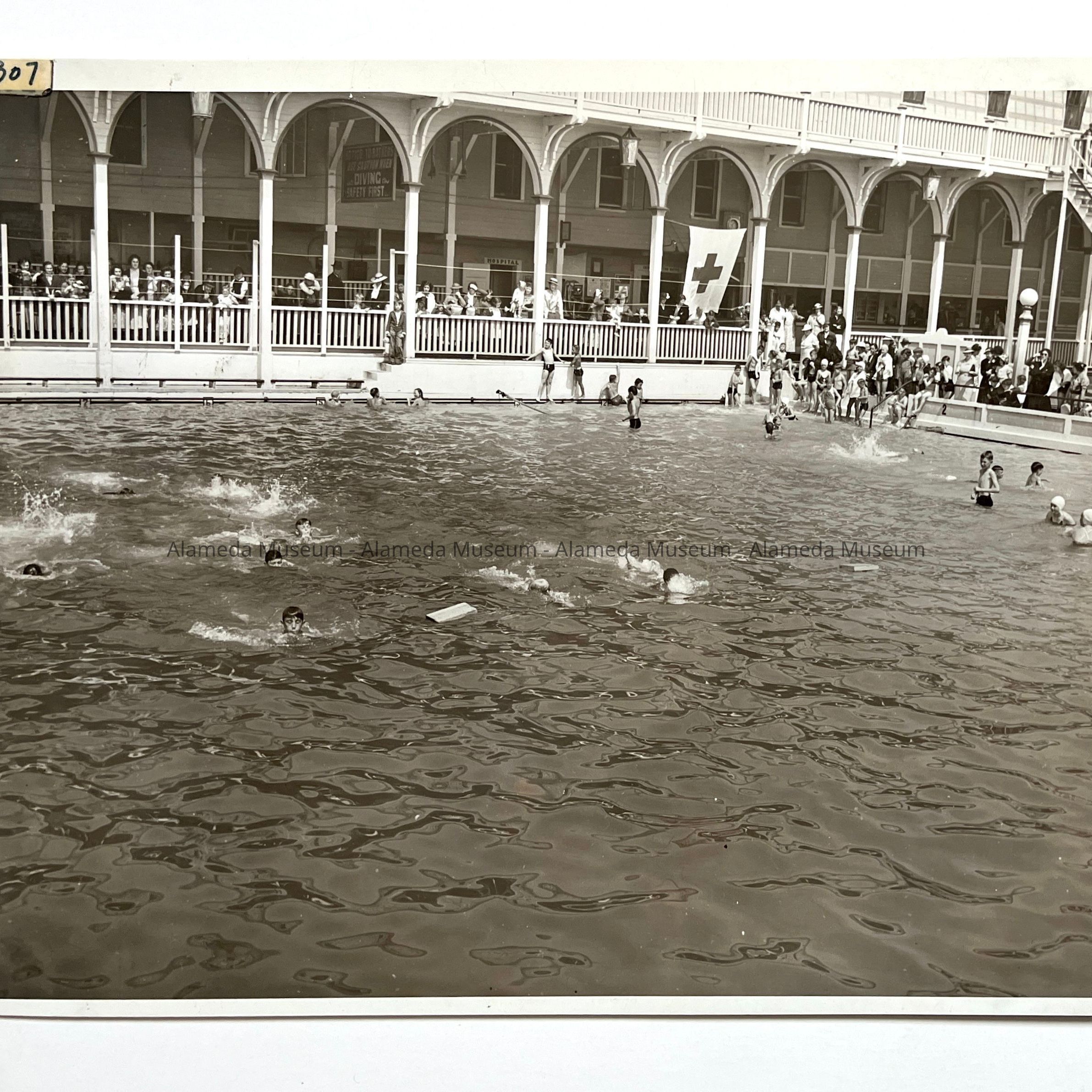 History of Object: Another view of swimmers participating in the Alameda Chapter American Red Cross Swimming Campaign.