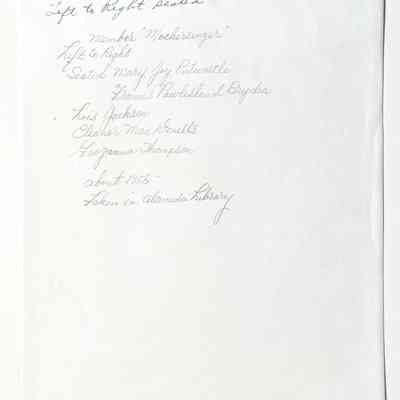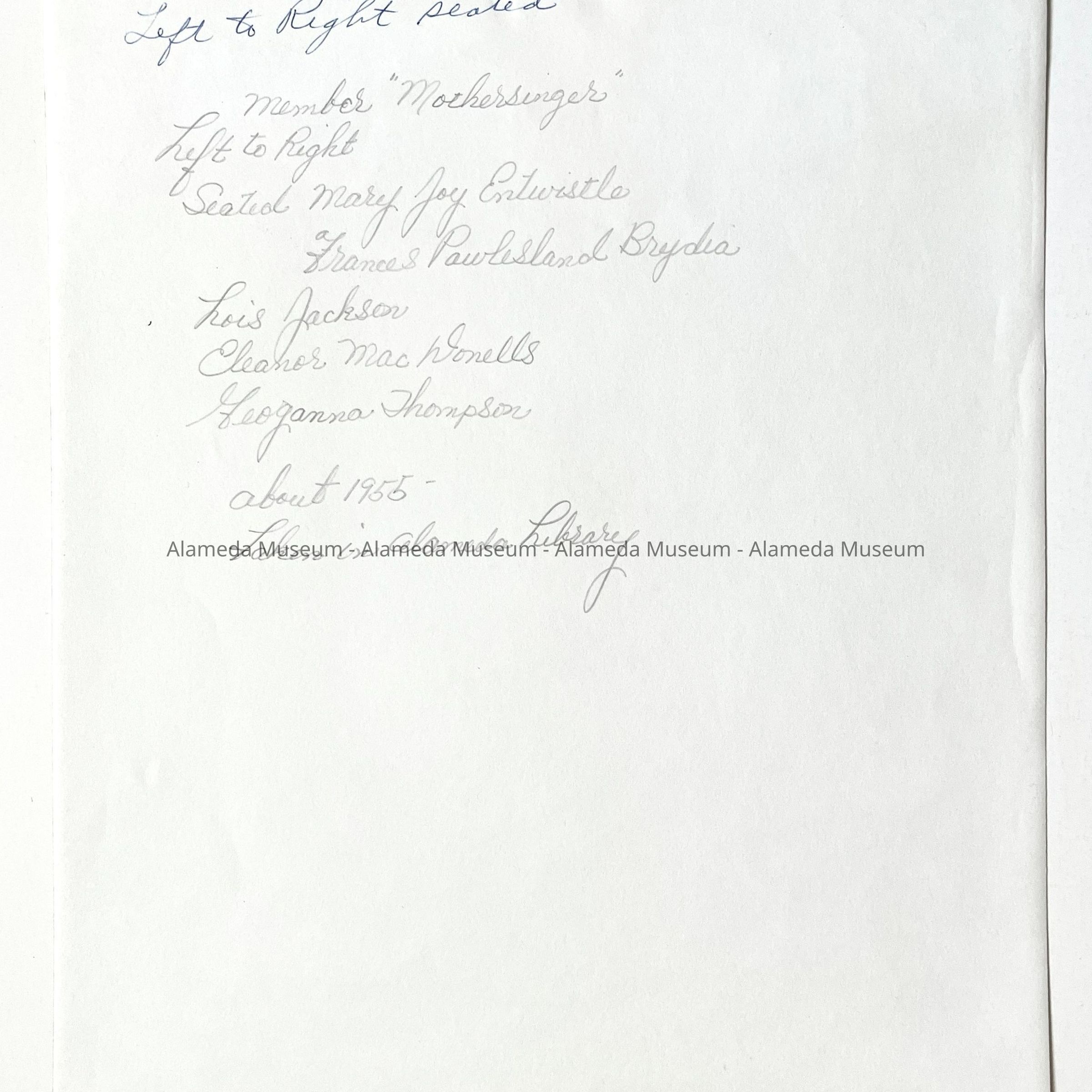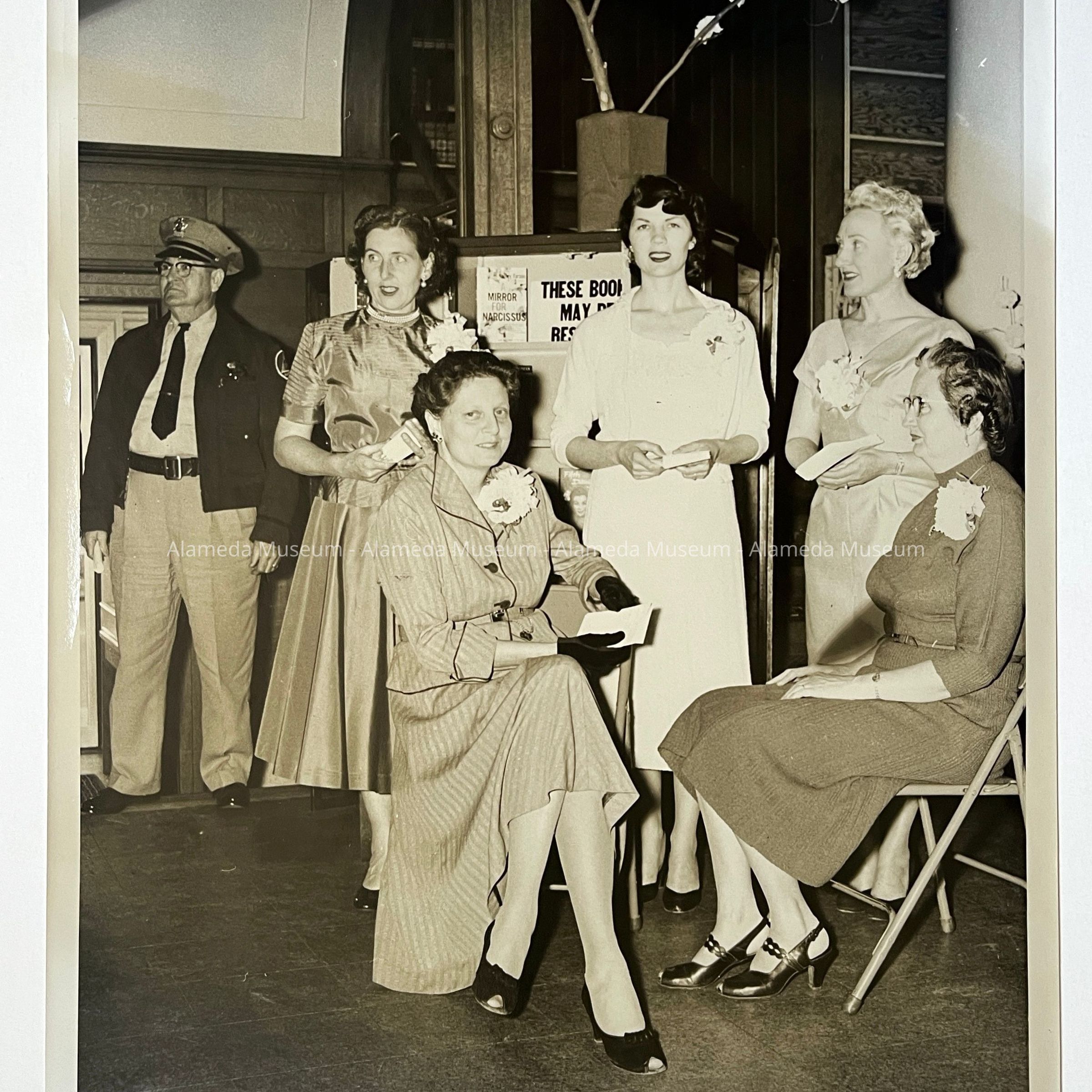 HISTORY OF OBJECT: PHOTOGRAPH OF THE "MOTHERSINGER", VOCAL GROUP, CONSISTING OF FIVE LADIES. TAKEN IN THE LOBBY OF THE ALAMEDA PUBLIC LIBRARY, CORNER OAK & SANTA CLARA, ABOUT 1955. NAMES OF THE FIVE LADIES ARE WRITTEN ON THE REVERSE SIDE,