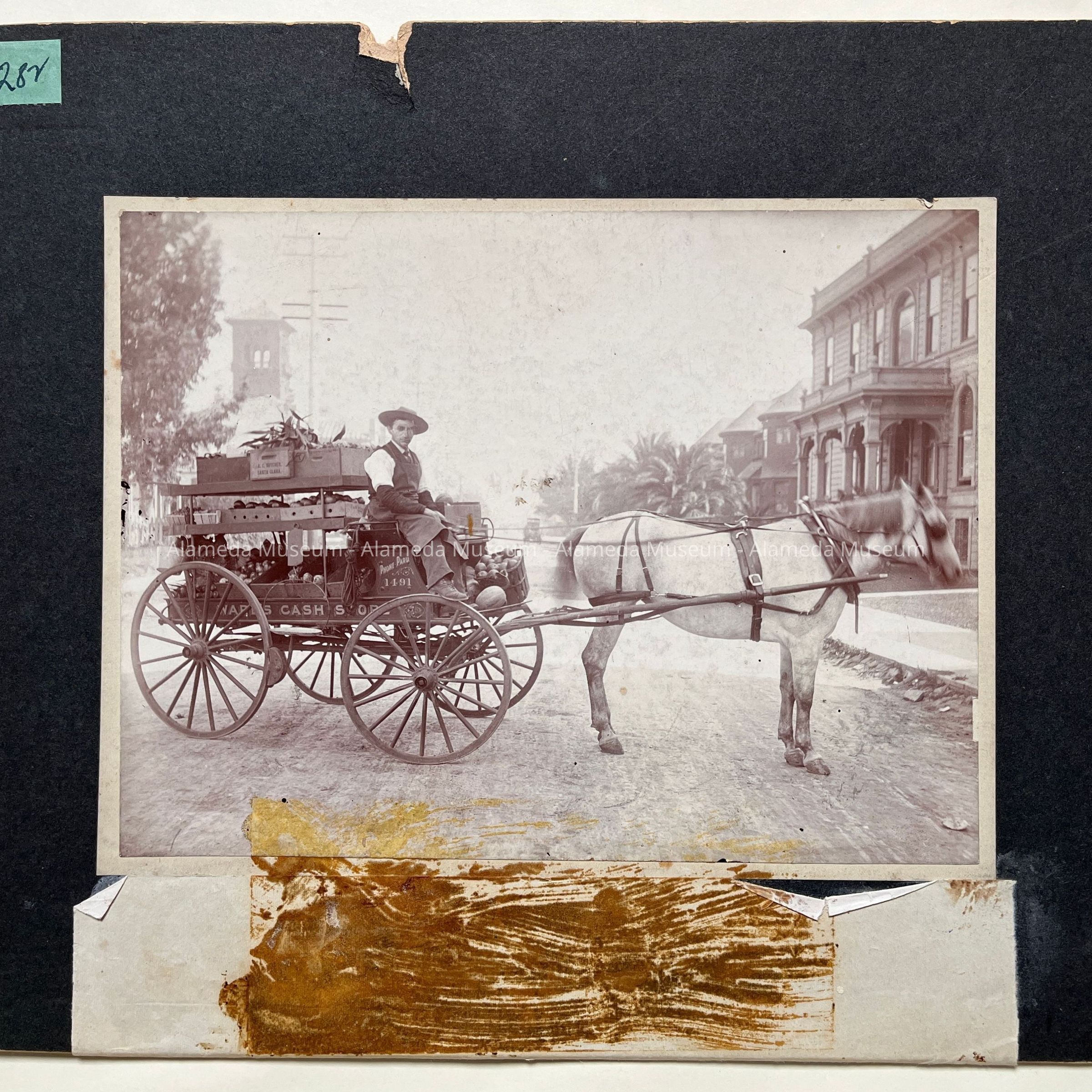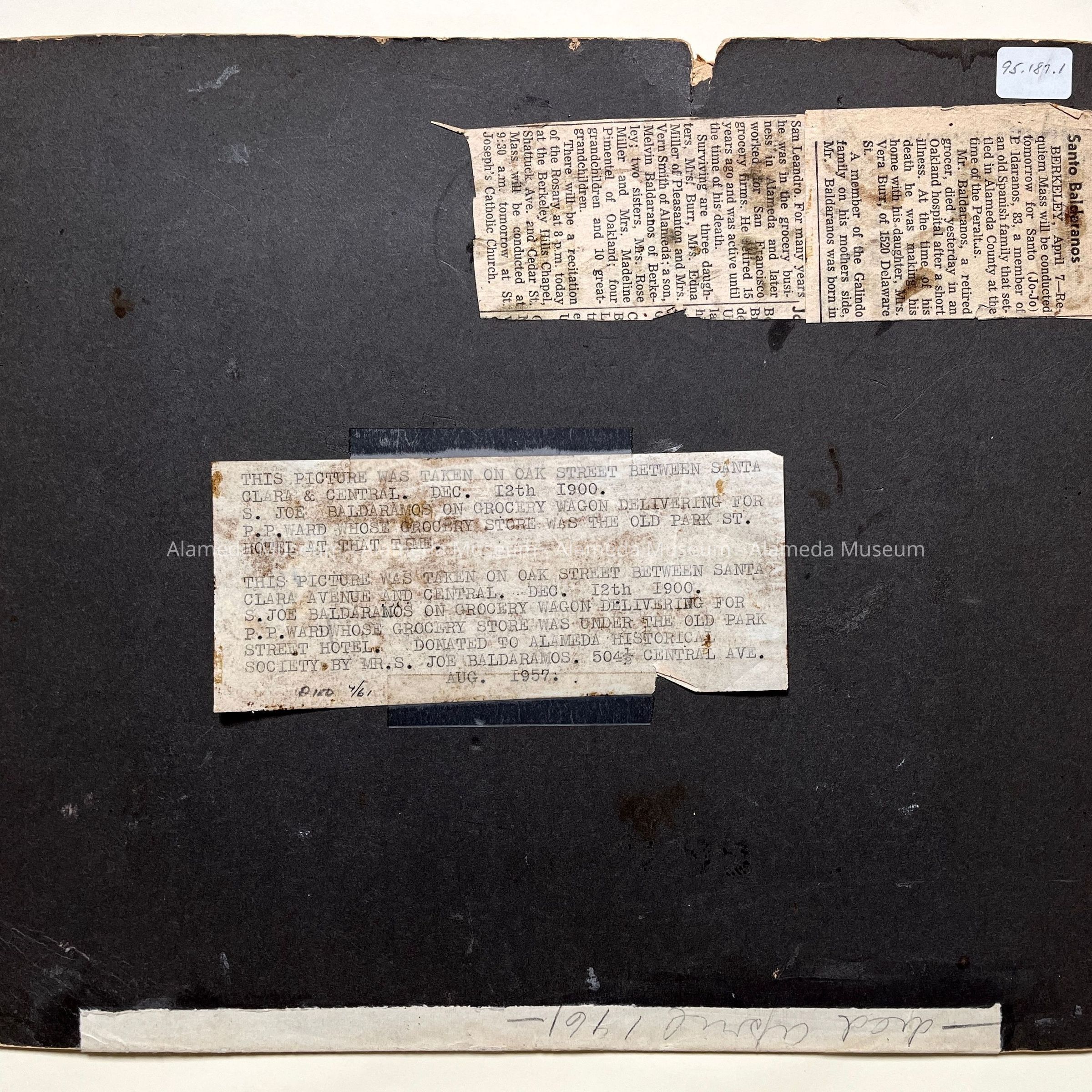 History of Object: View of Ward's Cash Store horse-drawn delivery truck with driver Santo (Joe) Baldoramos; taken on Oak St. between Santa Clara and Central Aves.