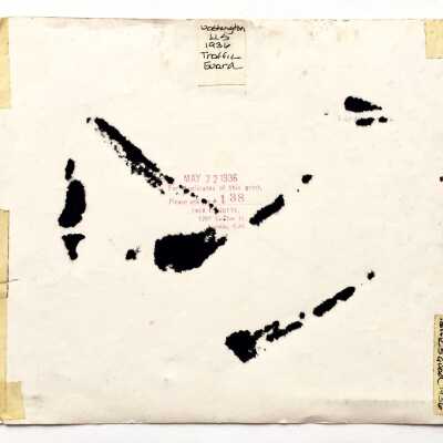 Verso has remnants of black paper, and an attempt has been made to fix various small tears with scotch tape, which has gathered dirt around the edges.