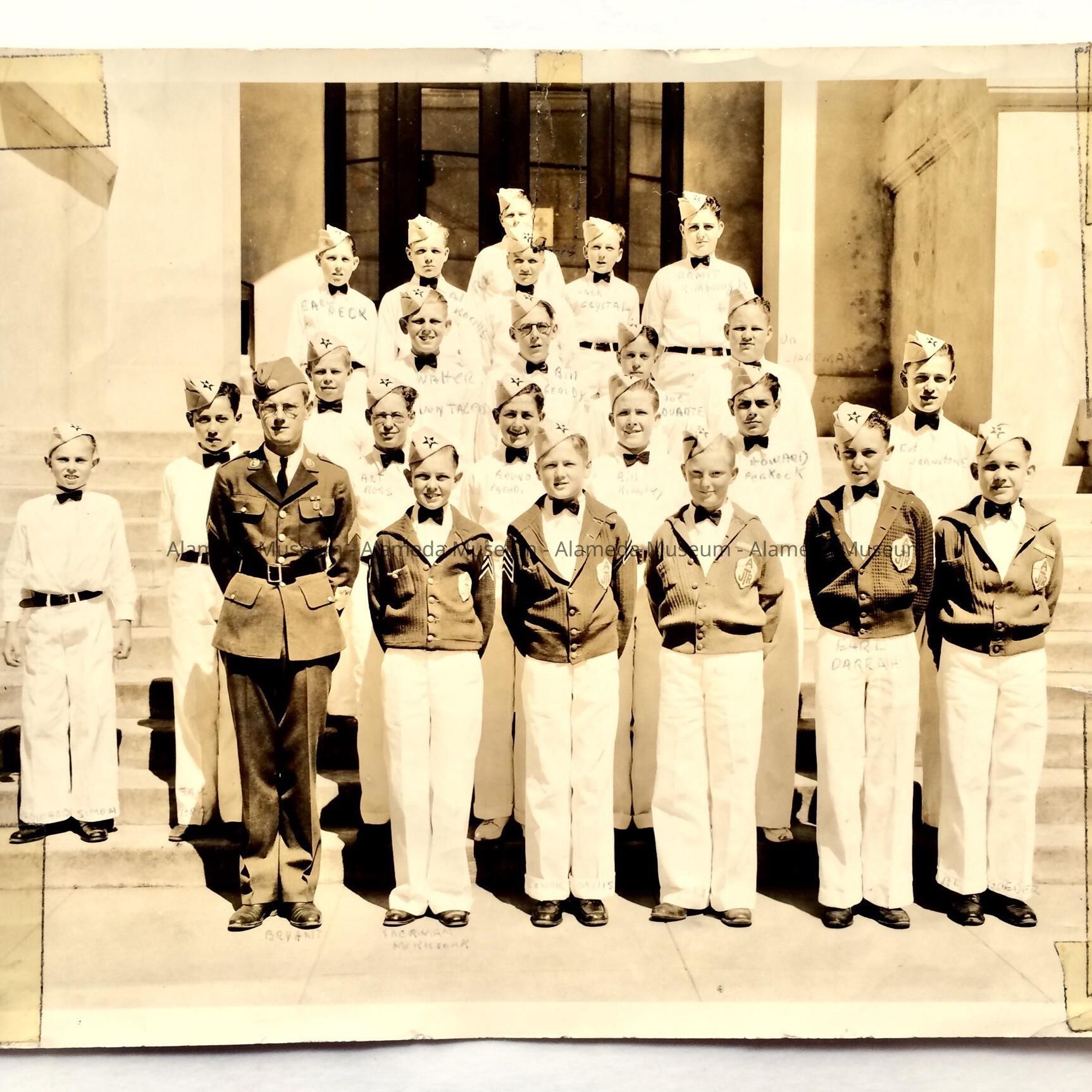 History of Objects: Photo of the Washington High School Traffic Guard, 1936, wearing uniform caps with Associated Oil emblem, provided by the Gutte Service Station on High Street.
