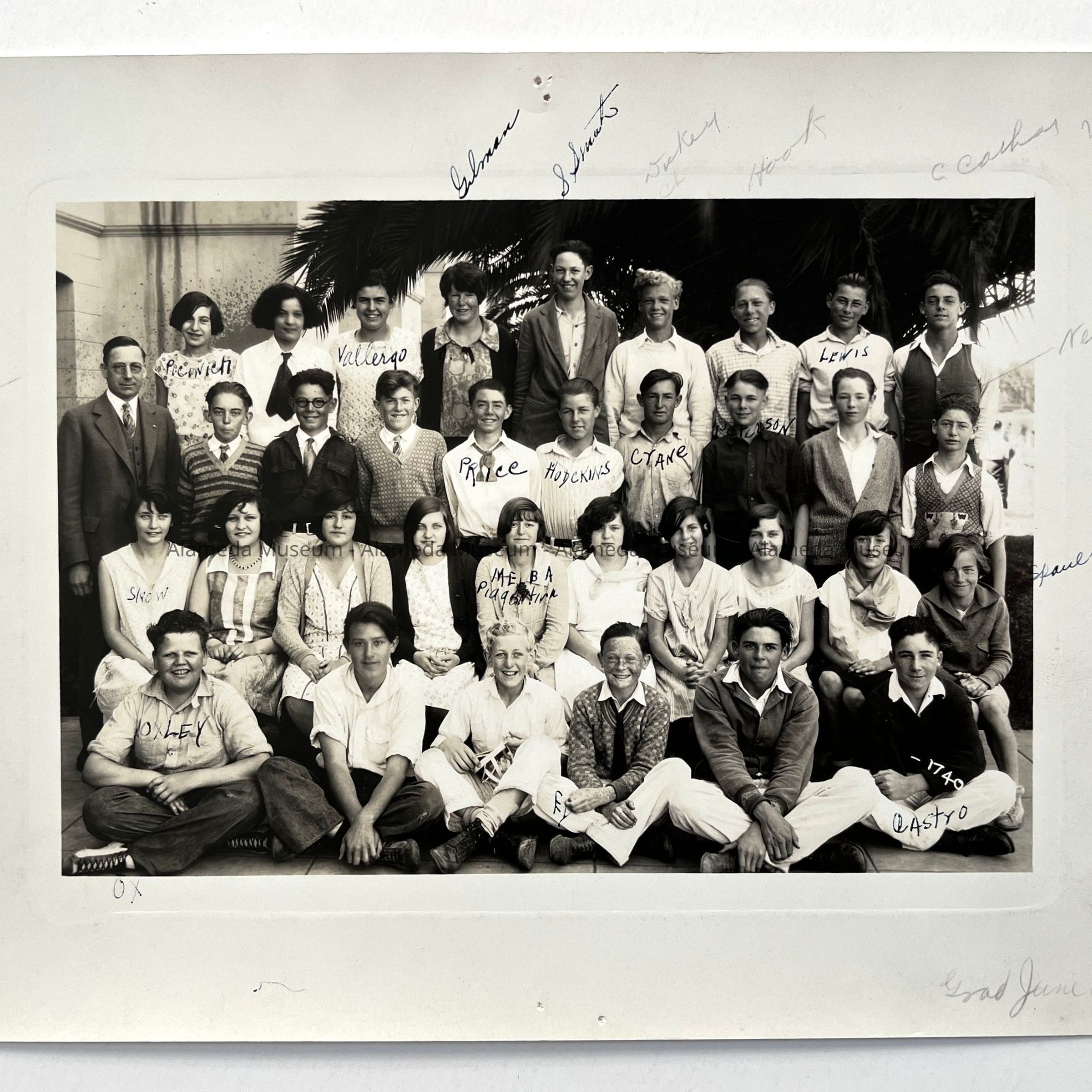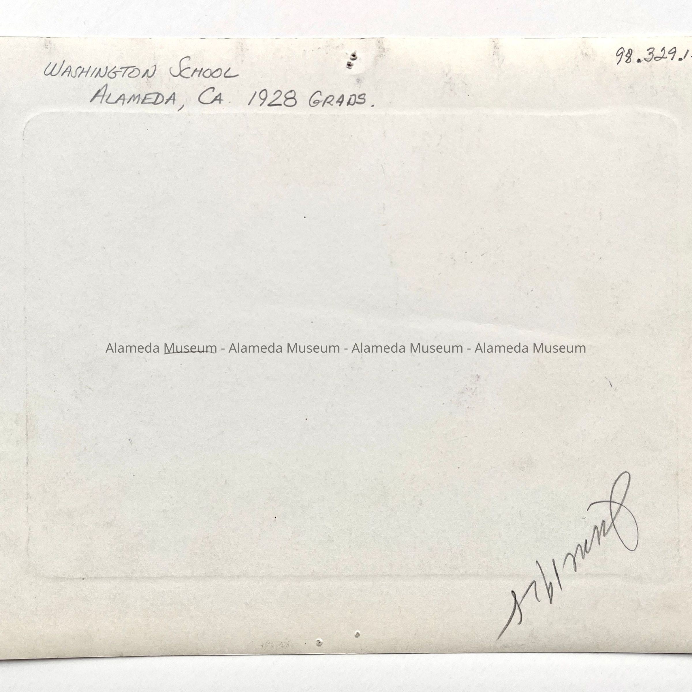 Description: Glossy black/white photo, unmounted. Photographer unknown, but probably is the T.C. Wohlbruck Studio, 251 Post St., S.F. Identifying notations in pencil and black ink are written upon the image. Thumbtack holes appear along its margin.