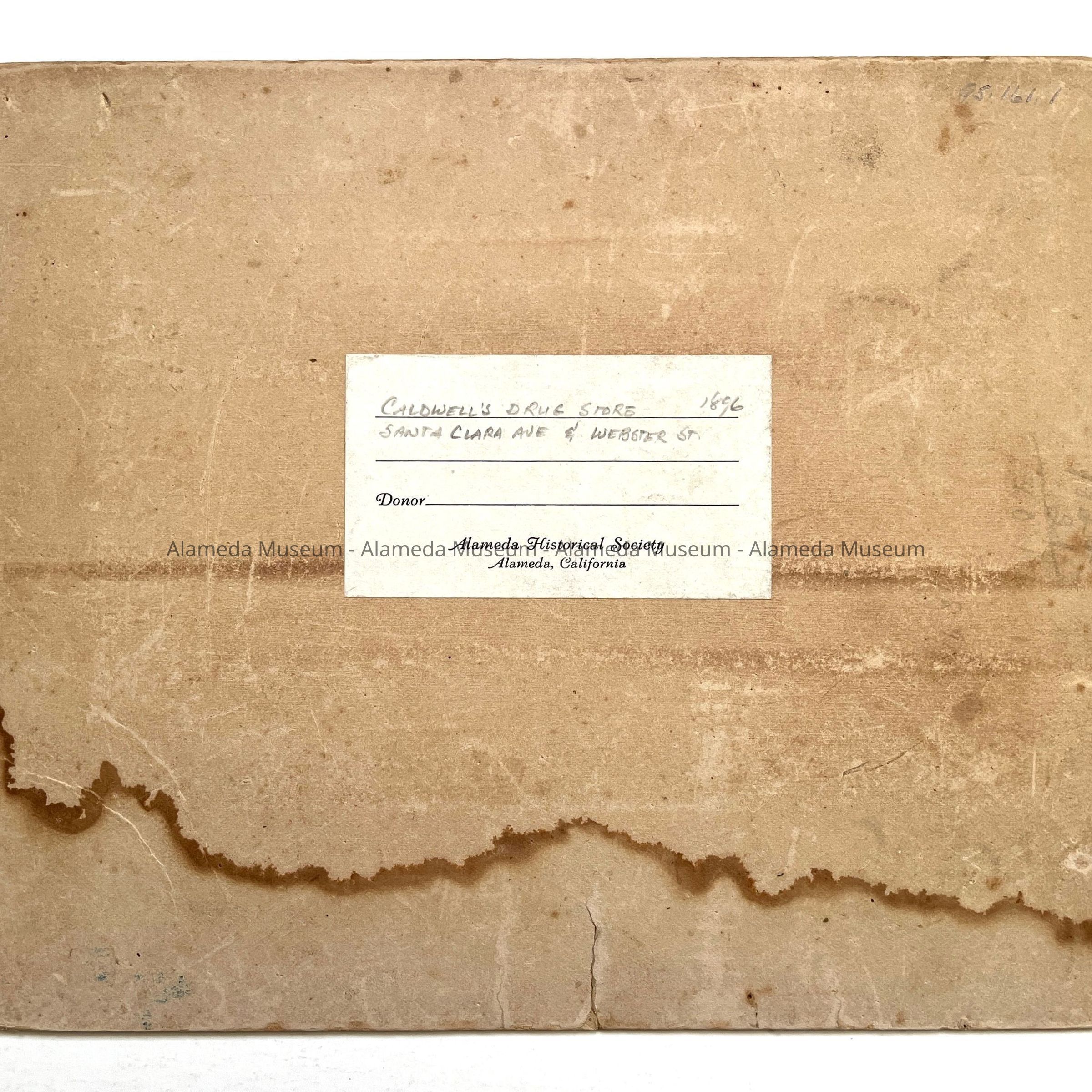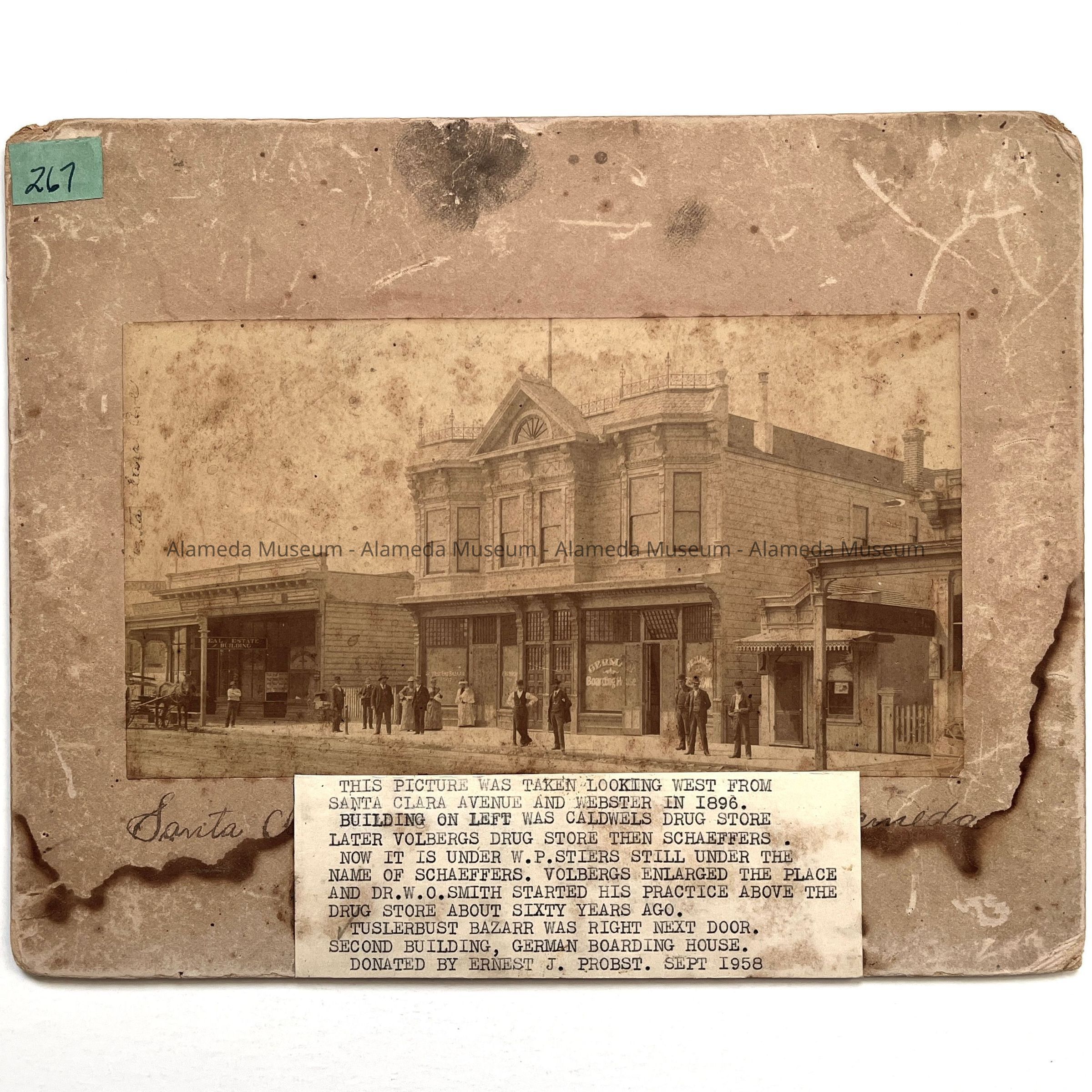 History of Object: Business district photo taken West from Santa Clara Avenue and Webster Street. Caldwell's Drug Store (later Volberg's, then Schaeffer's, finally W.P. Stier's) is shown, along with the Tusterbust Bazaar and the German Boarding House. Several observers are gathered along the sidewalk.