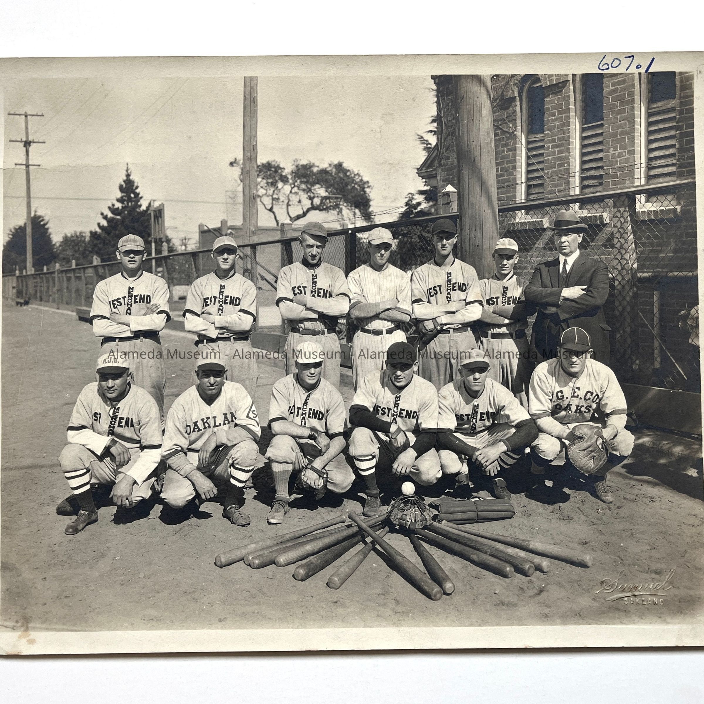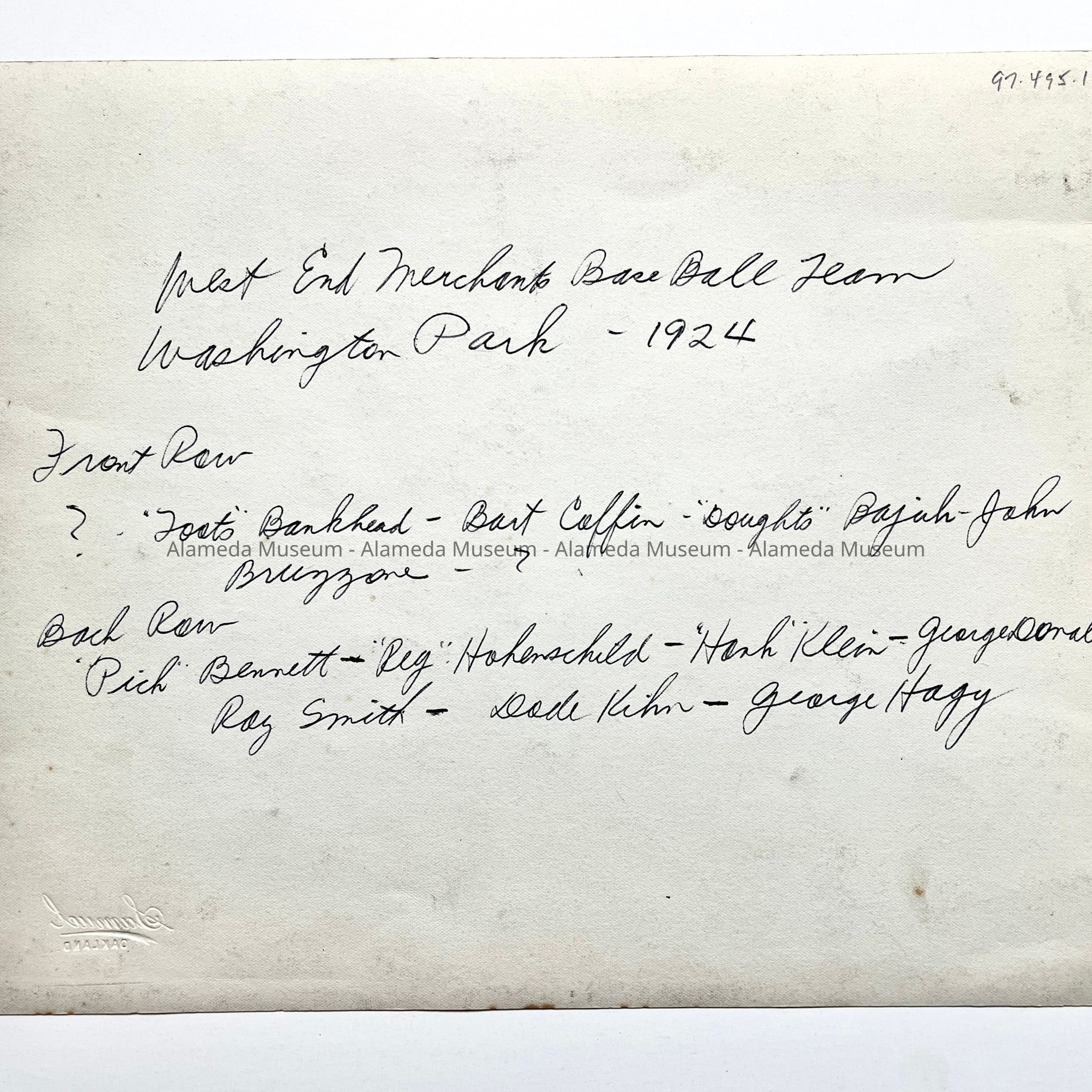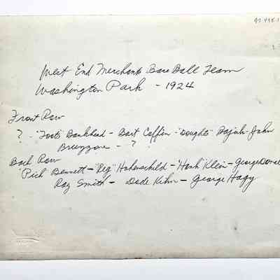 History of Object: West End Merchants Baseball Team, Washington Park, 1924. Most of the members are identified on the verso.