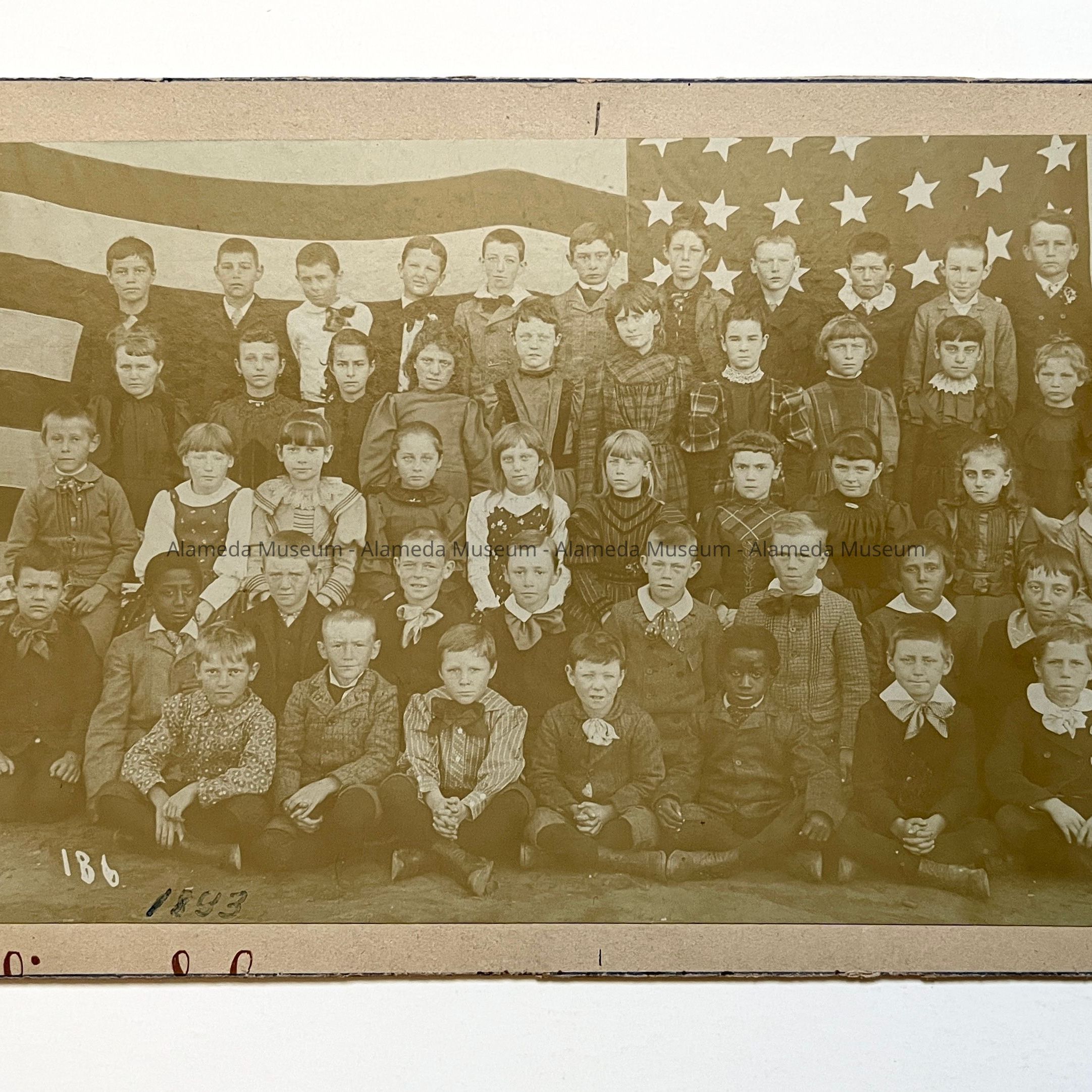 Photo West End School posed outdoors in front of a giant flag, 1893Entry/Object ID