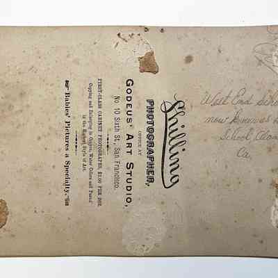 Description: Sepia-toned albumen print photo mounted on tan paperboard. Photographer: Shilling, S.F. (per imprinting in black ink on verso). The mounting has a red ornamental border imprinted to highlight the image. The mounting has foxing, it has been cropped at the top and bottom margins. The image is somewhat faded.