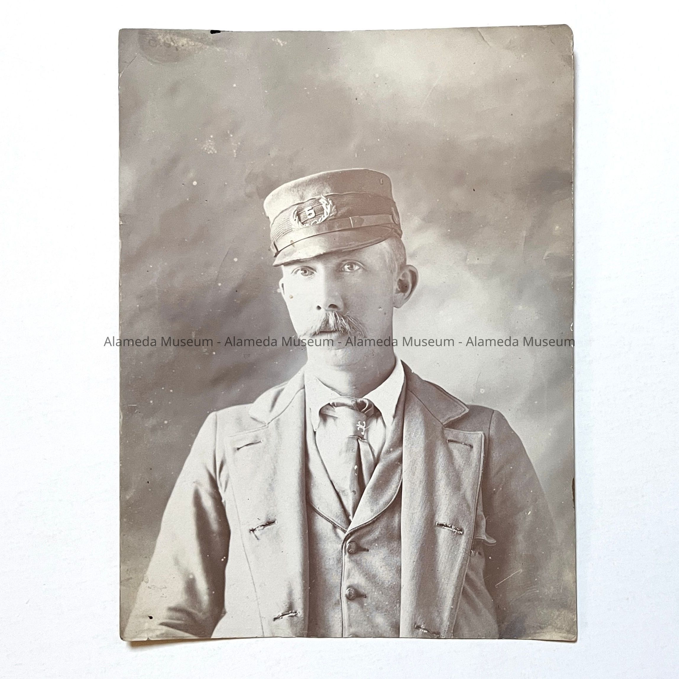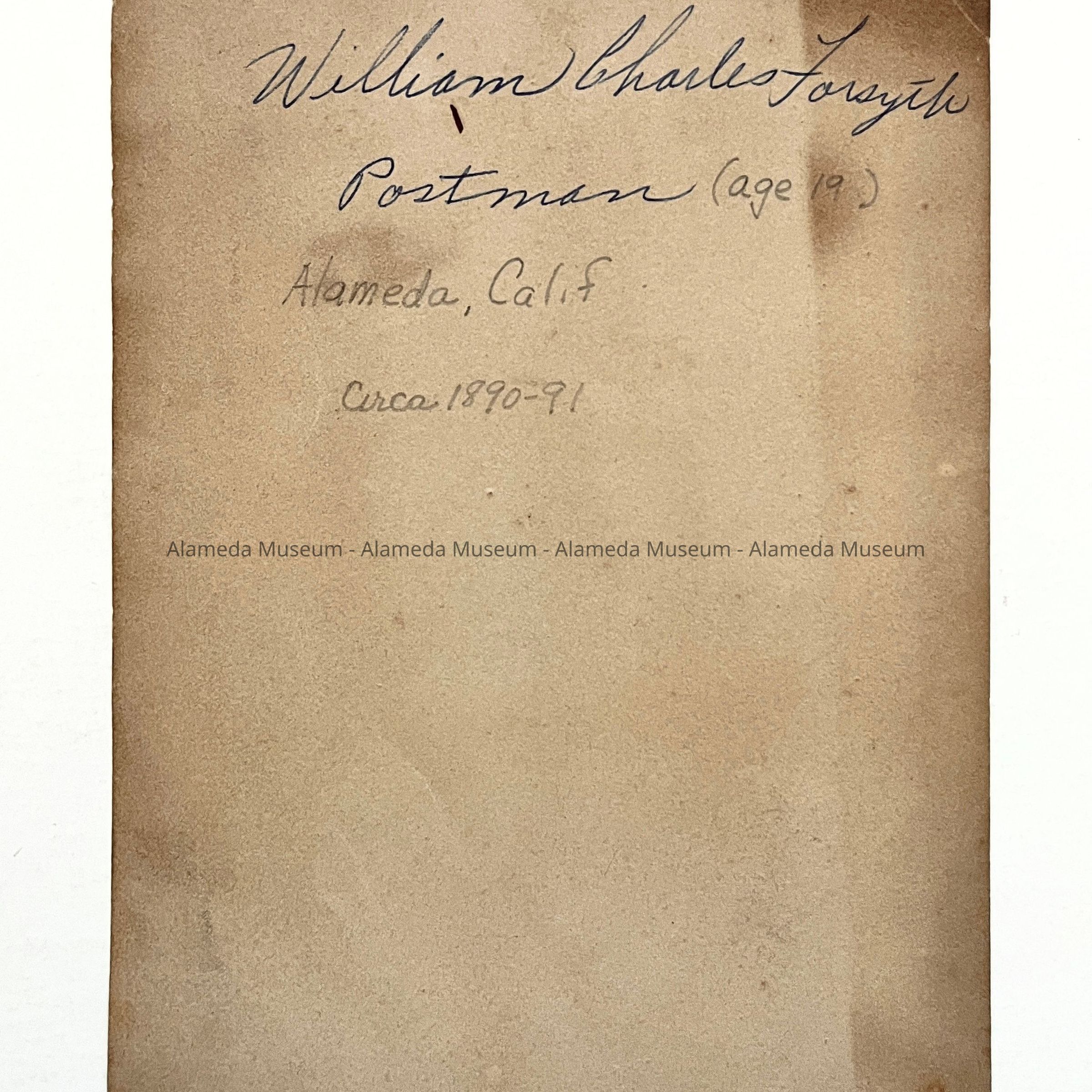 Photo of William Charles Forsyth (in uniform), Alameda Postman, carrier #5. During the year 1890, the Board of Trustees that governed Alameda, applied to the United States Government for free postal delivery to homes. This request was approved which necessitated the hiring and training of postmen. The late Mr. Forsyth told the donor (his stepdaughter) that he was the third man to be hired as Alameda's first group of postmen.