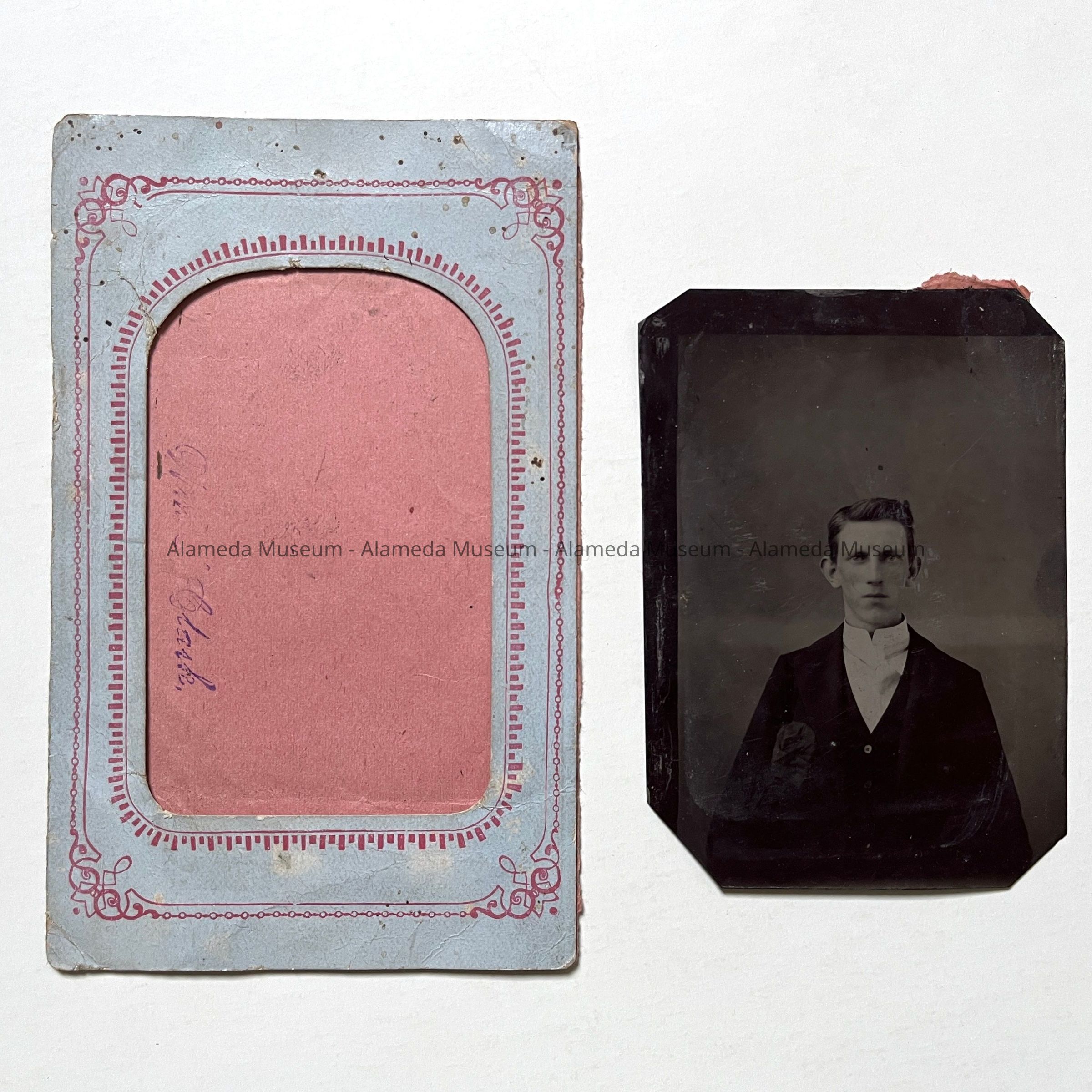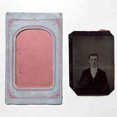 Description: Tin type in ornamental photographic sleeve with grey backed