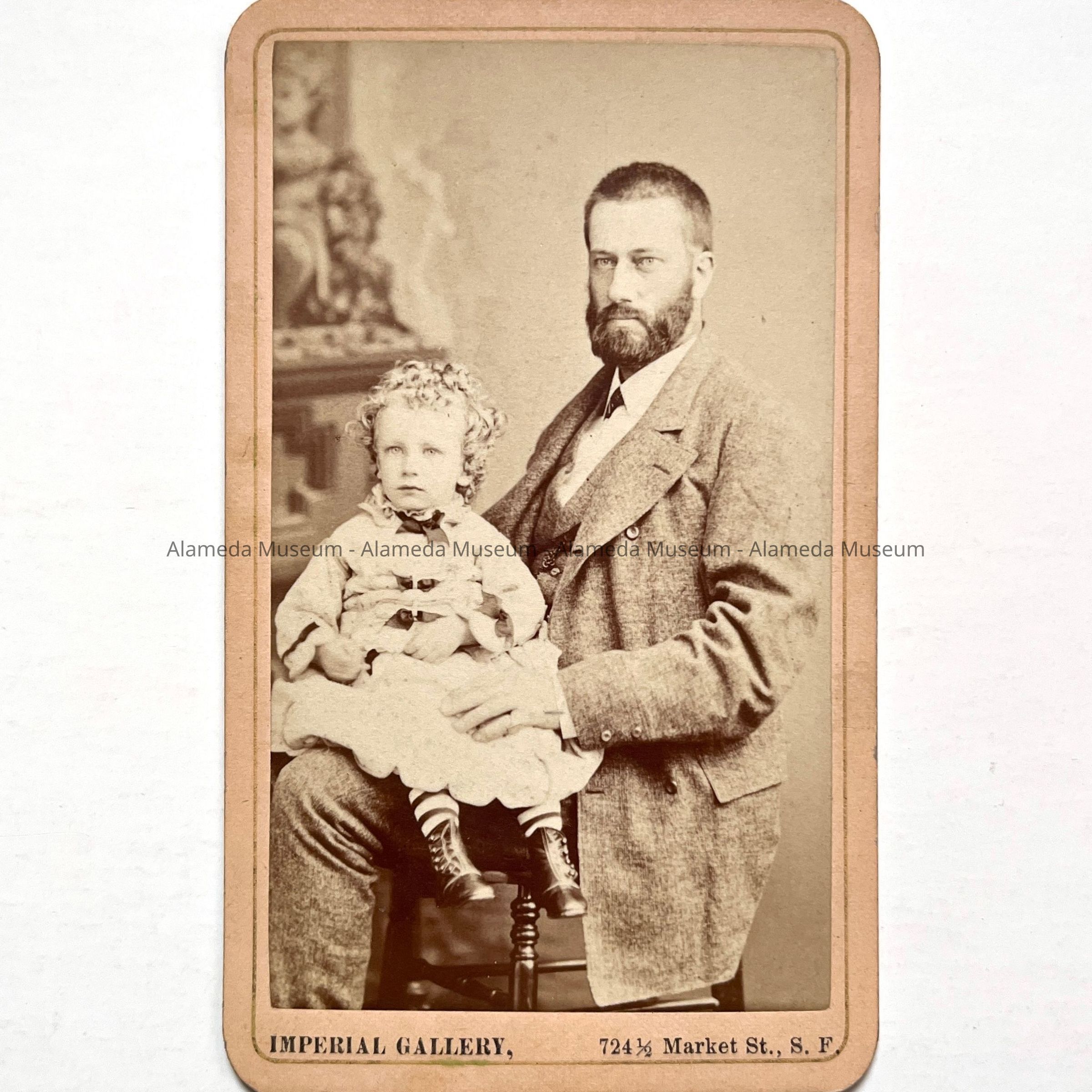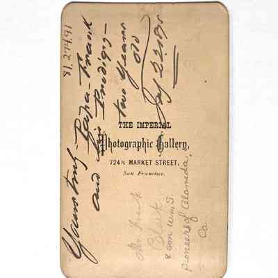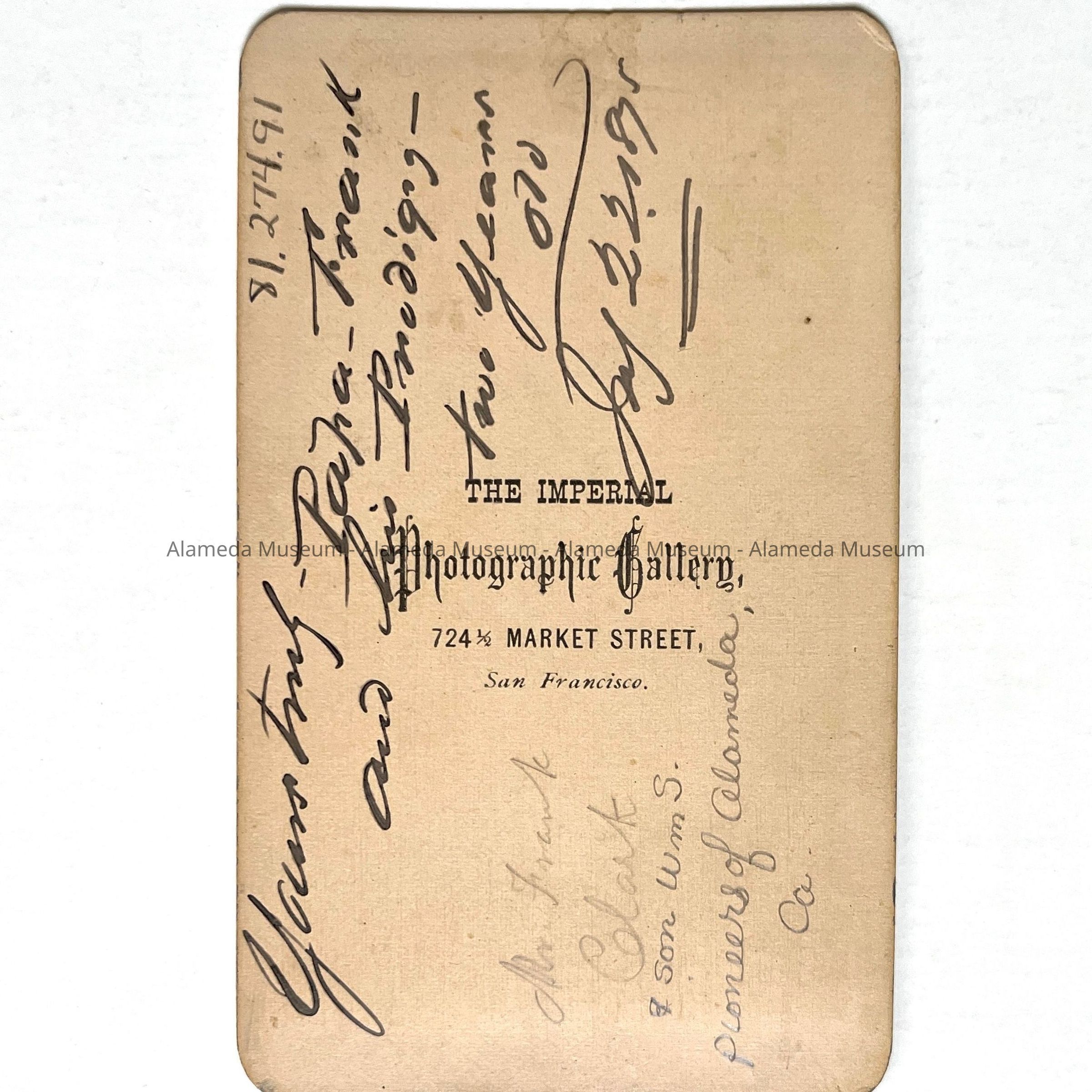 Description: Sepia tinted photo with captioned mounting "Imperial Gallery, 724. Market St., S. F.", and reverse side same, and inscription in ink "yours truly Papa Frank and his prodigy, two years old, July 22, 1875".