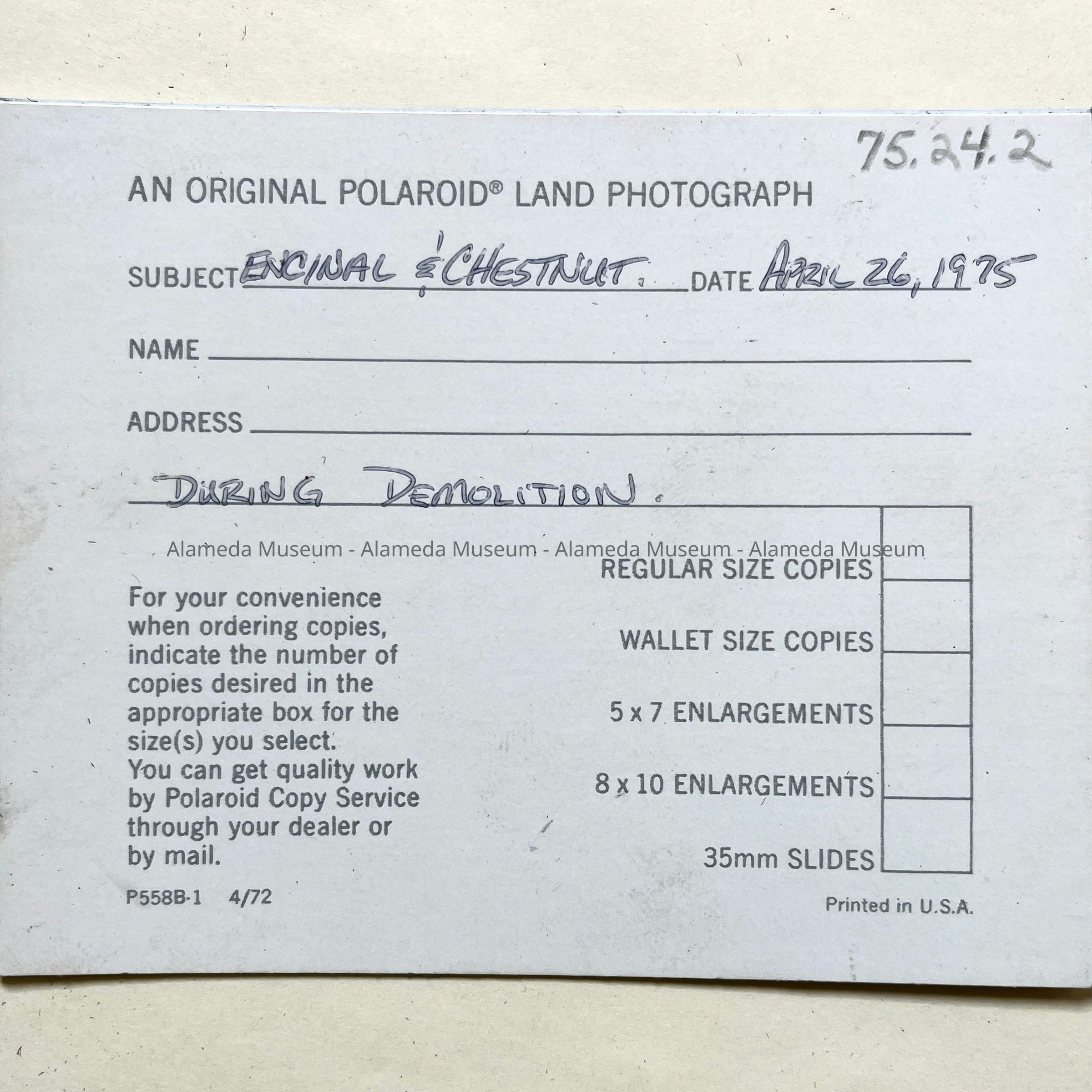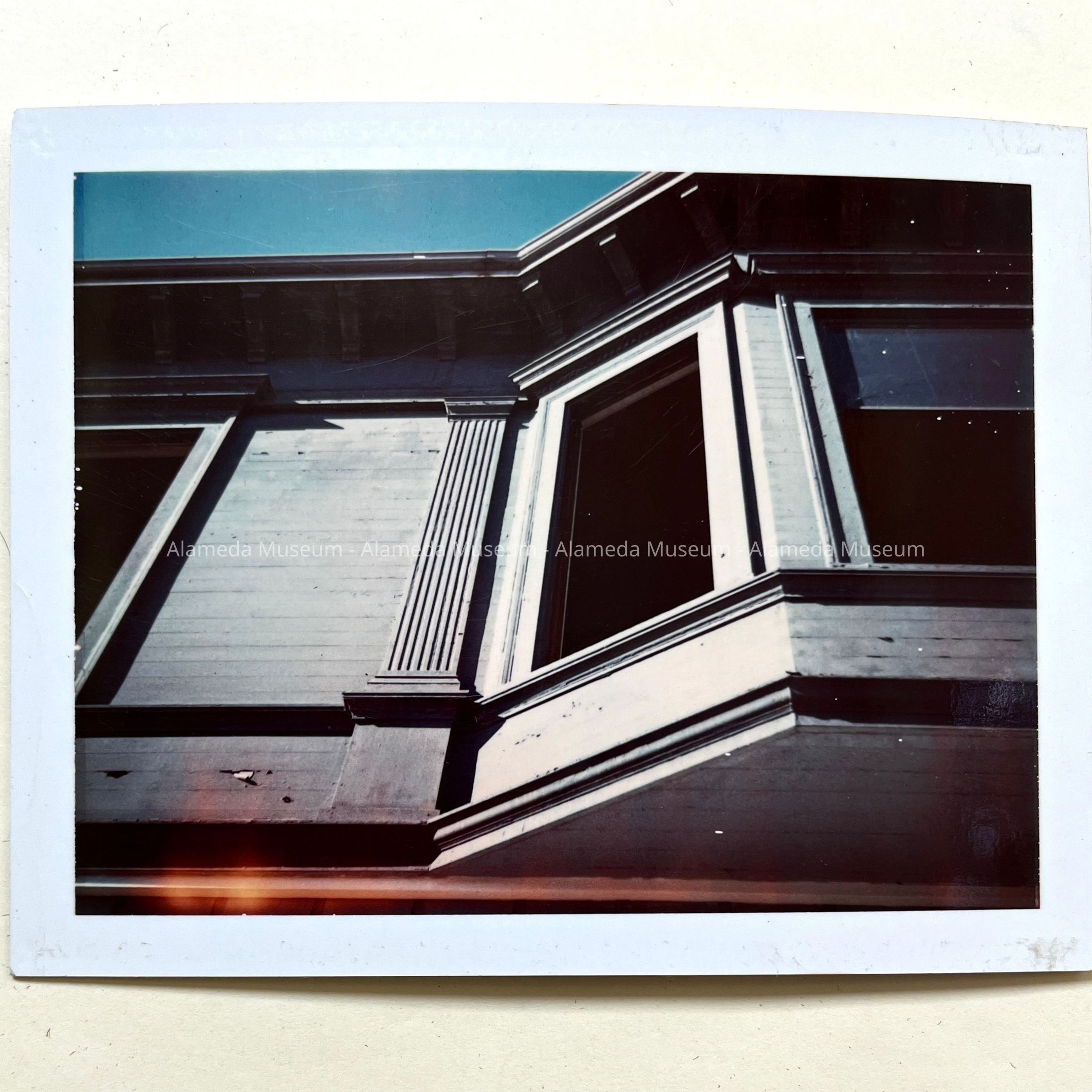 HISTORY OF OBJECT: PHOTOGRAPH TAKEN BY BOB NELSON, A MEMBER OF THE ALAMEDA VICTORIAN PRESERVATION SOCIETY, ON APRIL 26, 1975. AN EXTERIOR VIEW SHOWING WINDOW DETAILING AND PILASTER (HALF COLUMN), A FEATURE OF THE CLASSICAL REVIVAL STYLE. WORKMEN HAVE ALREADY BEGUN TO REMOVE WINDOW CASEMENT. THE BUILDING WAS ERECTED IN 1898, AND DEMOLISHED IN 1975. IT WAS FORMERLY THE LOCATION OF THE ANSEL MEAT MARKET.