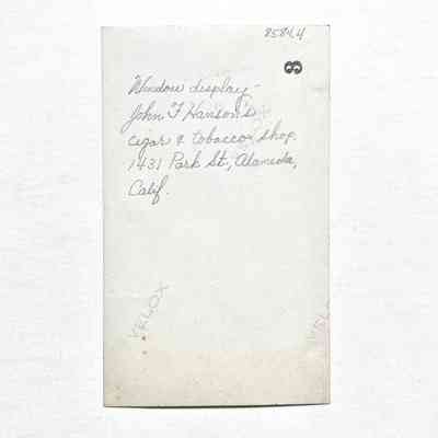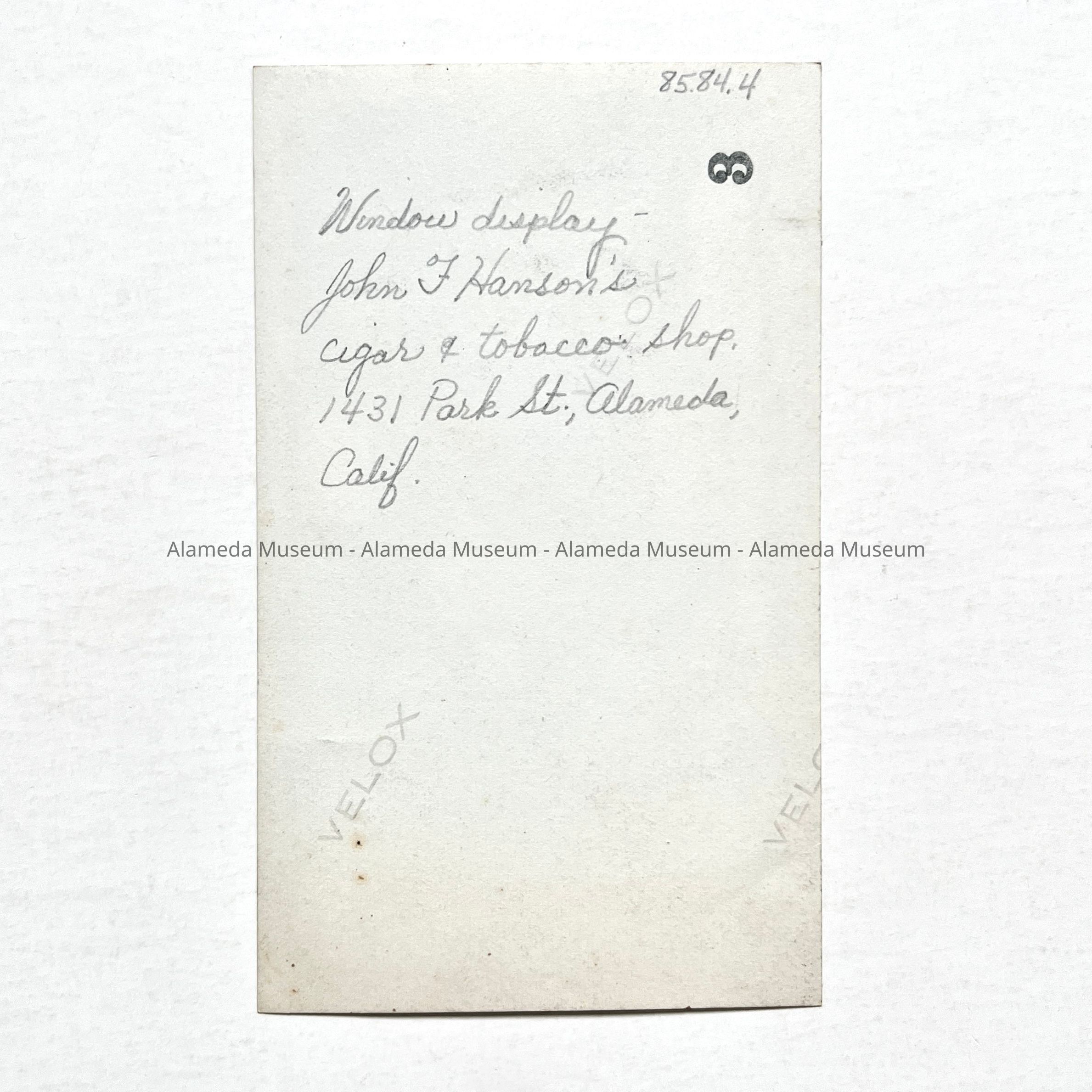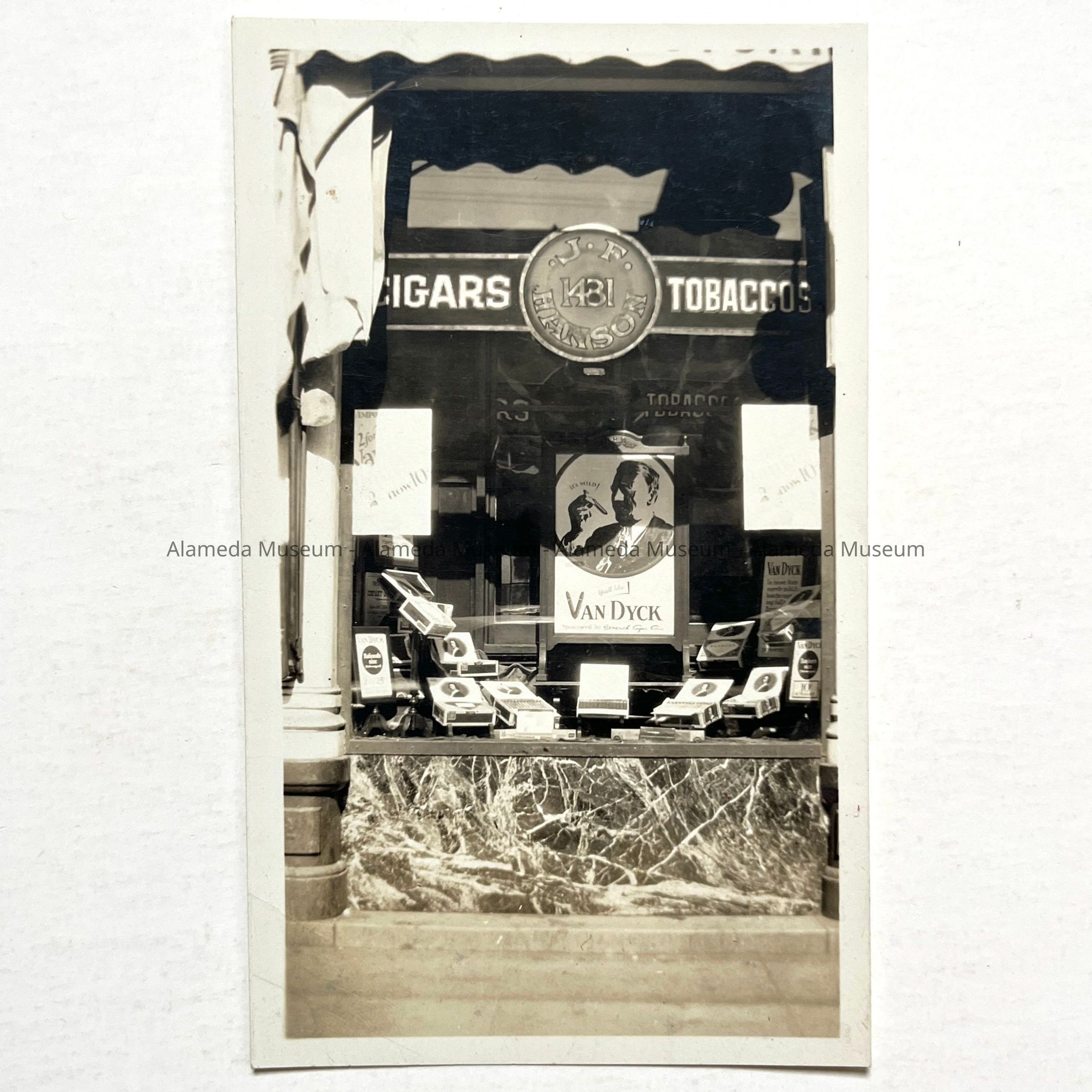 Photo of a display of Van Dyck cigar in the window of the J. F. Hanson cigar & tobacco shop at 1431 Park Street, Alameda.