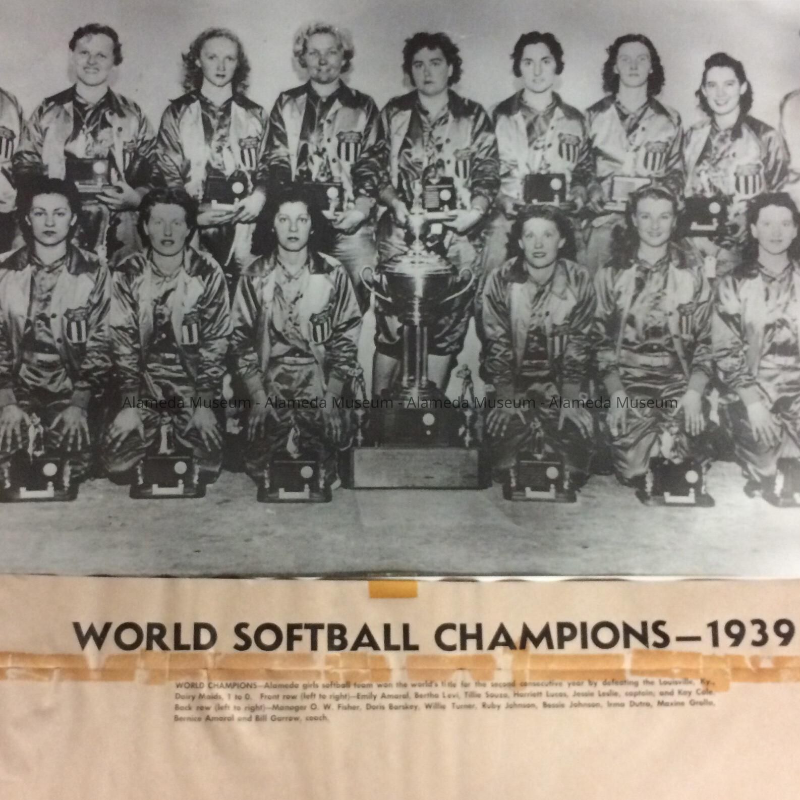 History of Object: A group picture of the ladies World Champion Softball Team, Alameda, 1939. The team won the world's title for the second consecutive year by defeating the Louisville, Ky., Dairy Maids, 1 to 0. It depicts the large trophy in the center of the photograph.