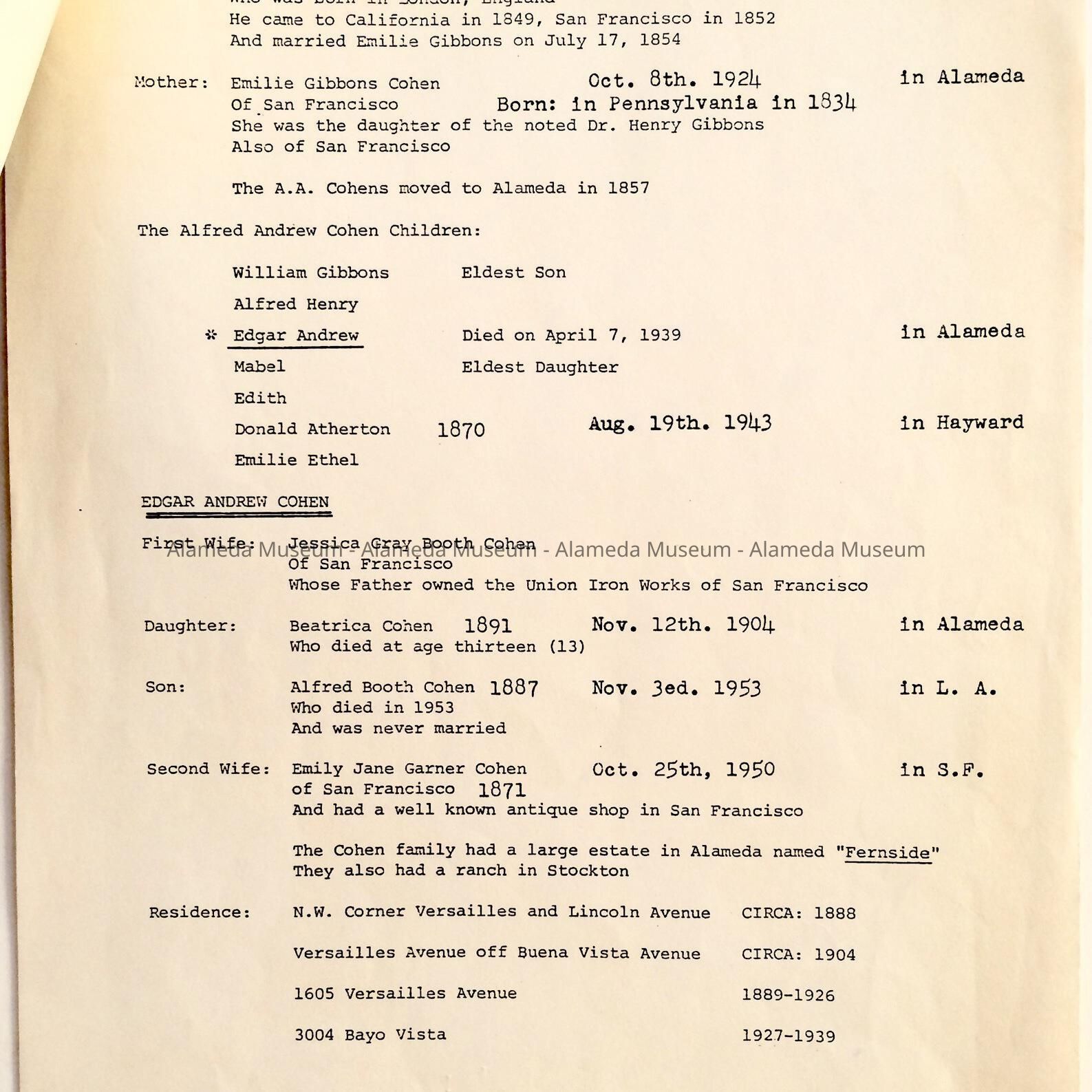 INFORMATION CONCERNING EDGAR A COHEN, SON OF A A COHEN, NOTED PHOTOGRAPHER (1859-1939). HE WAS A MEMBER OF A PROMINENT ALAMEDA FAMILY.