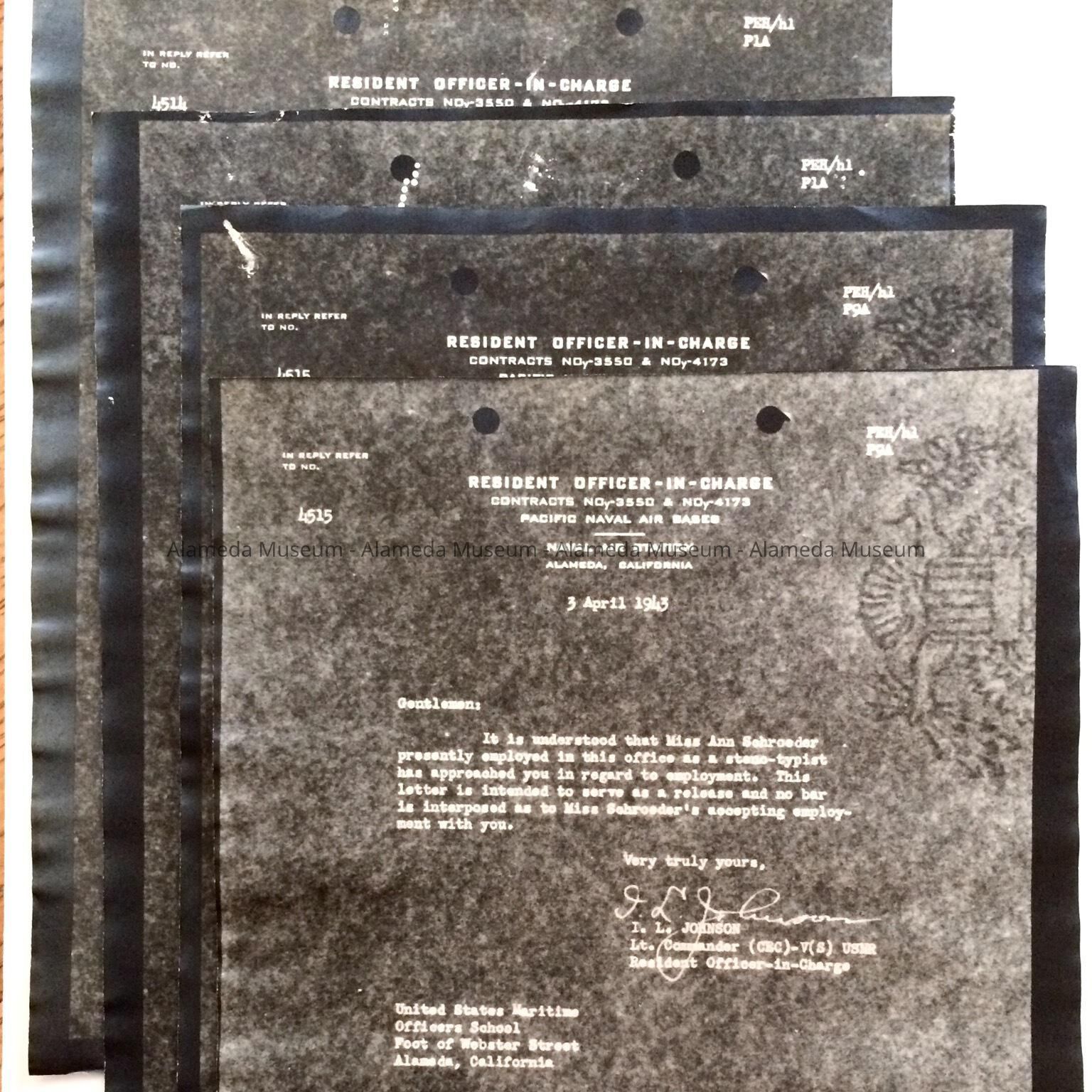 HISTORY OF OBJECT: A LETTER OF RECOMMENDATION FROM THE ALAMEDA NAVAL AIR STATION FOR GERTRUDE ANNE SCHROEDER, WHO WAS TRANSFERRING TO THE U.S. MARITIME SCHOOL.