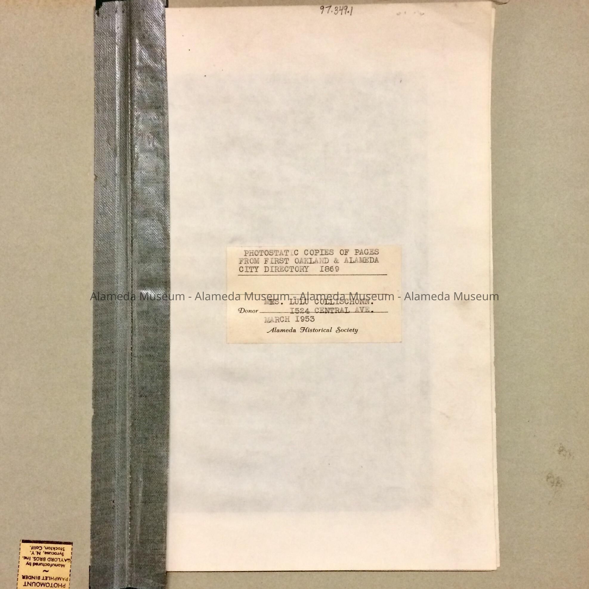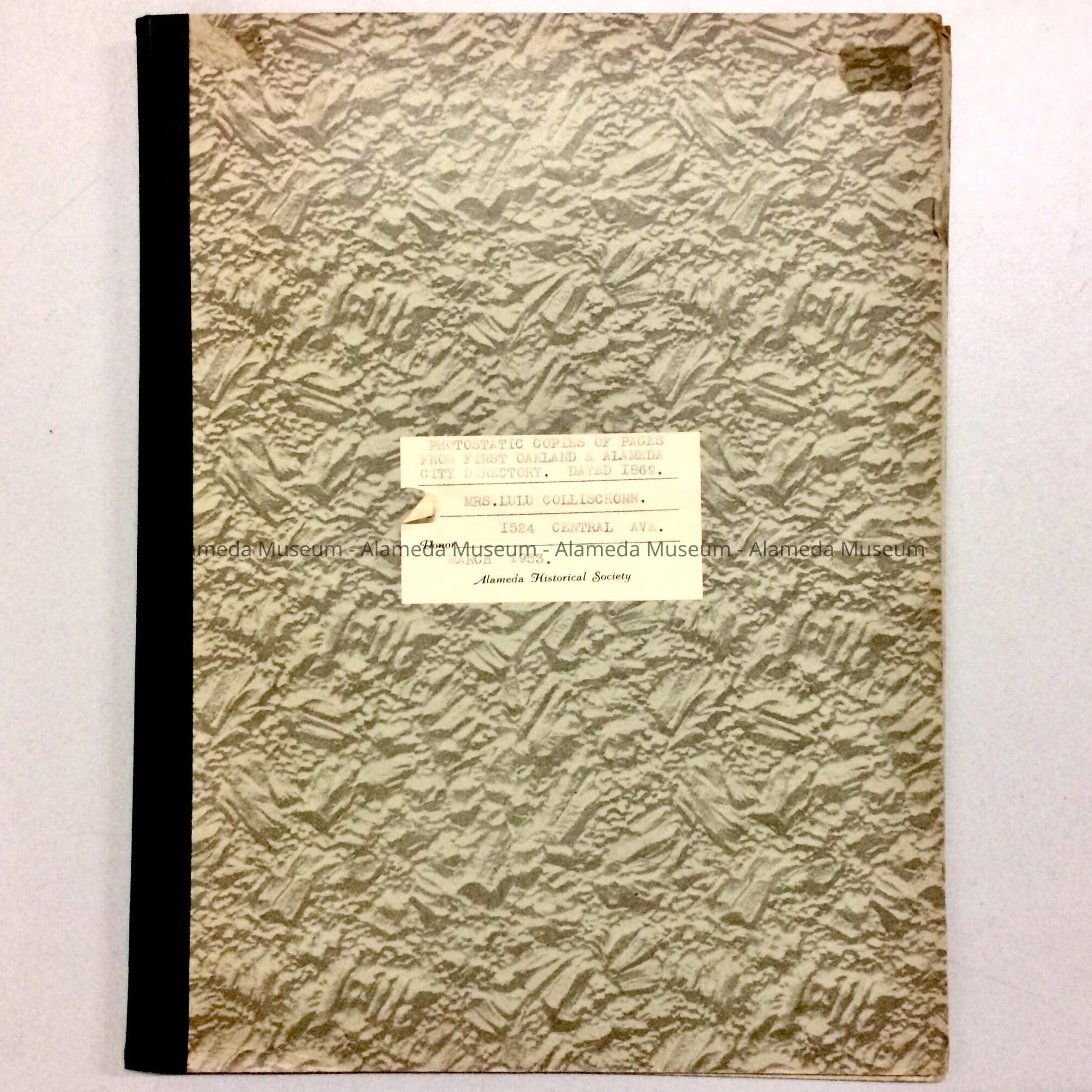 PHOTOSTATIC COPIES OF PAGES FROM THE FIRST OAKLAND AND ALAMEDA CITY DIRECTORY, DATED 1869. GIVEN TO THE ALAMEDA HISTORICAL SOCIETY BY MRS LULU COLLISCHONN, MOTHER OF THE LATE FRANZ COLLISCHONN, PAST MAYOR OF THE CITY OF ALAMEDA. THE DIRECTORY ALSO INCLUDES A SMALL DESCRIPTION OF THE TOWN AS WELL AS ADVERTISEMENTS OF EARLIER BUSINESSES OF THE PERIOD.