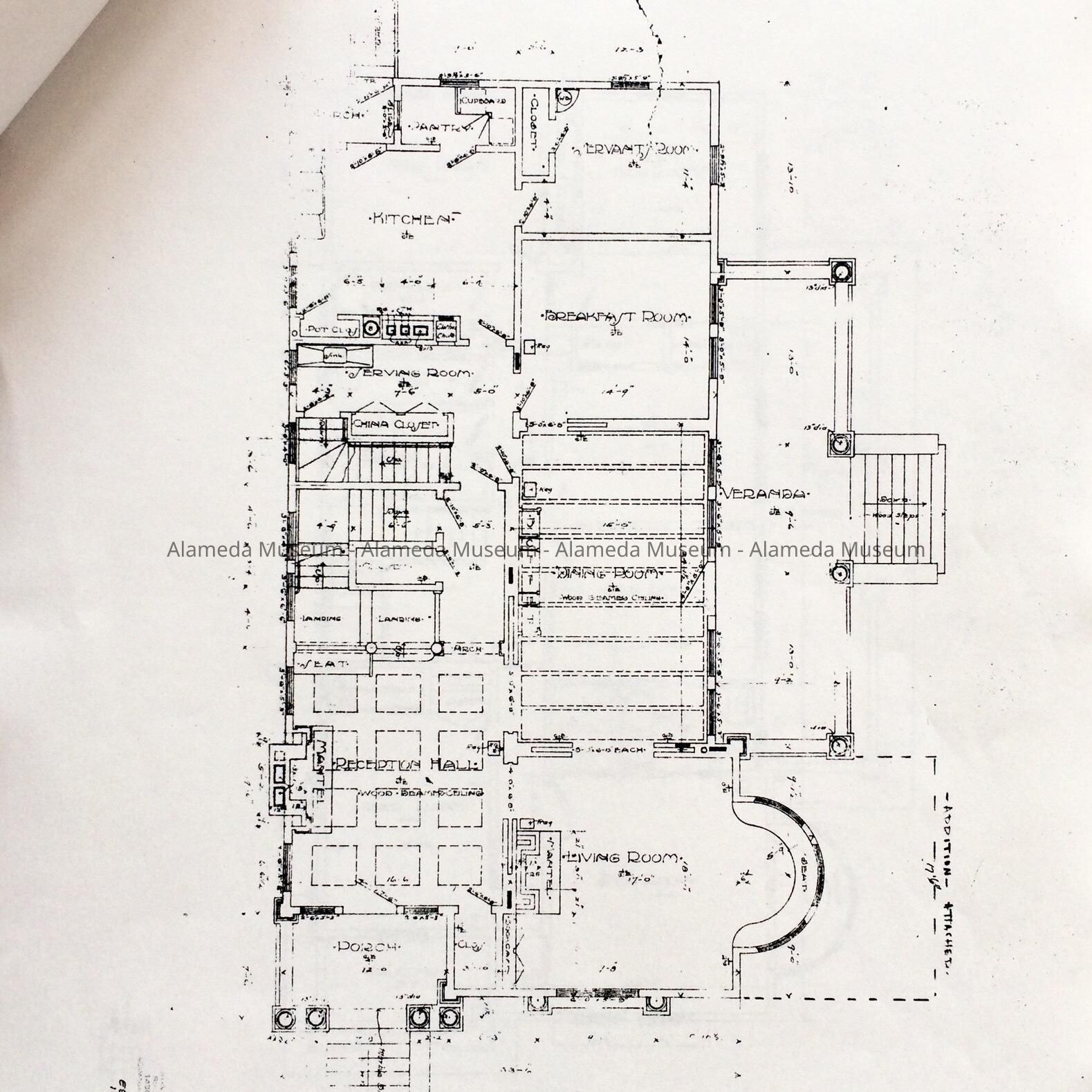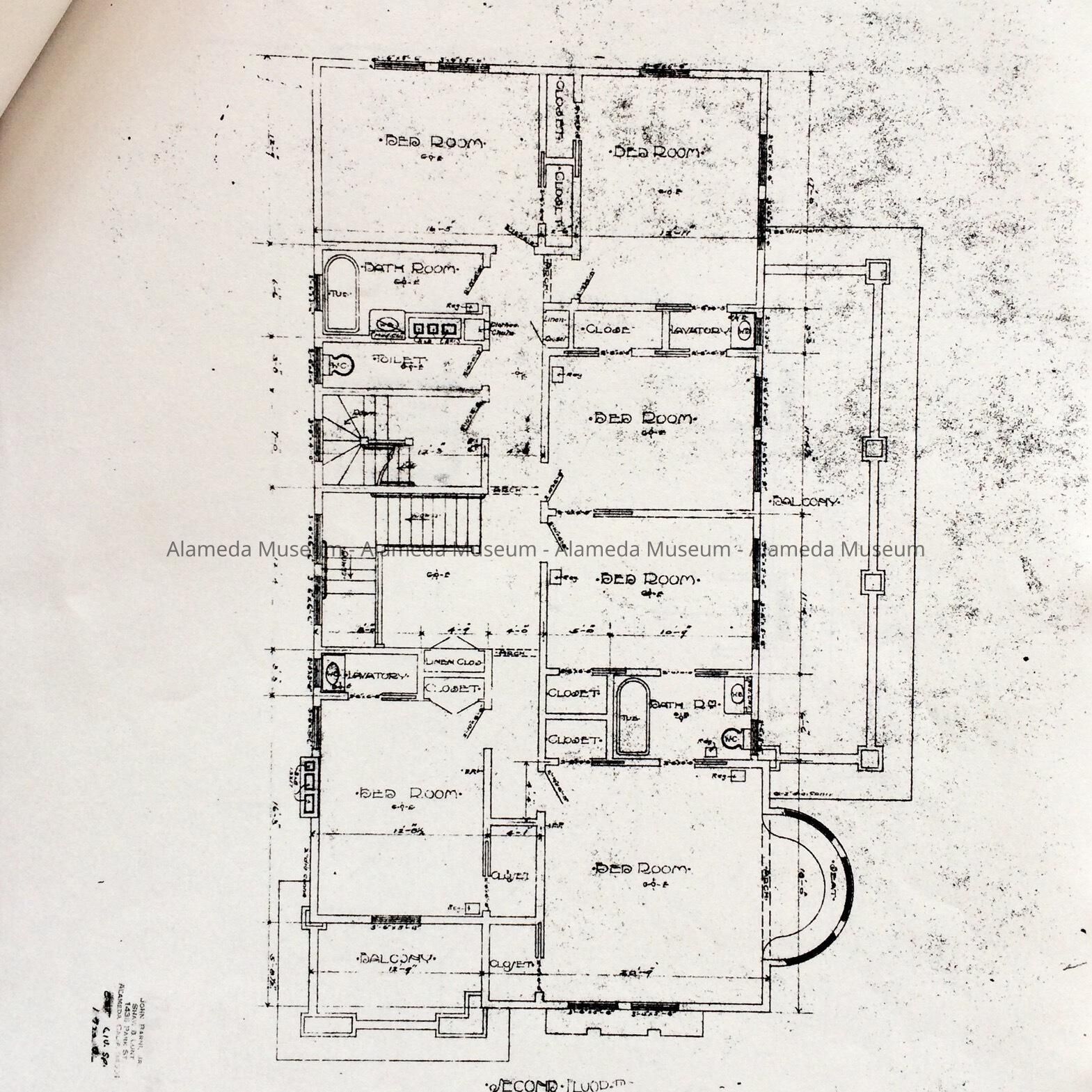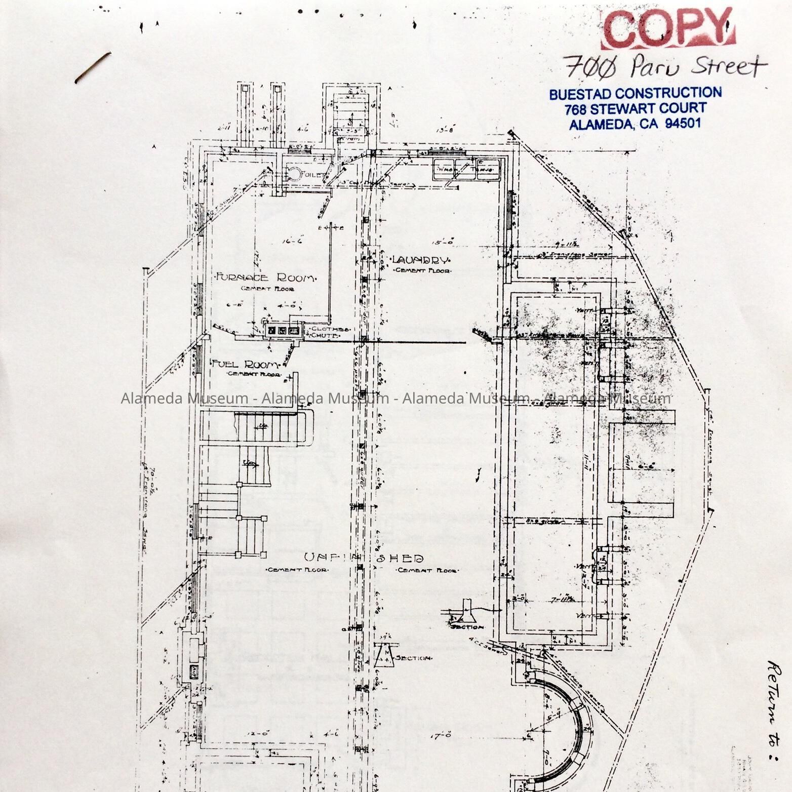 PLANS FOR A HOUSE ERECTED IN 1904 AT 700 PARU STREET, ALAMEDA, FOR ALBERT V CLARK; CUNNINGHAM AND POLITEO, ARCHITECTS. THE PLANS WERE COPIED FOR BUSTAD CONSTRUCTION COMPANY WHO WERE ENGAGED IN REMODELING THE HOUSE.