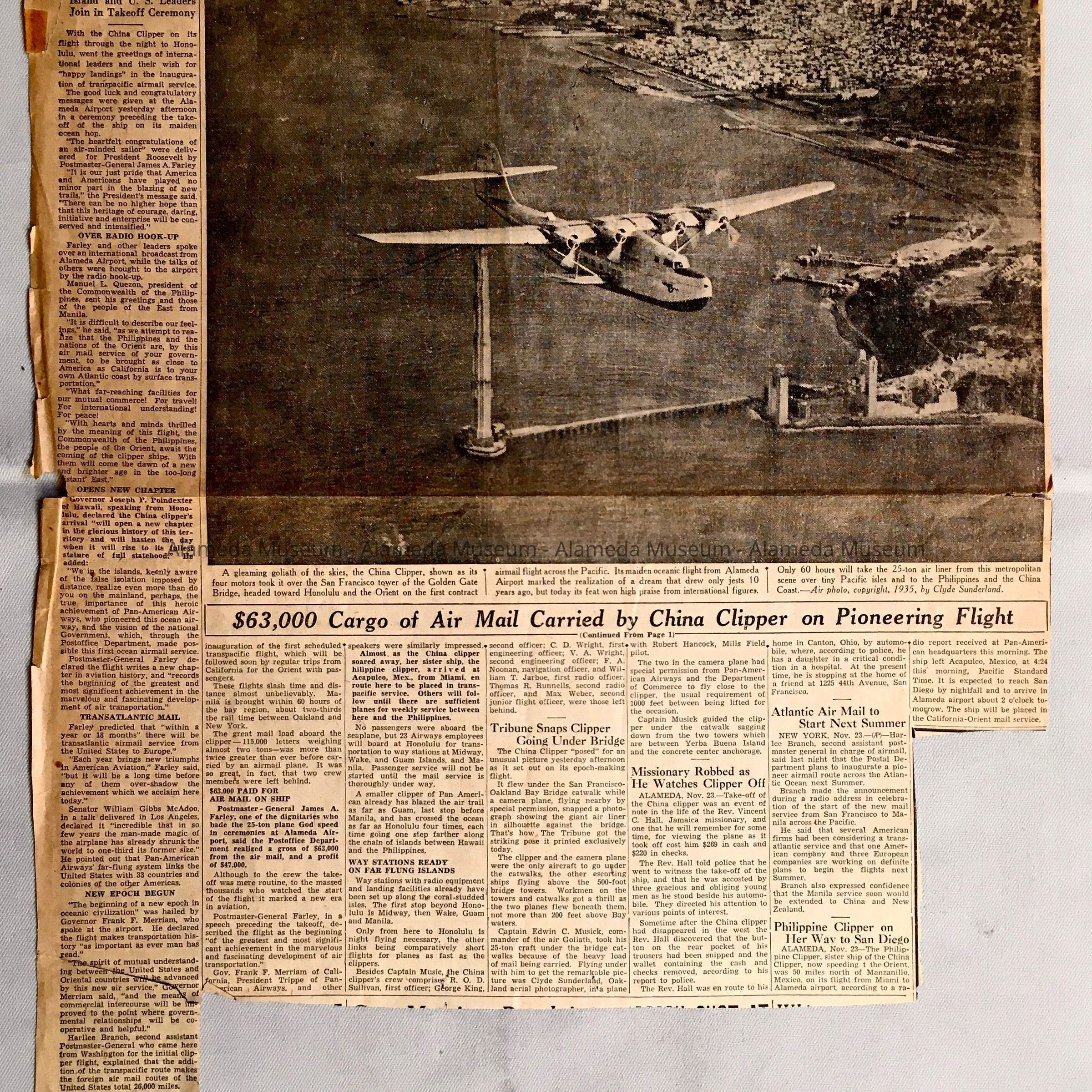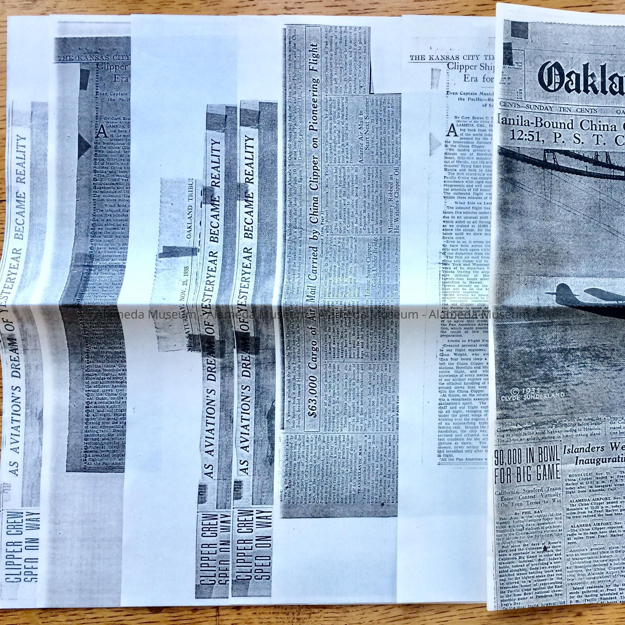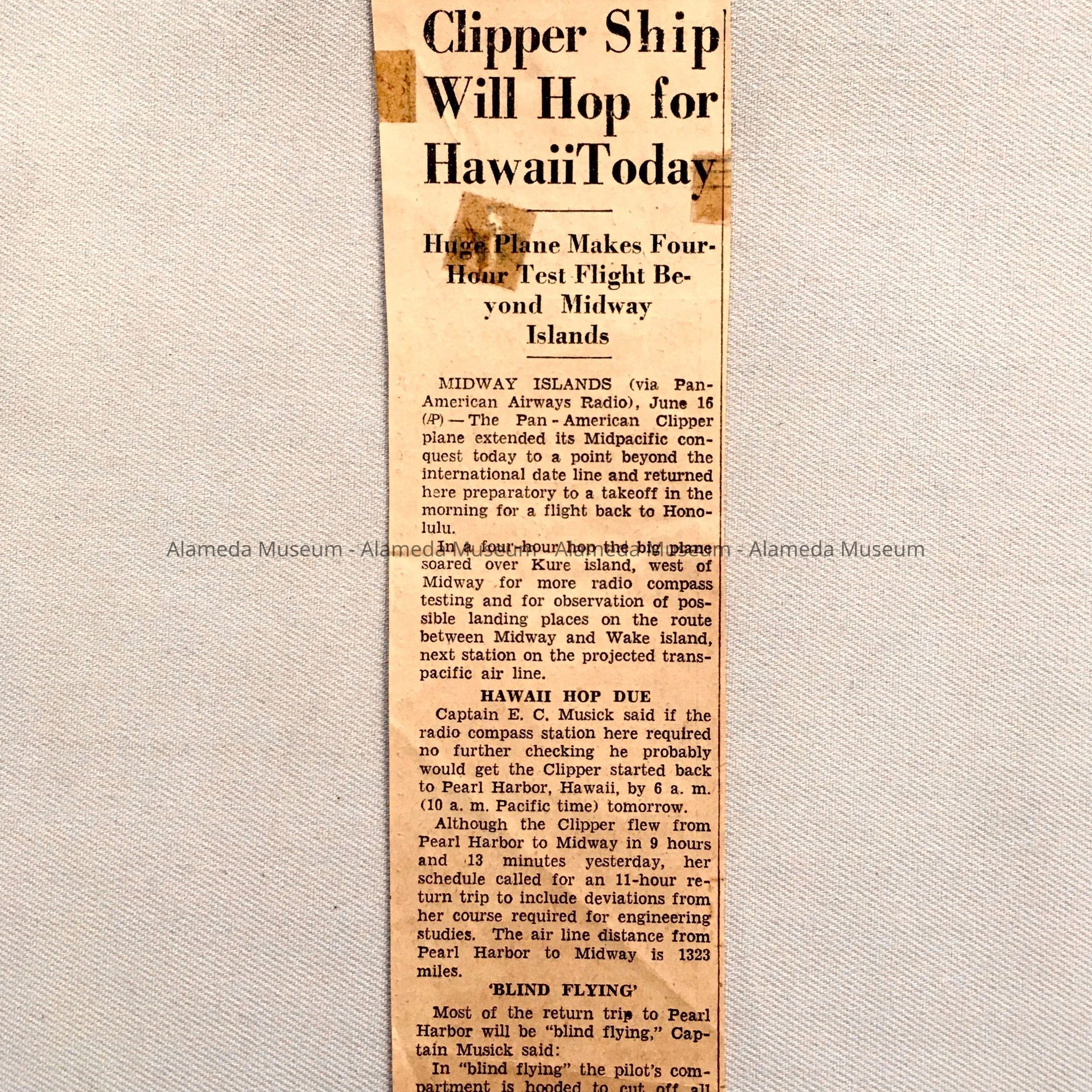 HISTORY OF OBJECTS: NEWSPAPER CLIPPINGS CONCERNING THE PAN AMERICAN CHINA CLIPPER FLIGHT TO HONOLULU, HAWAII FROM ALAMEDA, CALIFORNIA.