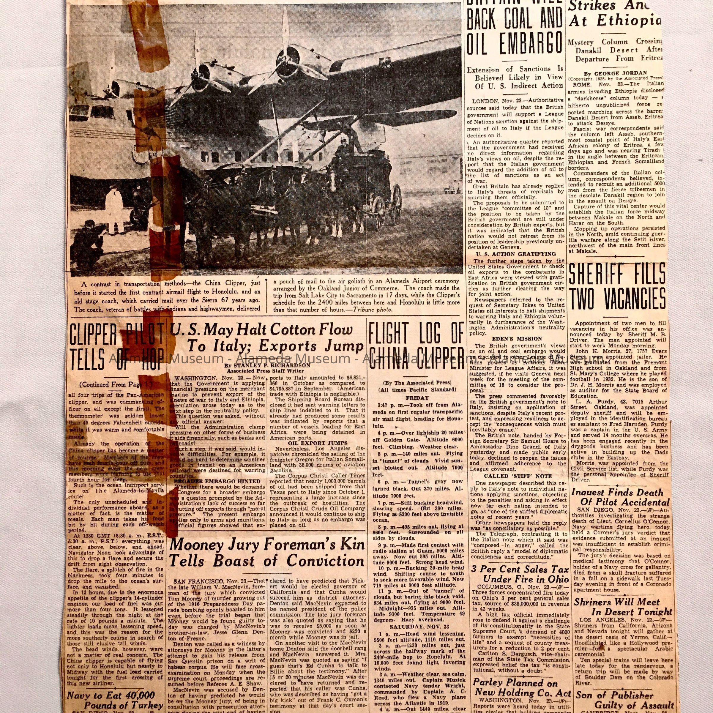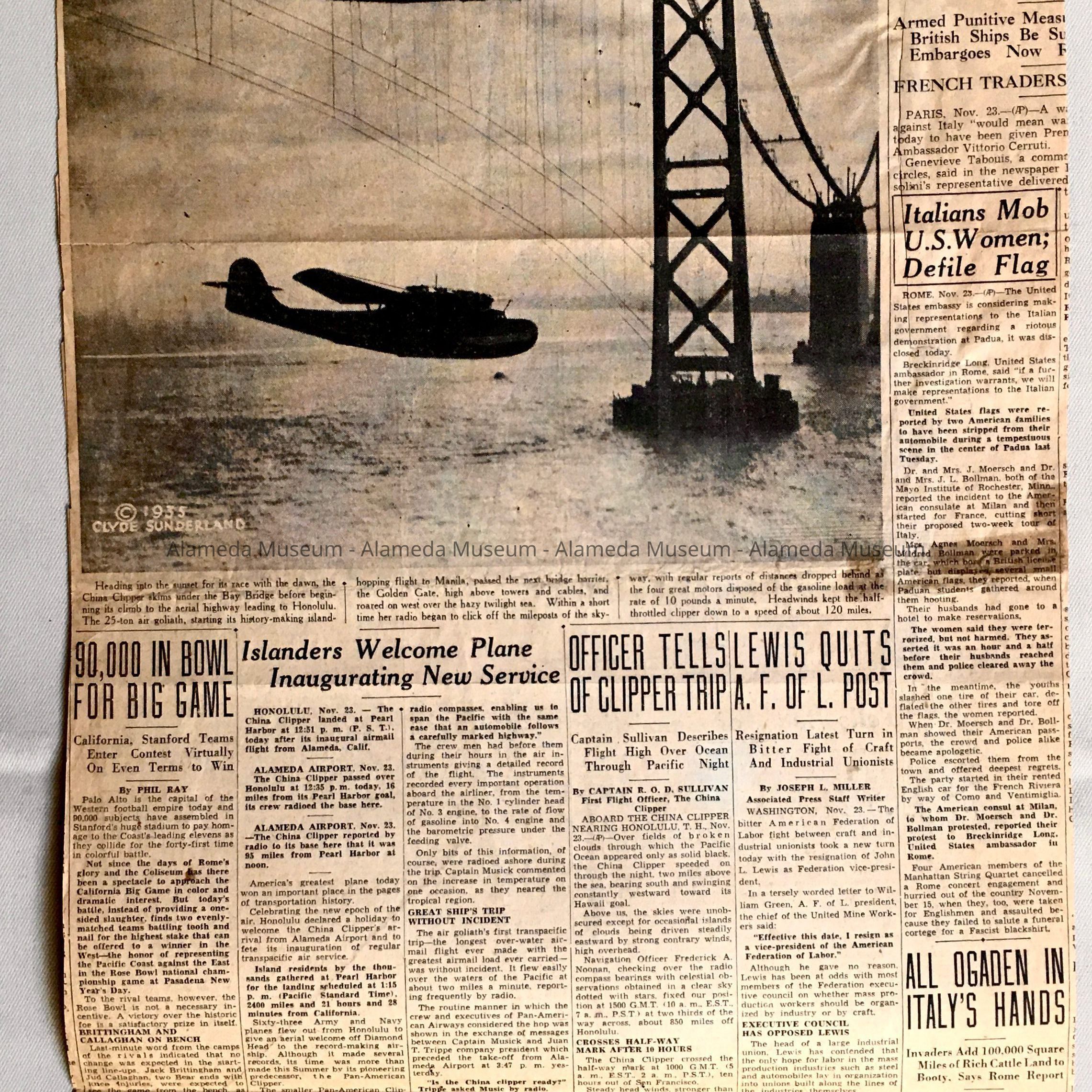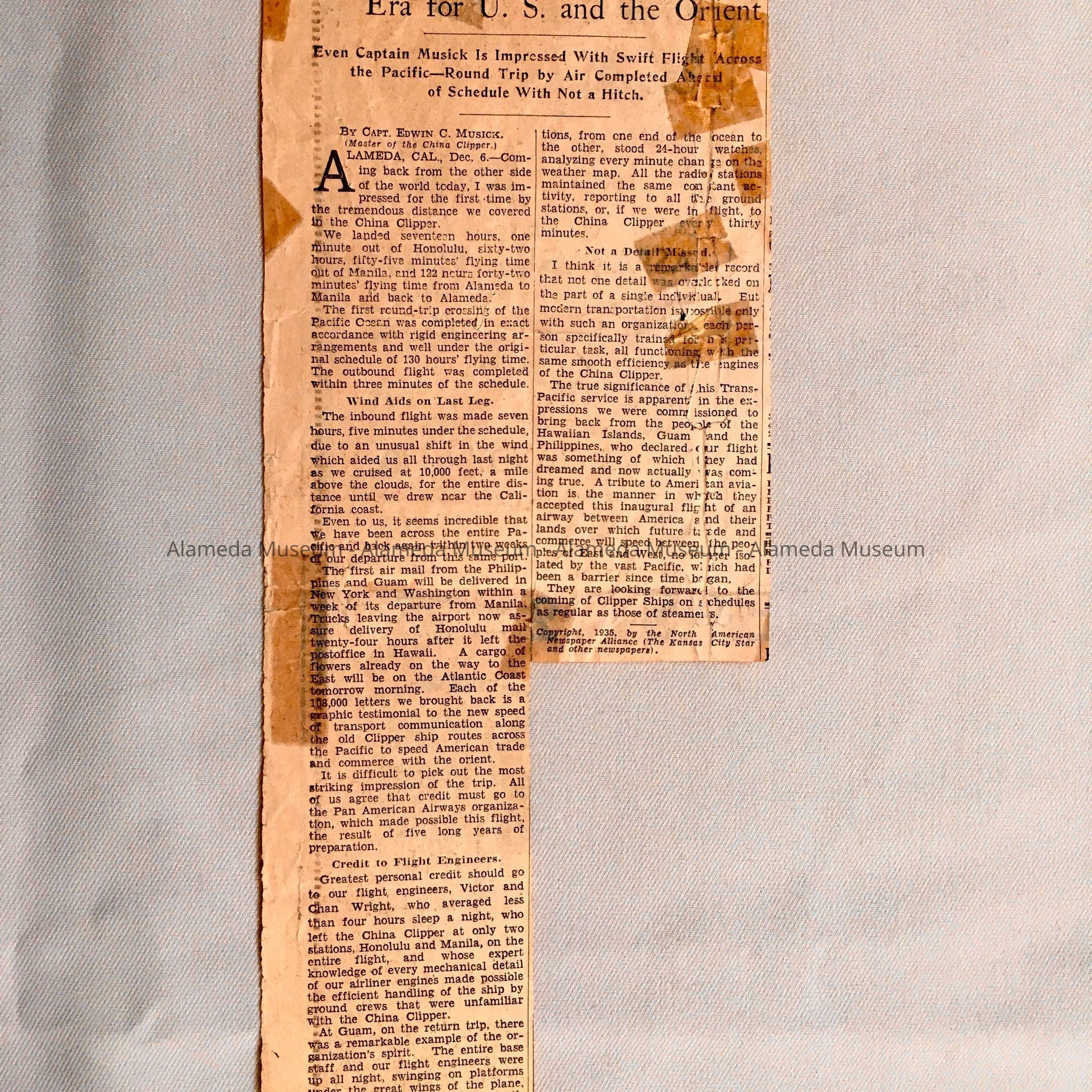 HISTORY OF OBJECTS: NEWSPAPER CLIPPINGS CONCERNING THE PAN AMERICAN CHINA CLIPPER FLIGHT TO HONOLULU, HAWAII FROM ALAMEDA, CALIFORNIA.