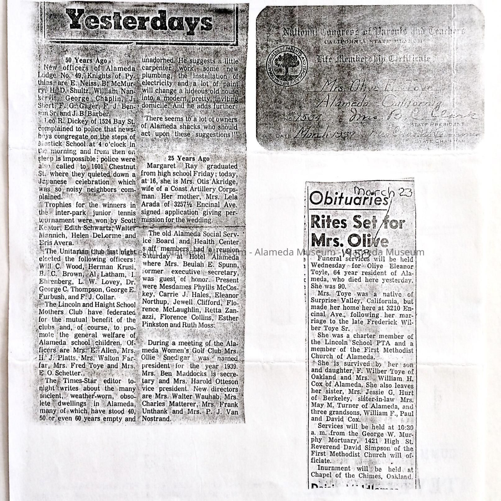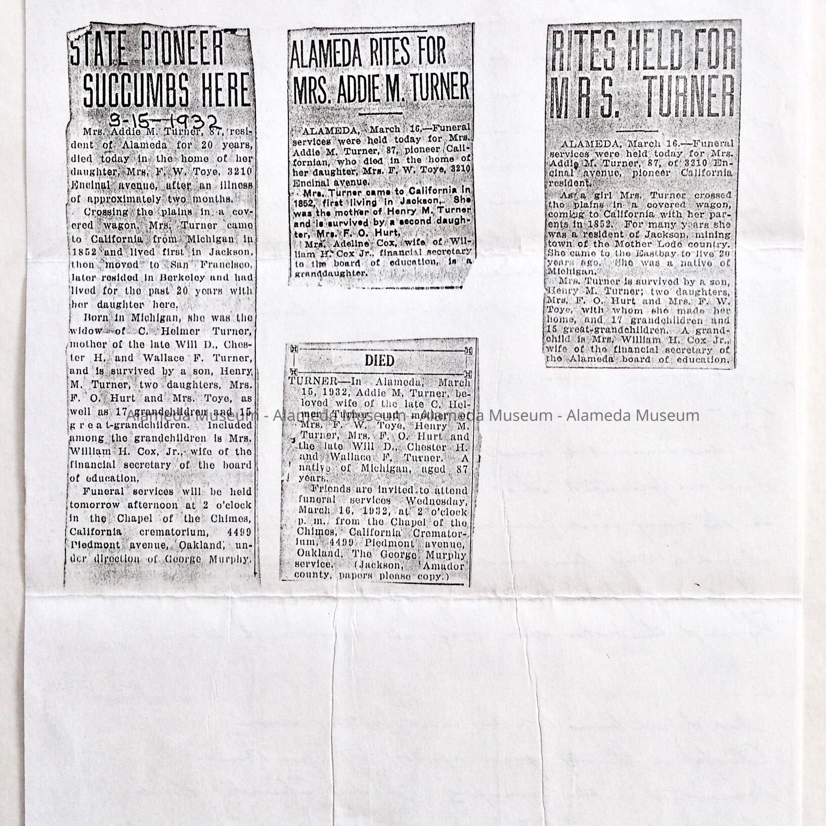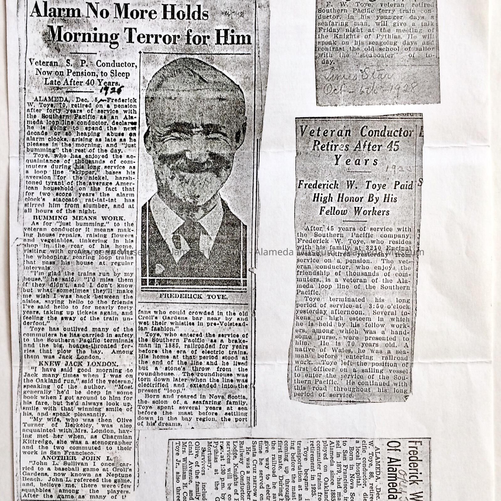 INFORMATION CONCERNING THE TOYE AND COX FAMILIES, FROM THE ARCHIVES OF THE LATE ADELINE TOYE COX. FOLLOWING INFORMATION IS INCLUDED: EMPLOYMENT OF WILLIAM COX, JR, HUSBAND OF ADELINE; OBITUARY FOR MRS OLIVE TOYE, WIFE OF FREDERICK W; RETIREMENT OF FREDERICK FROM SOUTHERN PACIFIC RAILROAD IN 1925; MRS ADDIE M TUPNER, MOTHER OF MRS WILLIAM TOYE; GENERAL CLIPPINGS RELATIVE TO THE FAMILY. INFORMATION IS INCLUDED CONCERNING THE ORIGINAL OWNERS OF THE SEWING BOX (CATALOG NO. 04.67.2) OWNED BY ADDIE M TURNER, MOTHER OF MRS TOYE, ETC.
