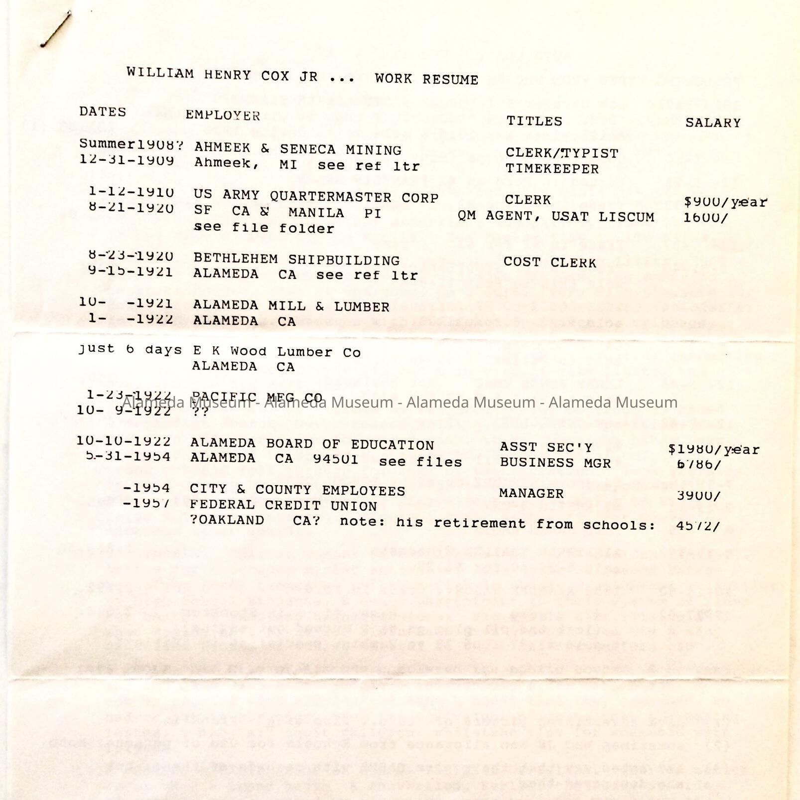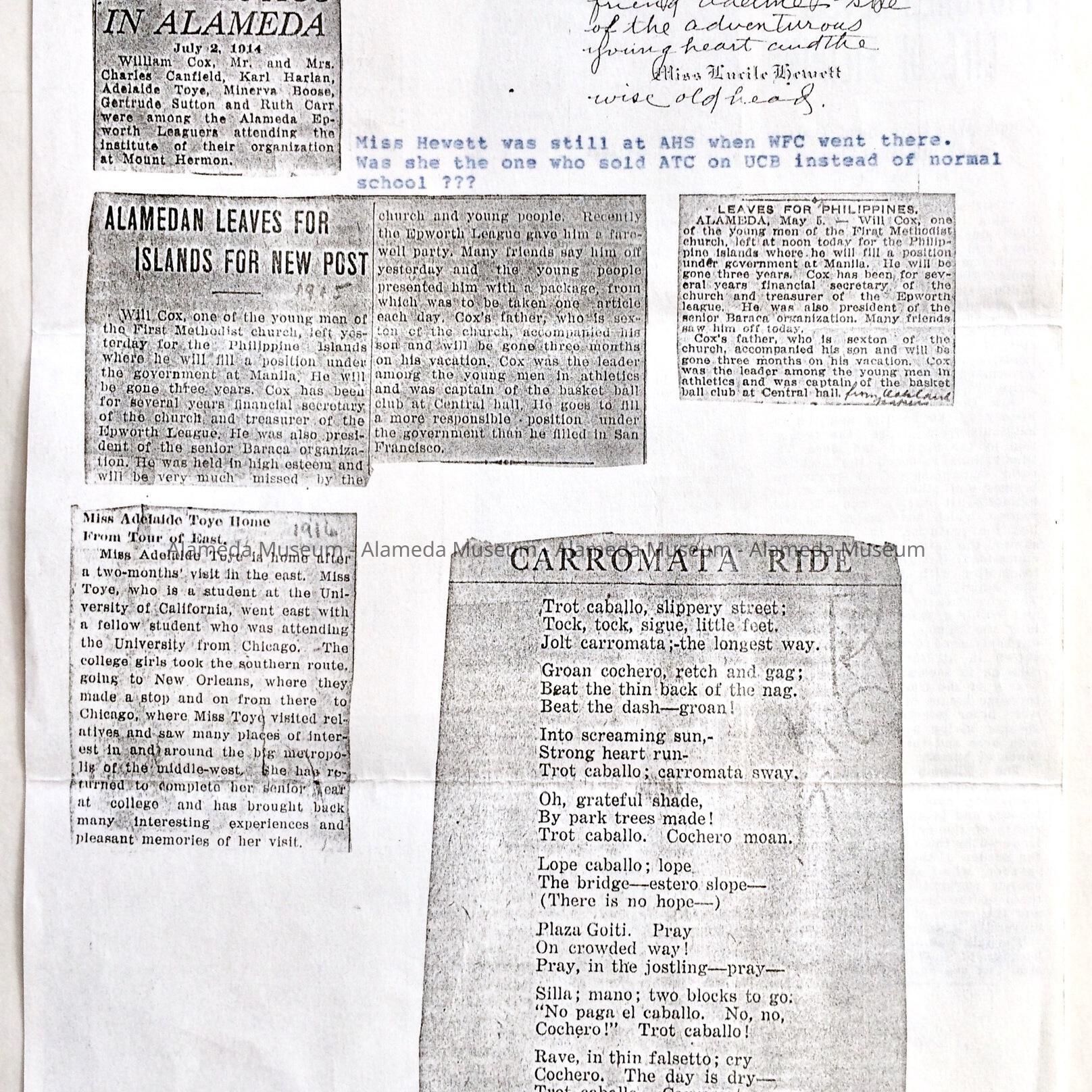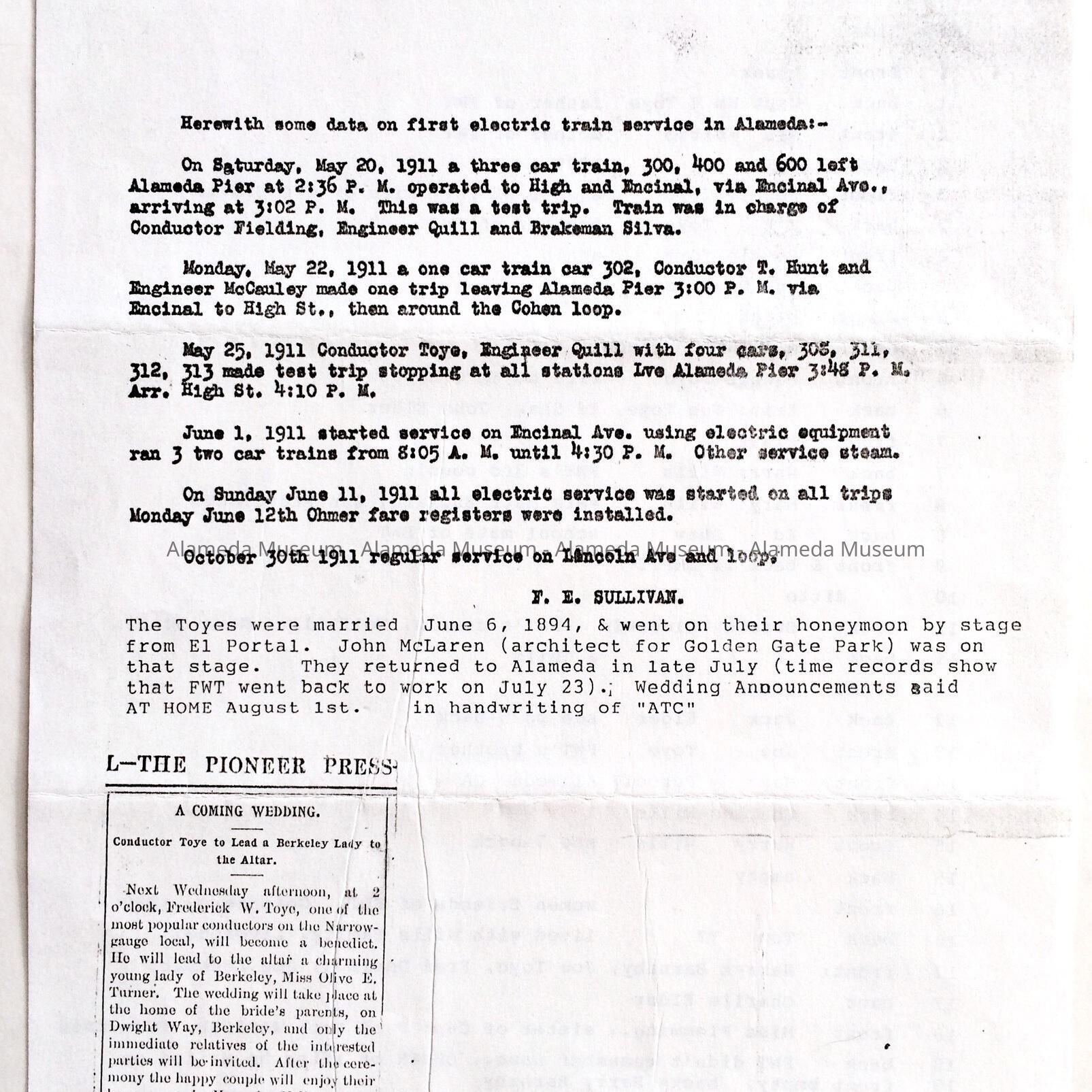 INFORMATION CONCERNING THE TOYE AND COX FAMILIES, FROM THE ARCHIVES OF THE LATE ADELINE TOYE COX. FOLLOWING INFORMATION IS INCLUDED: EMPLOYMENT OF WILLIAM COX, JR, HUSBAND OF ADELINE; OBITUARY FOR MRS OLIVE TOYE, WIFE OF FREDERICK W; RETIREMENT OF FREDERICK FROM SOUTHERN PACIFIC RAILROAD IN 1925; MRS ADDIE M TUPNER, MOTHER OF MRS WILLIAM TOYE; GENERAL CLIPPINGS RELATIVE TO THE FAMILY. INFORMATION IS INCLUDED CONCERNING THE ORIGINAL OWNERS OF THE SEWING BOX (CATALOG NO. 04.67.2) OWNED BY ADDIE M TURNER, MOTHER OF MRS TOYE, ETC.