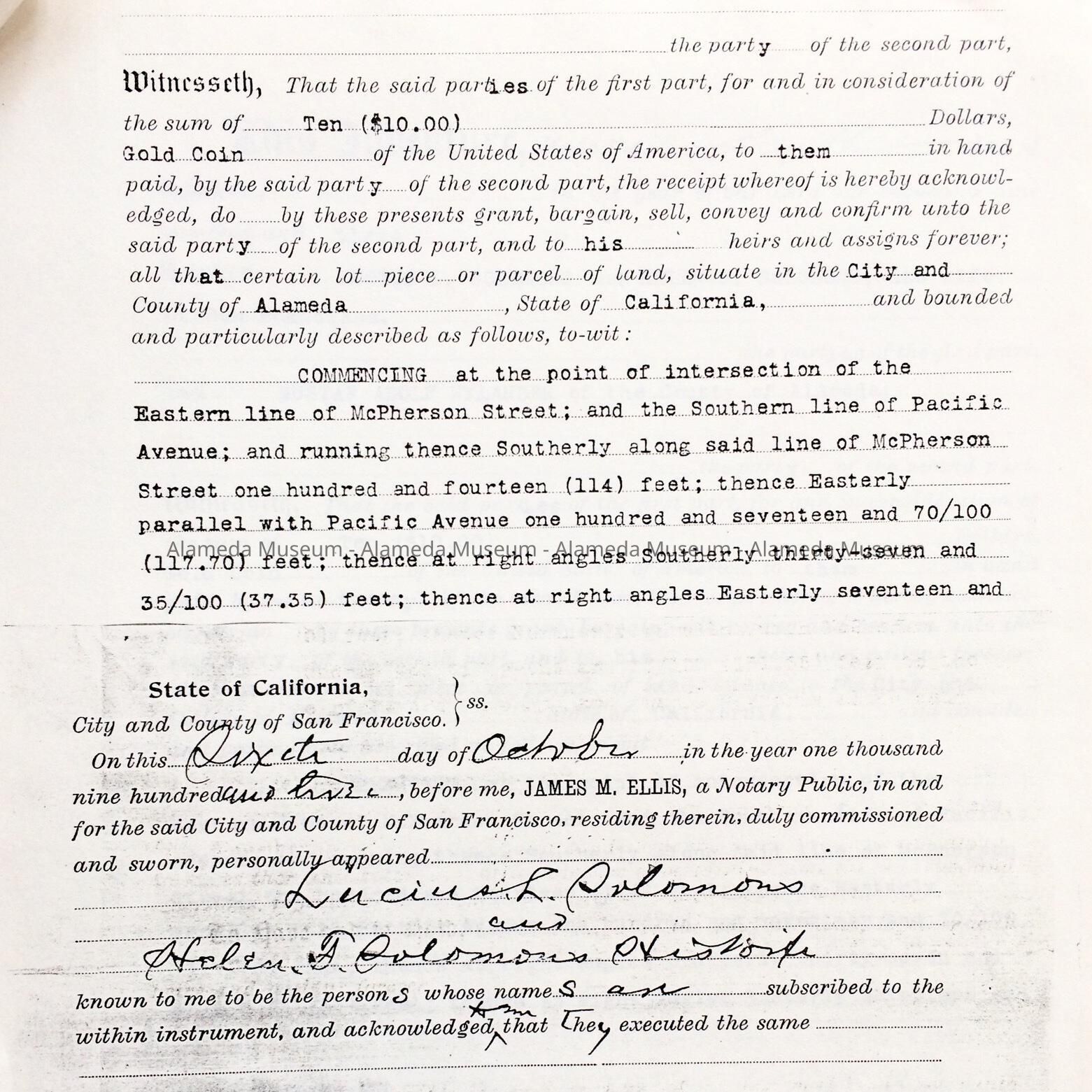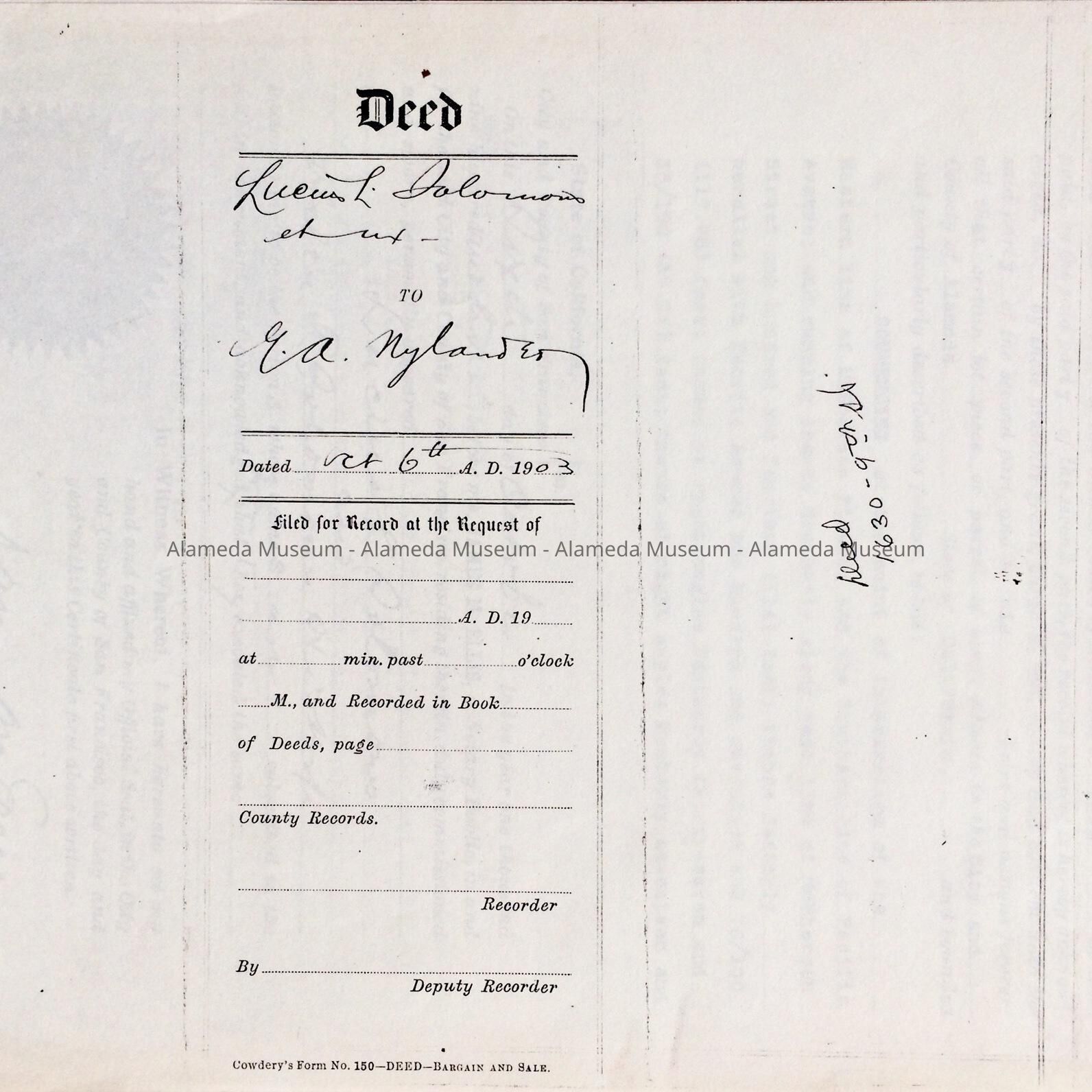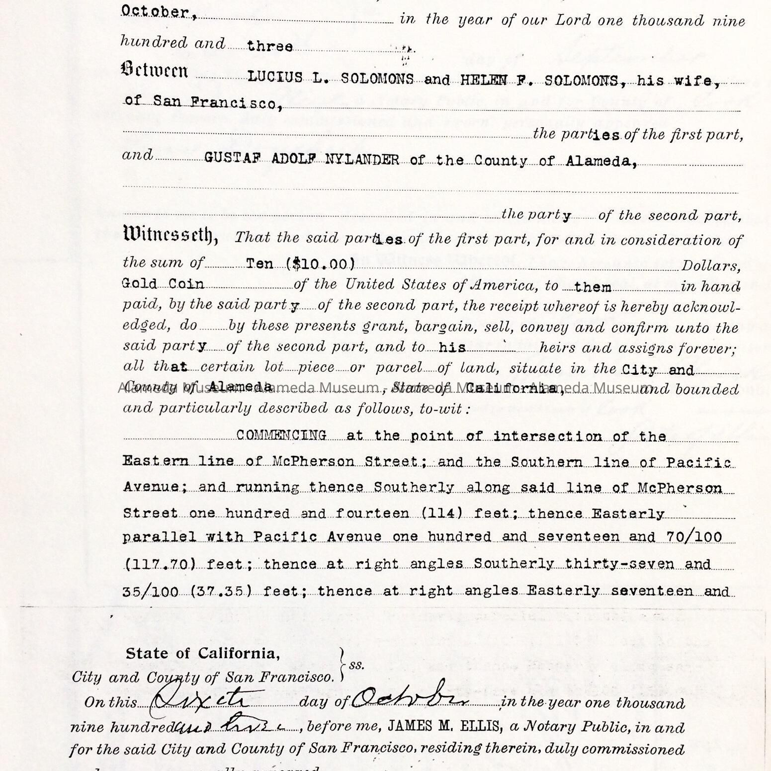 PHOTOCOPIES OF DEEDS FOR PROPERTY KNOWN AS 1630 NINTH STREET, ALAMEDA, CALIFORNIA. ONE DEED IS AN INDENTURE BETWEEN LUCIOUS L. AND HELEN F. SOLOMONS --- TO GUSTAF ADOLPH NYLANDER, GRANDFATHER OF THE DONOR; DATED OCTOBER 6, 1903. THE PROPERTY HAS BEEN IN THE POSSESSION OF THE NYLANDER FAMILY AND DESCENDANTS SINCE 1903.