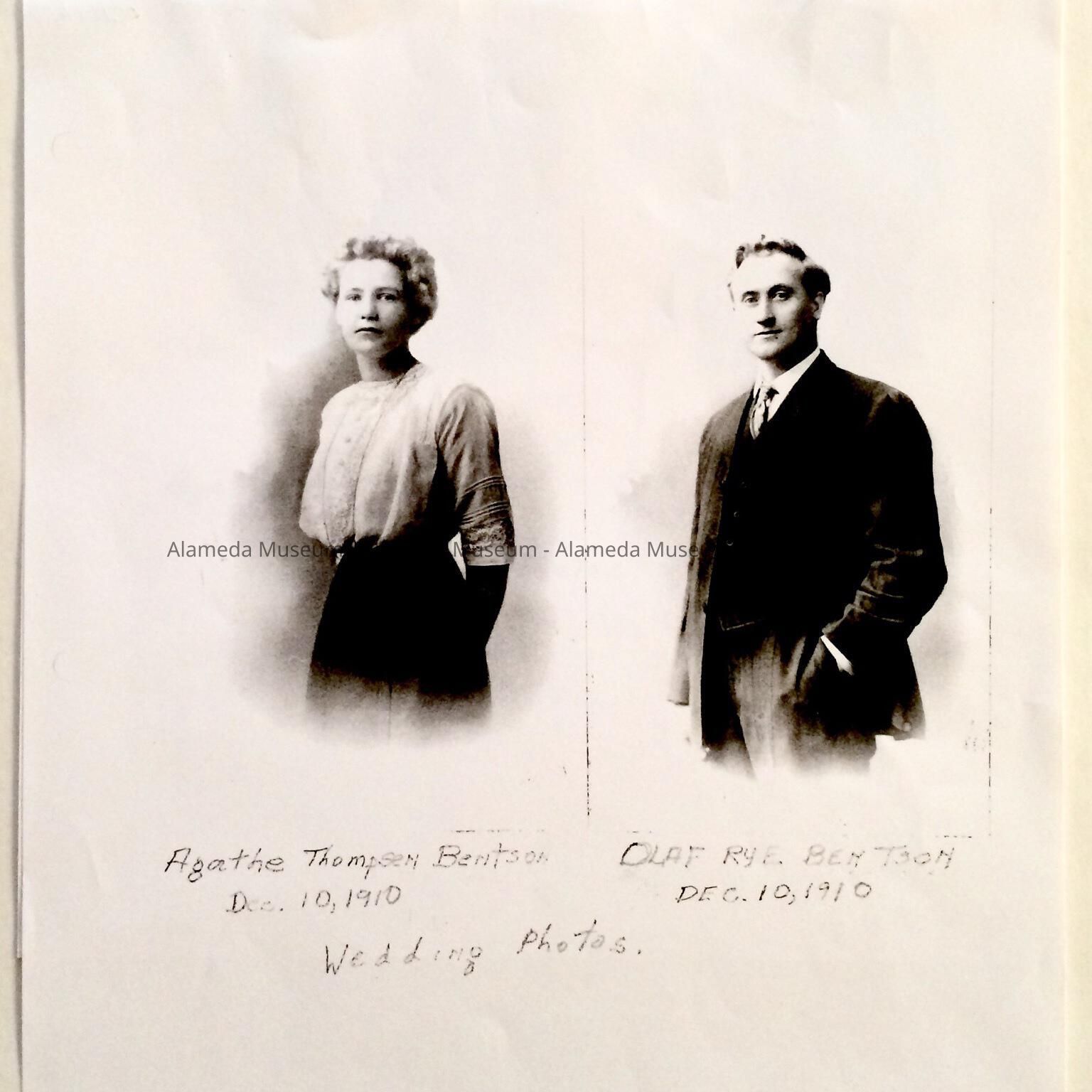 WEDDING PHOTOGRAPHS (PHOTOCOPIED) OF AGATHE THOMSEN AND HUSBAND, OLAF RYE BENTSON, WHO WERE MARRIED ON DECEMBER 10, 1910. THE BRIDE AND GROOM BECAME PARENTS OF THE DONOR.
