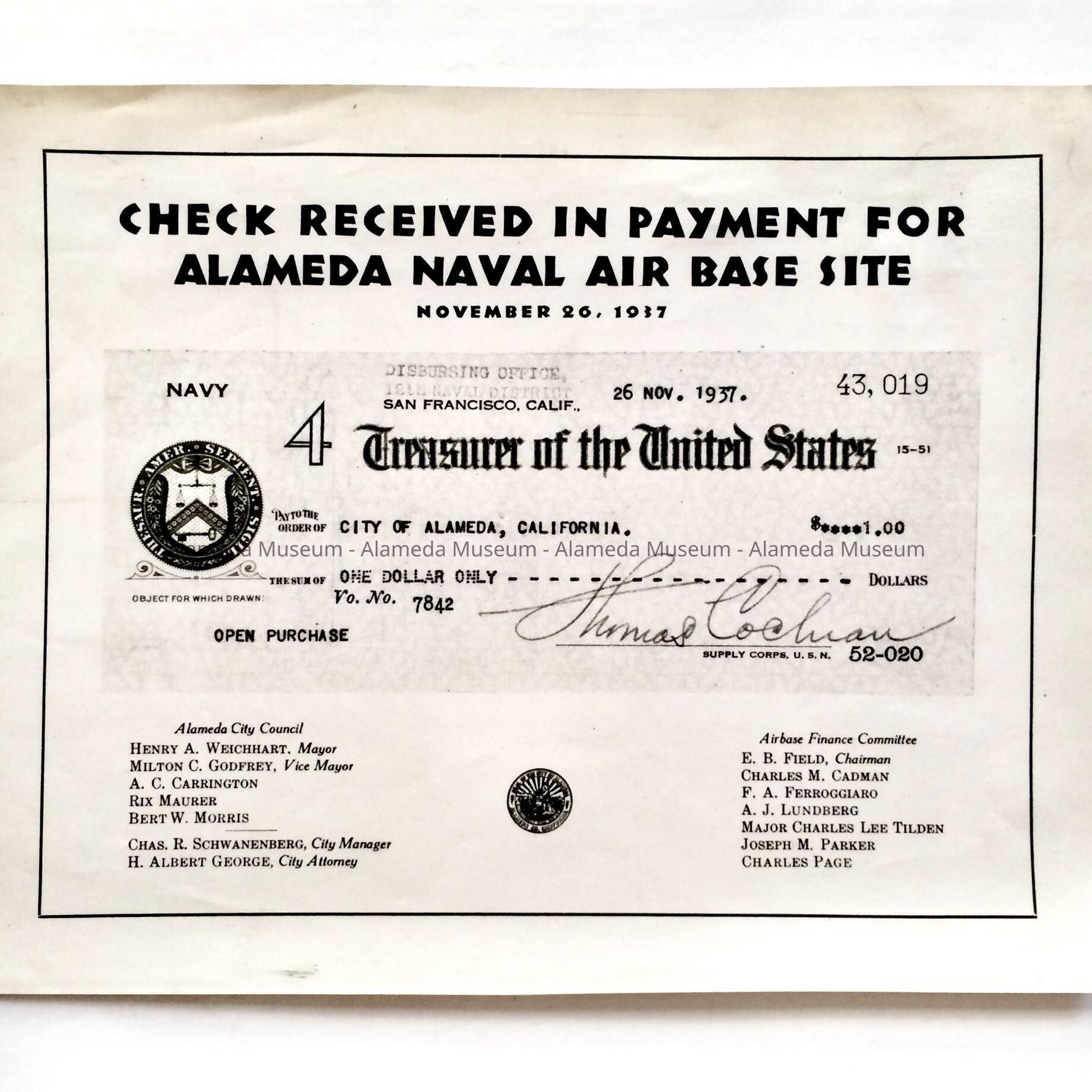 COPY OF A CHECK, ISSUED TO THE CITY OF ALAMEDA, FOR ONE DOLLAR ($1.00), AND DATED NOVEMBER 26, 1937, FOR PROPERTY THAT WOULD BECOME THE NAVAL AIR STATION. THE ORIGINAL CHECK IS FRAMED AND IS DISPLAYED AT THE ALAMEDA CITY HALL.