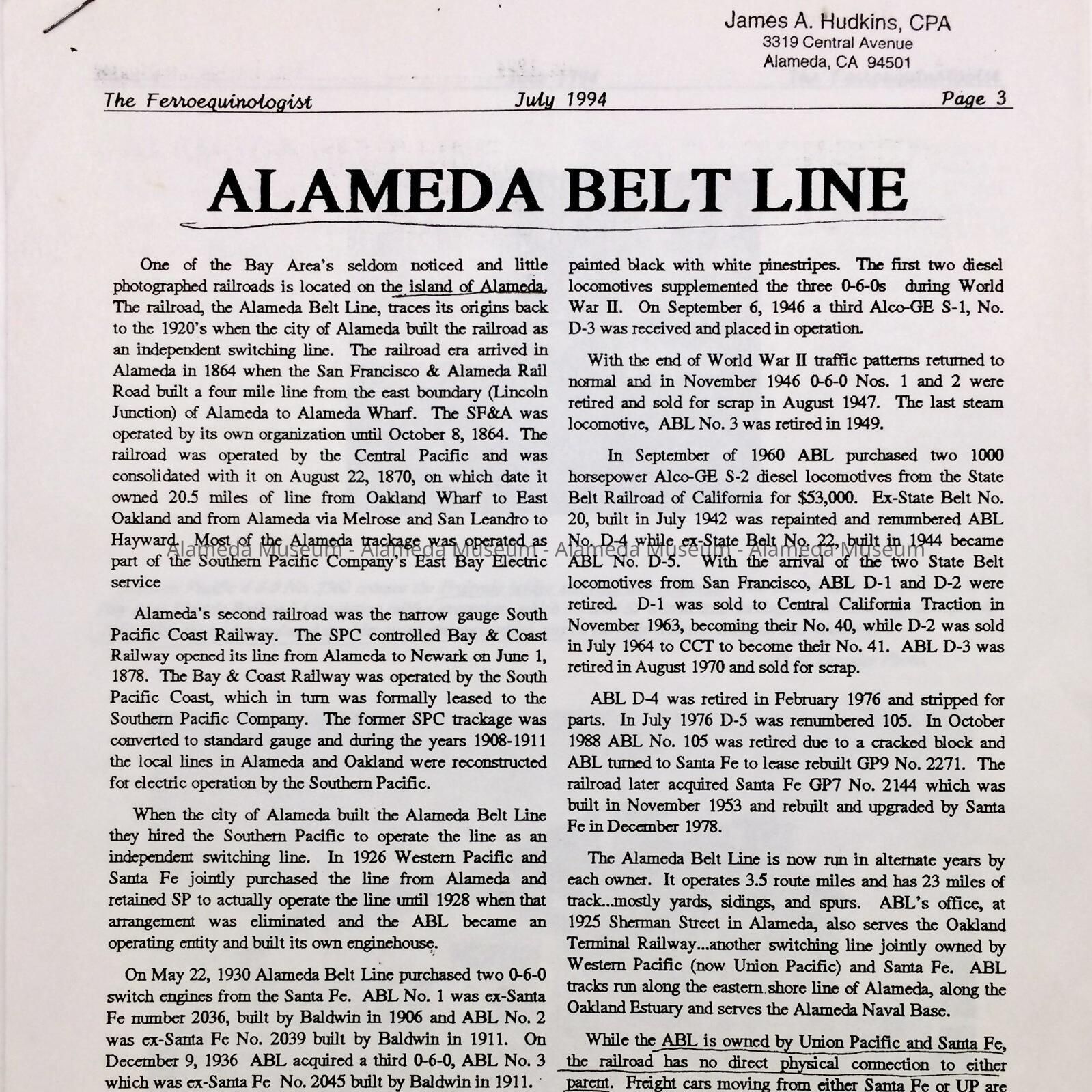 History of Object: Article reproduced from the "Ferroequinologist", a railroad publication, concerning the history of the Alameda Belt Line.