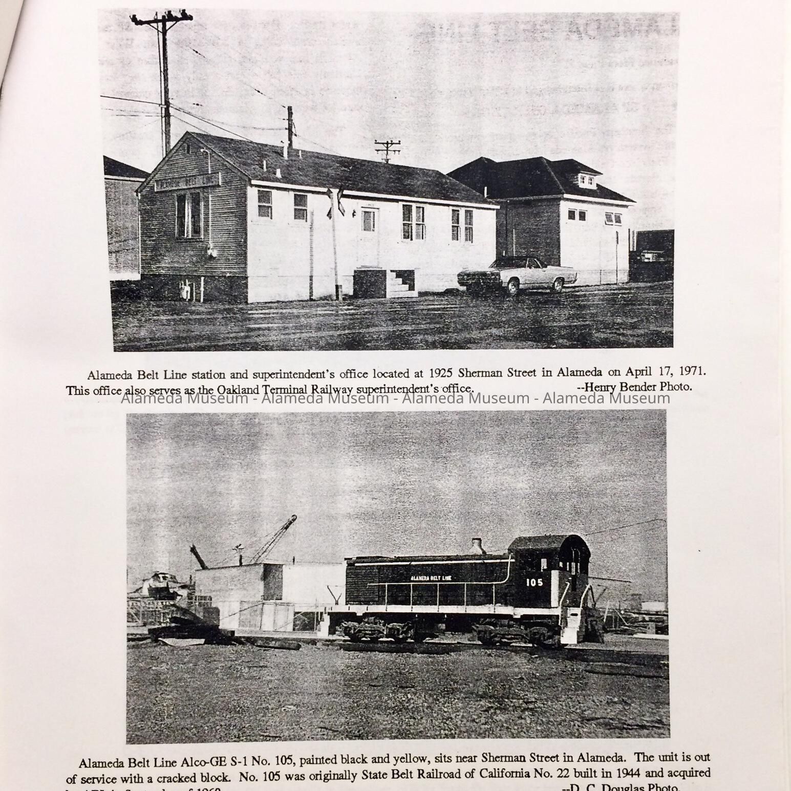 Description: Two copies of a photo-copied article with illustrations. Opening page has bold printed caption: "Alameda Belt Line" in black colored type.