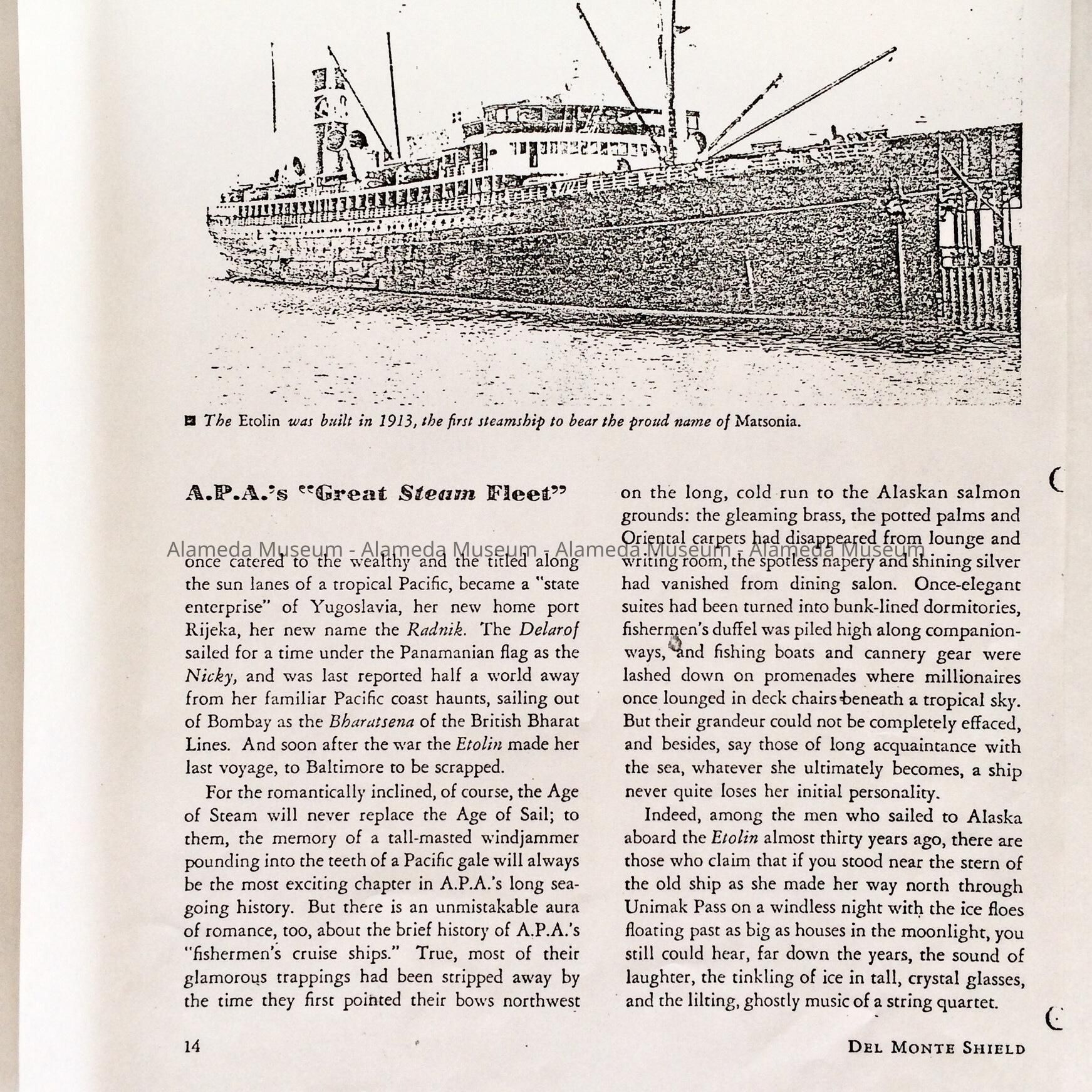 Copy of an article that appeared in the publication "Del Monte Shield", Volume 3, 1965, concerning some of the Alaska Packers fleet.