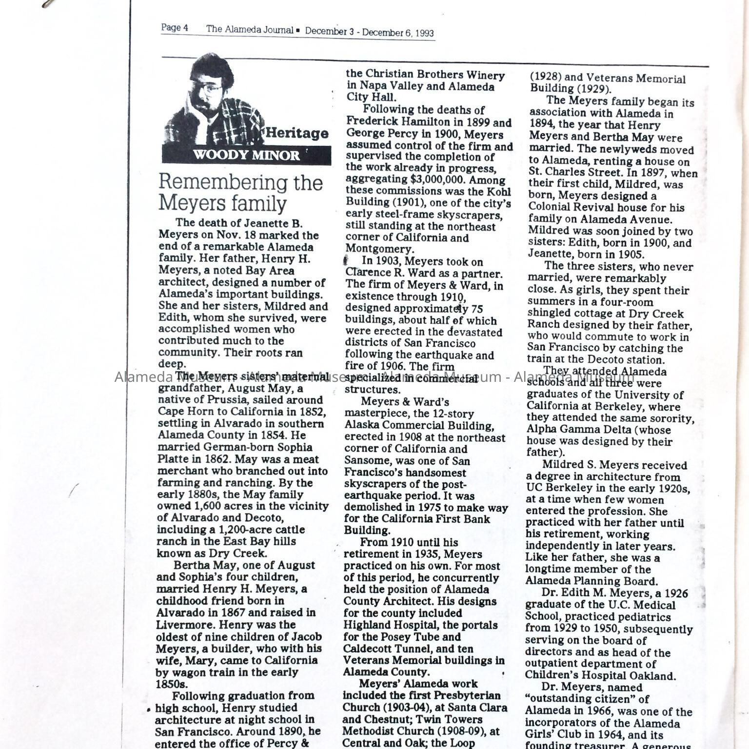 History of Object: Copy of article by Woody Minor for the 'Heritage' column from the Alameda Journal, which appeared on page 4 on the December 3-December 6, 1993 edition. The article was prompted by the death of Jeanette Meyers, the last of the Meyers family, on November 18, 1993. Minor described the history of the family, and recounted meeting Jeanette.