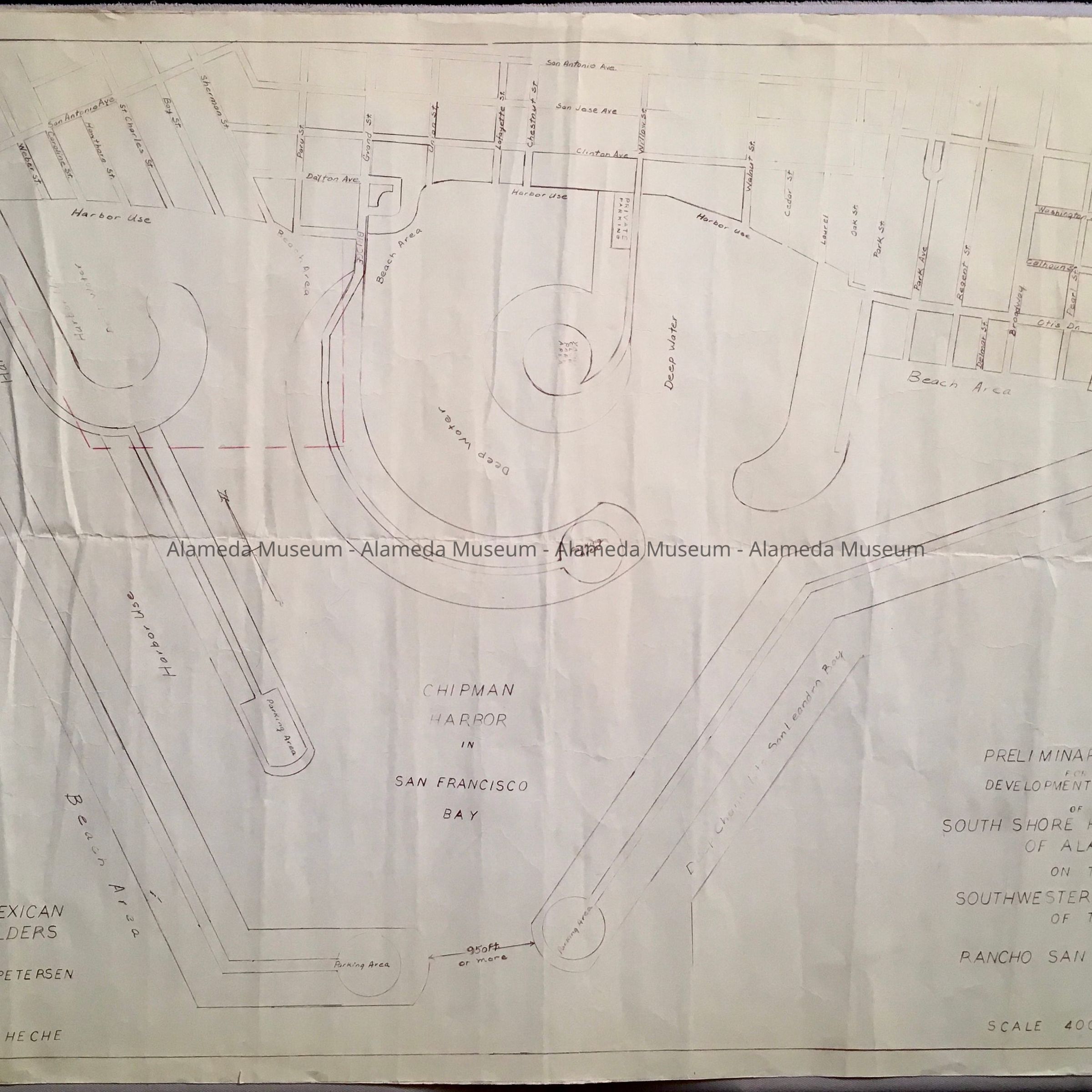 History of Object: A: Drawing representing the proposed develop of South Shore predicated on the court decision of Petersen & Heche vs. Utah Construction Company. Petersen & Heche based their case on the fact that early property descriptions extended into the bay.