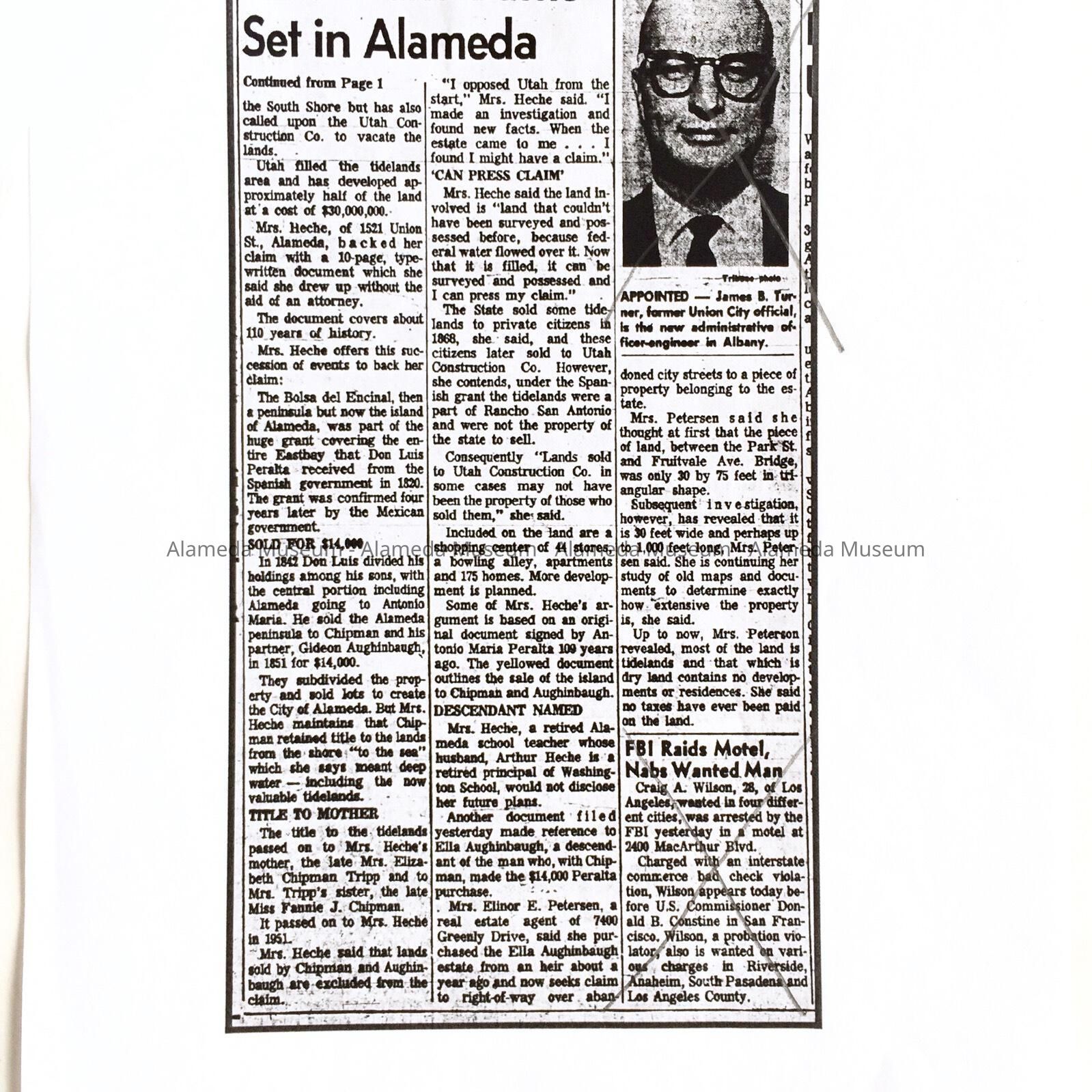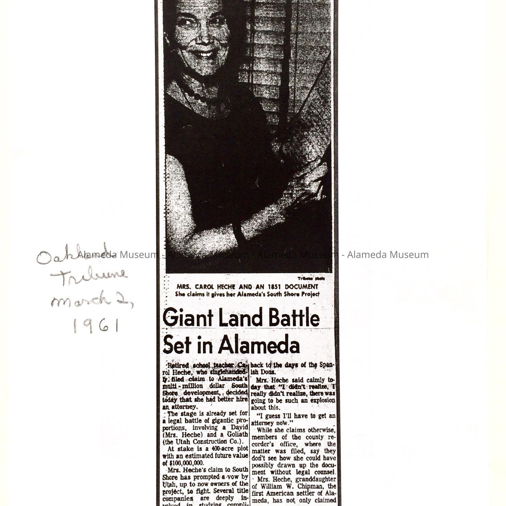 B: article from the Oakland Tribune of March 2, 1961, describing the nature of the claim filed on the tidelands filled by the Utah Construction Company, by Mrs. Heche, descendant of co-founder W.W. Chipman. Also mentions Ella Aughinbaugh, a descendant of co-founder Gideon Aughinbaugh.