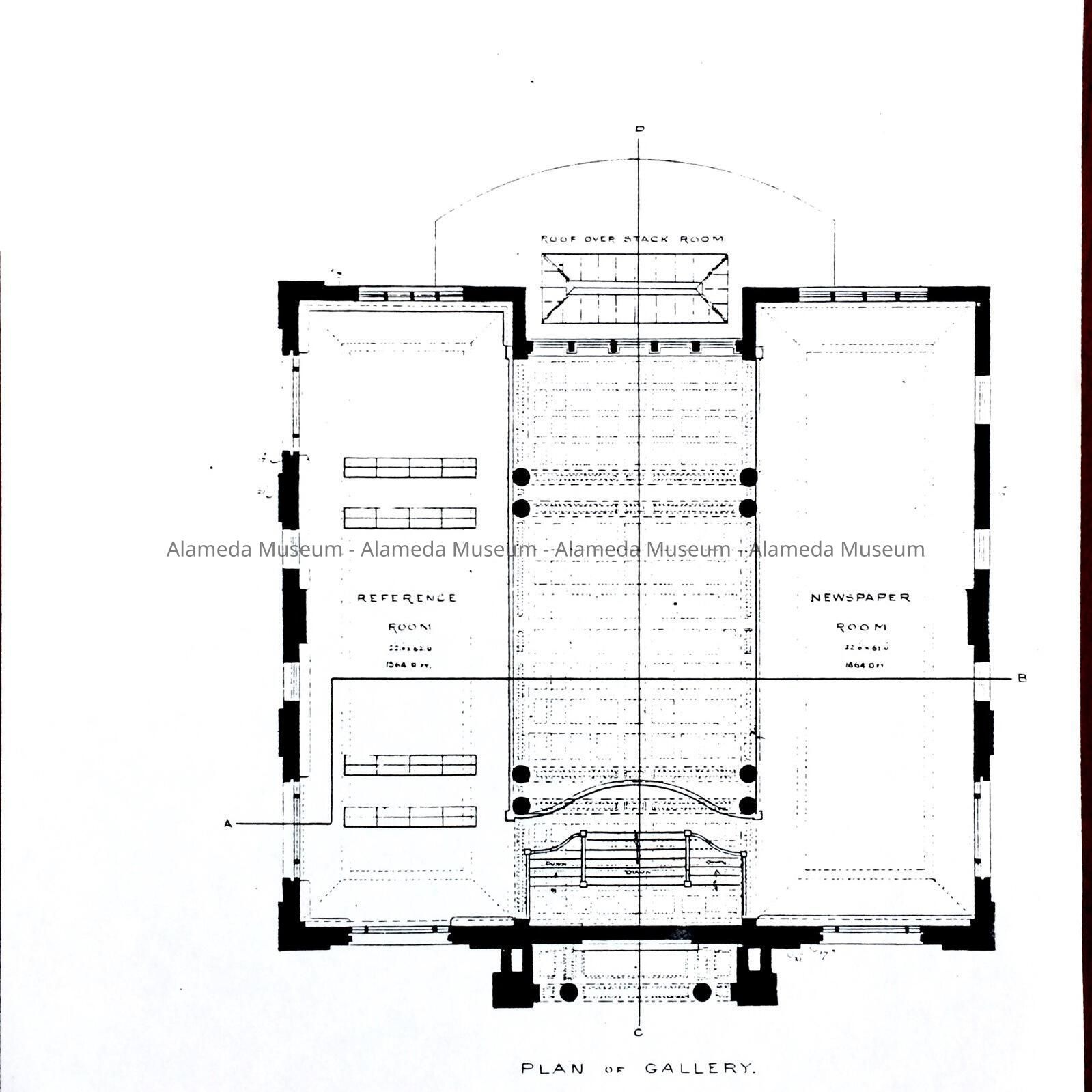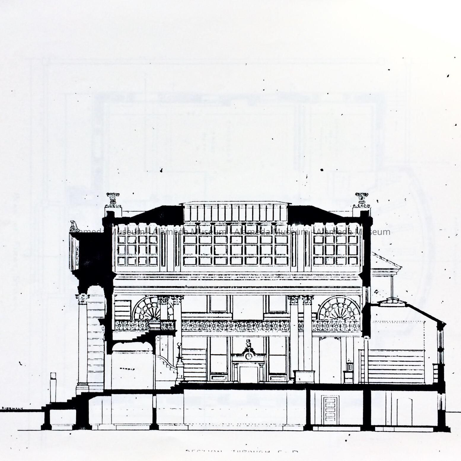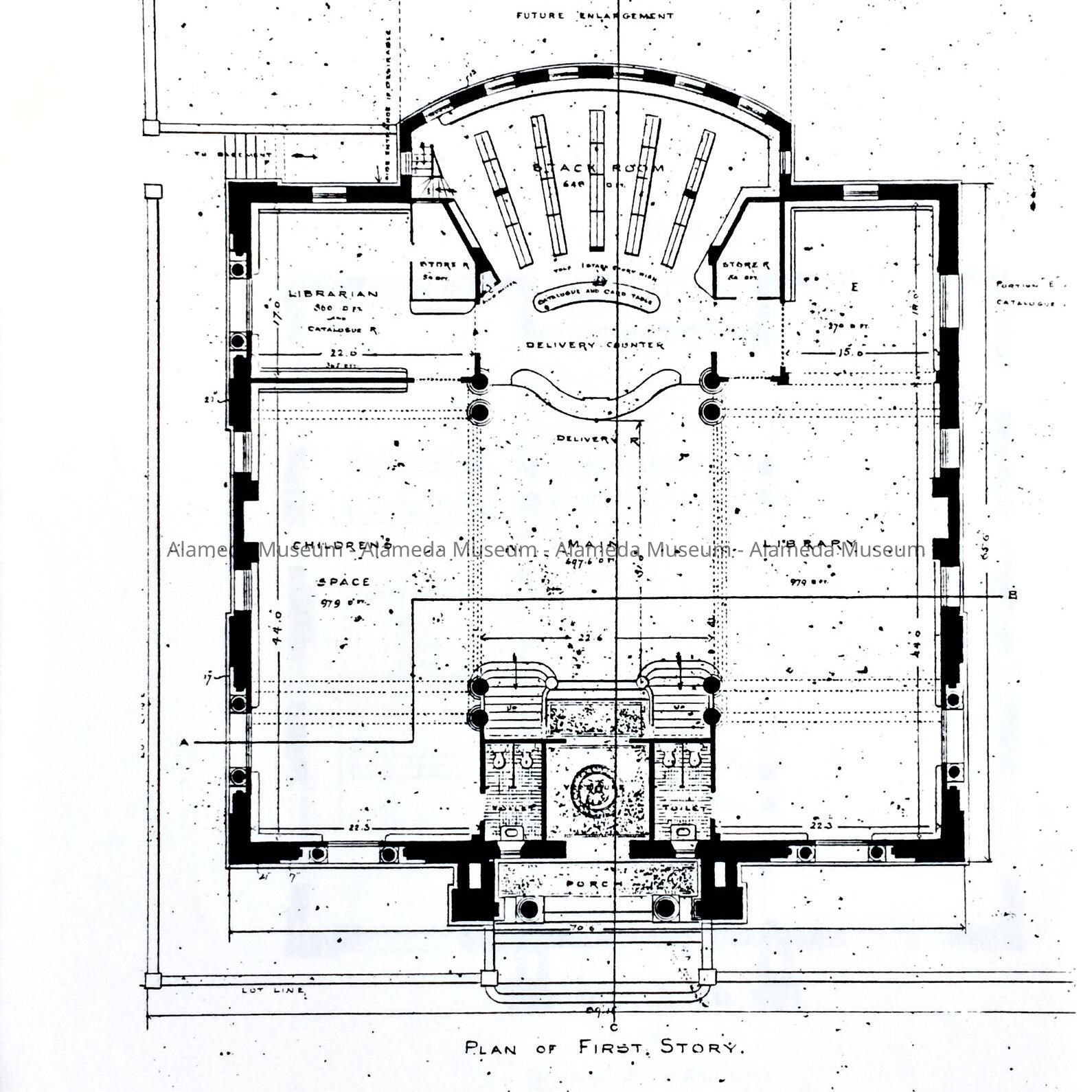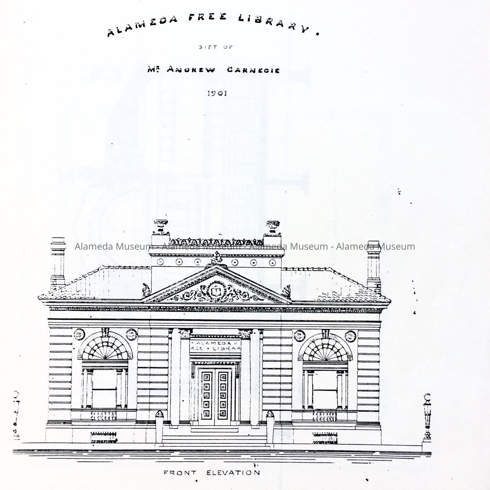 HISTORY OF OBJECT: EXTERIOR AND INTERIOR BLUEPRINT DRAWINGS OF THE ALAMEDA FREE LIBRARY, A GIFT OF ANDREW CARNEGIE.
