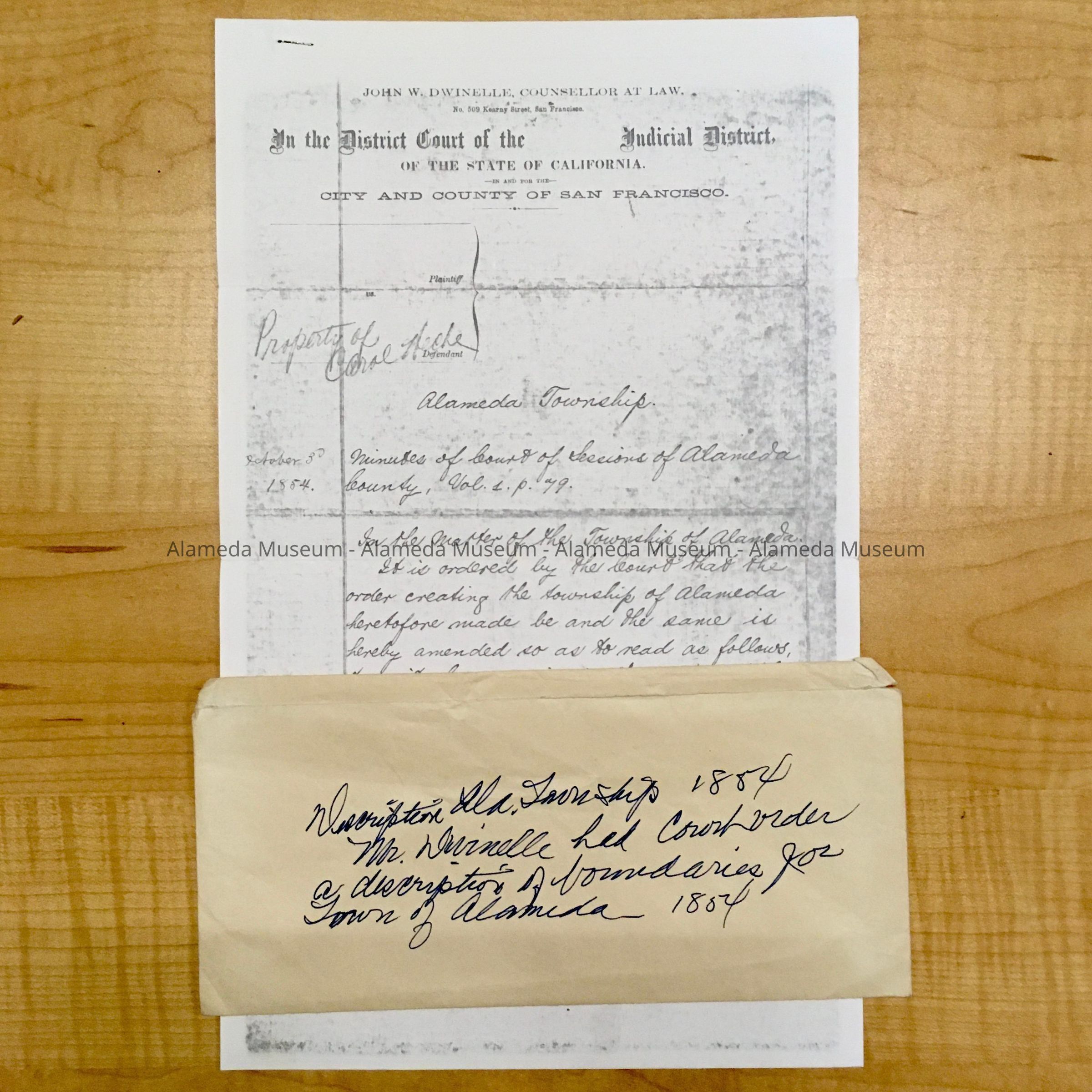 History of Object: Duplicate copy of a hand-written document that describes the boundaries of the original Alameda Township from the minutes of the Court of Sessions of Alameda County, Vol. I, p. 79, dated Oct. 3, 1854.