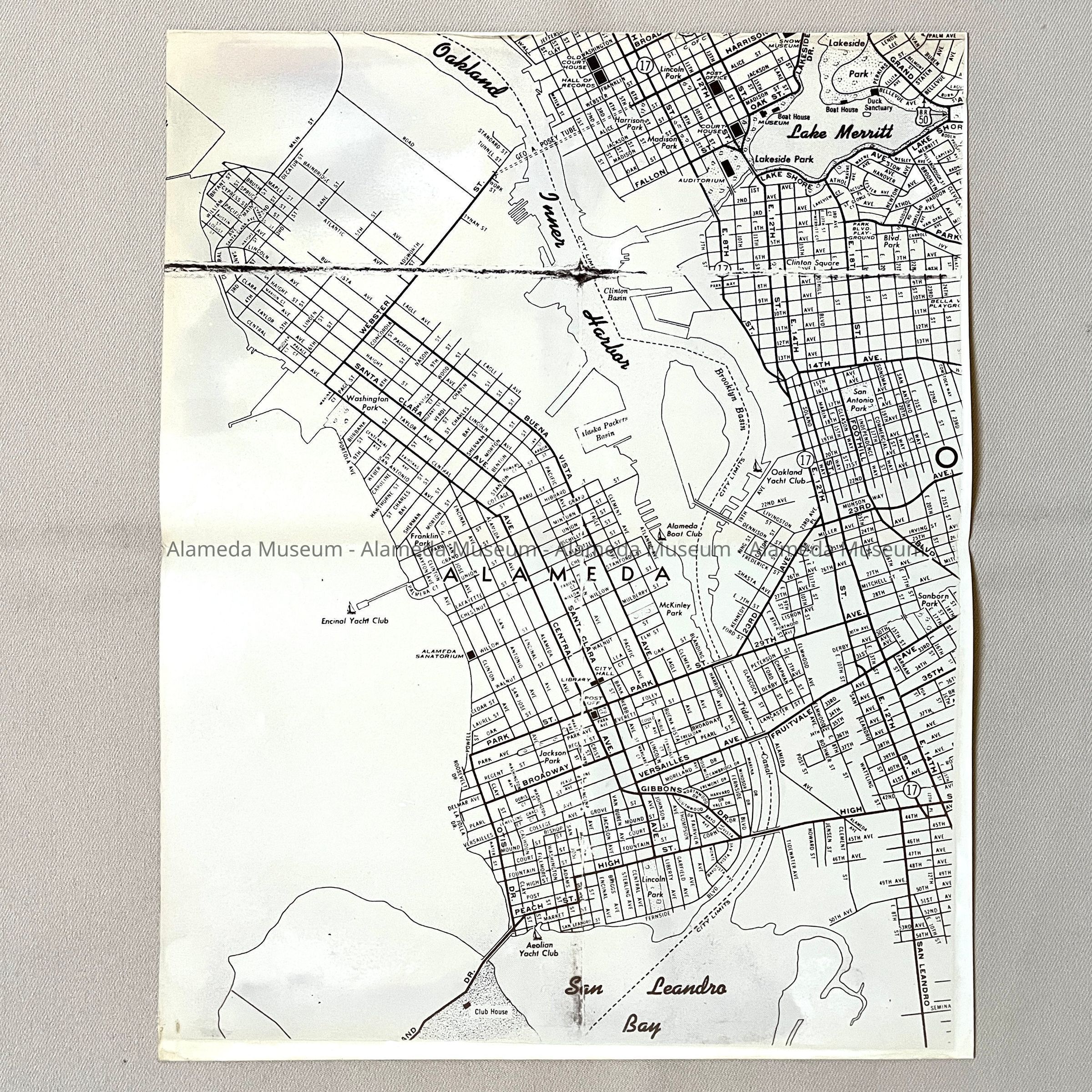 Description: a glossy off-white photocopy of a monochromatic map of Alameda and parts of Oakland. The original has a large tear, and lines where the image is faded. The waterways (Lake Merritt, Oakland Inner Harbor, San Leandro Bay) are labeled in a distinctive cursive font. Marked are also yachting clubs, landmarks like Parks, City Hall, the Library, and the Alameda Sanatorium, and the Alaska Packers Basin.